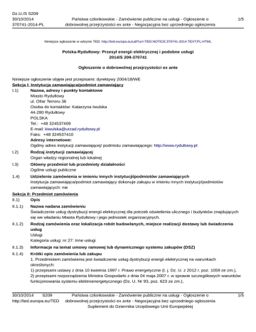Dz.U./S S209 30/10/2014 370741-2014-PL Państwa członkowskie - Zamówienie publiczne na usługi - Ogłoszenie o dobrowolnej przejrzystości ex ante - Negocjacyjna bez uprzedniego ogłoszenia 1/5 Niniejsze ogłoszenie w witrynie TED: http://ted.europa.eu/udl?uri=TED:NOTICE:370741-2014:TEXT:PL:HTML Polska-Rydułtowy: Przesył energii elektrycznej i podobne usługi 2014/S 209-370741 Ogłoszenie o dobrowolnej przejrzystości ex ante Niniejsze ogłoszenie objęte jest przepisami: dyrektywy 2004/18/WE Sekcja I: Instytucja zamawiająca/podmiot zamawiający I.1) Nazwa, adresy i punkty kontaktowe Miasto Rydułtowy ul. Ofiar Terroru 36 Osoba do kontaktów: Katarzyna Iwulska 44-280 Rydułtowy POLSKA Tel.: +48 324537409 E-mail: [email protected] Faks: +48 324537410 Adresy internetowe: Ogólny adres instytucji zamawiającej/ podmiotu zamawiającego: http://www.rydultowy.pl I.2) Rodzaj instytucji zamawiającej Organ władzy regionalnej lub lokalnej I.3) Główny przedmiot lub przedmioty działalności Ogólne usługi publiczne 1.4) Udzielenie zamówienia w imieniu innych instytucji/podmiotów zamawiających Instytucja zamawiająca/podmiot zamawiający dokonuje zakupu w imieniu innych instytucji/podmiotów zamawiających: nie Sekcja II: Przedmiot zamówienia II.1) Opis II.1.1) Nazwa nadana zamówieniu Świadczenie usług dystrybucji energii elektrycznej dla potrzeb oświetlenia ulicznego i budynków znajdujących się we władaniu Miasta Rydułtowy i jego jednostek organizacyjnych. II.1.2) Rodzaj zamówienia oraz lokalizacja robót budowlanych, miejsce realizacji dostawy lub świadczenia usług Usługi Kategoria usług: nr 27: Inne usługi II.1.3) Informacje na temat umowy ramowej lub dynamicznego systemu zakupów (DSZ) II.1.4) Krótki opis zamówienia lub zakupu 1. Przedmiotem zamówienia jest świadczenie usług dystrybucji energii elektrycznej na warunkach określonych: 1) przepisami ustawy z dnia 10 kwietnia 1997 r. Prawo energetyczne (t. j. Dz. U. z 2012 r. poz. 1059 ze zm.), 2) przepisami rozporządzenia Ministra Gospodarki z dnia 04 maja 2007 r. w sprawie szczegółowych warunków funkcjonowania systemu elektroenergetycznego (Dz. U. Nr 93, poz. 623 ze zm.), 30/10/2014 S209 http://ted.europa.eu/TED Państwa członkowskie - Zamówienie publiczne na usługi - Ogłoszenie o dobrowolnej przejrzystości ex ante - Negocjacyjna bez uprzedniego ogłoszenia Suplement do Dziennika Urzędowego Unii Europejskiej 1/5 Dz.U./S S209 30/10/2014 370741-2014-PL Państwa członkowskie - Zamówienie publiczne na usługi - Ogłoszenie o dobrowolnej przejrzystości ex ante - Negocjacyjna bez uprzedniego ogłoszenia 2/5 3) przepisami rozporządzenia Ministra Gospodarki z dnia 18 sierpnia 2011 r. w sprawie szczegółowych zasad kształtowania i kalkulacji taryf oraz rozliczeń w obrocie energią elektryczną (t. j Dz. U. z 2013 r. poz. 1200), 4) w koncesji Wykonawcy na dystrybucję energii elektrycznej wydanej przez Prezesa URE, 5) w Instrukcji Ruchu i Eksploatacji Sieci Dystrybucyjnej TAURON Dystrybucja GZE S.A., 6) w taryfie Wykonawcy, tj.: OSD, 7) w innych niż wymienione w pkt 1-6 aktach i regulaminach. 2. Świadczenie usług dystrybucji obejmuje w szczególności: 1) transport energii elektrycznej siecią dystrybucyjną Wykonawcy w celu dostarczenia energii elektrycznej w miejsca wskazane w załączniku nr 1 do zaproszenia, 2) utrzymanie ciągłości dostarczania energii elektrycznej oraz niezawodności jej dostarczania, 3) utrzymanie parametrów jakościowych energii elektrycznej. 3. Usługi, o których mowa w ust. 1-2, świadczone będą na potrzeby zasilania w energię elektryczną punktów poboru określonych w załączniku nr 1 do niniejszego zaproszenia. 4. Wykaz punktów pomiarowych oraz miejsc dostarczania energii elektrycznej do Zamawiającego i jej odbioru z sieci operatora systemu dystrybucyjnego, miejsca rozgraniczenia własności urządzeń i instalacji pomiędzy Zamawiającym a OSD, grupy przyłączeniowe oraz grupy taryfowe i moc umowną, a także podstawowe elementy instalacji Odbiorcy określa załącznik nr 1 do zaproszenia, 5. Dane dotyczące przedmiotu zamówienia: 1) roczne zużycie energii wynosi 1 630 712 kWh następujących taryfach C12b, C11, C21, G11, 2) łączna moc zamówiona wynosi 1251 kW, 3) liczba punktów poboru wynosi 118 szt. 6. Zamówienie będzie realizowane od dnia 1.1.2015 r. 7. Okres trwania umowy - czas nieoznaczony zgodnie z przepisem art. 143 ust. 1a ustawy Pzp. II.1.5) Wspólny Słownik Zamówień (CPV) 65300000 II.6) Informacje na temat Porozumienia w sprawie zamówień rządowych (GPA) II.2) Całkowita końcowa wartość zamówienia (zamówień) II.2.1) Całkowita końcowa wartość zamówienia (zamówień) Wartość: 1 152 269,42 PLN Bez VAT Sekcja IV: Procedura IV.1) Rodzaj procedury Negocjacyjna bez publikacji ogłoszenia o zamówieniu/uprzedniego ogłoszenia Uzasadnienie wyboru procedury negocjacyjnej bez uprzedniej publikacji ogłoszenia o zamówieniu w Dz.U.. UE zgodnie z art. 31 dyrektywy 2004/18/WE Roboty budowlane/towary/usługi mogą być zrealizowane lub dostarczone tylko przez określonego oferenta z przyczyn: technicznych Inne uzasadnienie udzielenia zamówienia bez uprzedniej publikacji ogłoszenia o zamówieniu w Dz.U.. UE Przedmiotem zamówienia są usługi wymienione w załączniku IIB do dyrektywy Zgodnie z przepisem art. 67 ust. 1 pkt 1 lit. a ustawy Pzp Zamawiający może udzielić zamówienia z wolnej ręki, jeżeli usługi mogą być świadczone tylko przez jednego Wykonawcę z przyczyn technicznych o obiektywnym charakterze. Przedmiotem zamówienia jest świadczenie usług dystrybucji energii elektrycznej. Po uwolnieniu rynku energii umożliwiono odbiorcy energii elektrycznej dokonanie swobodnego wyboru sprzedawcy. Realizacja tego uprawienia koresponduje z obowiązkiem przedsiębiorstwa energetycznego do 30/10/2014 S209 http://ted.europa.eu/TED Państwa członkowskie - Zamówienie publiczne na usługi - Ogłoszenie o dobrowolnej przejrzystości ex