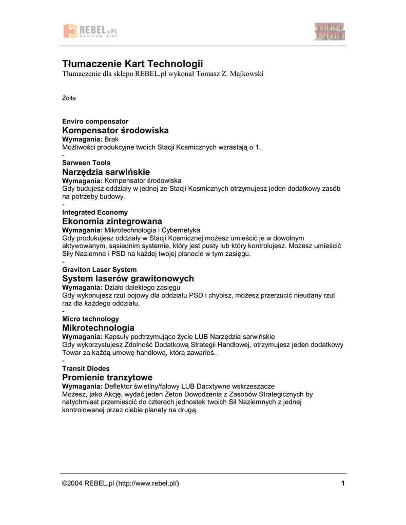 Tśumaczenie Kart Technologii T umaczenie dla sklepu REBEL.pl wykona Tomasz Z. Majkowski Z ożte Enviro compensator Kompensator s rodowiska Wymagania: Brak Moz liwos ci produkcyjne twoich Stacji Kosmicznych wzrastaja o 1. Sarween Tools Narzedzia sarwin skie Wymagania: Kompensator s rodowiska Gdy budujesz oddziaży w jednej ze Stacji Kosmicznych otrzymujesz jeden dodatkowy zasob na potrzeby budowy. Integrated Economy Ekonomia zintegrowana Wymagania: Mikrotechnologia i Cybernetyka Gdy produkujesz oddziaży w Stacji Kosmicznej moz esz umies cic je w dowolnym aktywowanym, sa siednim systemie, ktory jest pusty lub ktory kontrolujesz. Moz esz umies cic Siży Naziemne i PSD na kaz dej twojej planecie w tym zasiegu. Graviton Laser System System lasero w grawitonowych Wymagania: Dziażo dalekiego zasiegu Gdy wykonujesz rzut bojowy dla oddziażu PSD i chybisz, moz esz przerzucic nieudany rzut raz dla kaz dego oddziażu. Micro technology Mikrotechnologia Wymagania: Kapsuży podtrzymuja ce z ycie LUB Narzedzia sarwinskie Gdy wykorzystujesz Zdolnos c Dodatkowa Strategii Handlowej, otrzymujesz jeden dodatkowy Towar za kaz da umowe handlowa , ktora zawarżes . Transit Diodes Promienie tranzytowe Wymagania: Deflektor swietlny/falowy LUB Dacxtywne wskrzeszacze Moz esz, jako Akcje, wydac jeden Z eton Dowodzenia z Zasobow Strategicznych by natychmiast przemies cic do czterech jednostek twoich Siż Naziemnych z jednej kontrolowanej przez ciebie planety na druga . Ż 2004 REBEL.pl (http://www.rebel.pl/) 1 Czerwone Hylar V Assault Laser Laser Szturmowy Hylar V Wymagania: Brak Twoje Kra z owniki i Niszczyciele otrzymuja +1 do wszystkich rzutow bojowych. Deep Space Cannon Dziaśo dalekiego zasiegu Wymagania: Laser Szturmowy Hylar V Twoje PSD moga od tej pory ostrzeliwac flote nieprzyjaciela znajduja ca sie w sa siednim systemie. Assault Cannon Dziaśo Szturmowe Wymagania: Dziażo dalekiego zasiegu ORAZ Cybernetyka Przed rozpoczeciem Bitwy Gwiezdnej twoje Pancerniki, ktore biora w niej udziaż, moga oddac po jednym strzale. Trafienia rozstrzyga sie natychmiast, a zniszczone jednostki przeciwnika nie odpowiadaja ogniem. Magen Defense Grid System obronny Magen Wymagania: Dziażo dalekiego zasiegu Wszystkie twoje PSD otrzymuja +1 do rzutow bojowych. Ponadto, wszystkie twoje oddziaży Siż Naziemnych znajduja ce sie na planetach z PSD otrzymuja +1 do rzutow bojowych podczas Inwazji. War Sun Sśon ce Bojowe Wymagania: Dziażo dalekiego zasiegu ORAZ Narzedzia sarwinskie Moz esz produkowac Sżonca Bojowe. Graviton Negator Rozpraszacz grawitono w Wymagania: Dziażo szturmowe LUB Dacxtywne wskrzeszacze Twoje pancerniki moga bombardowac planety na ktorych znajduja sie PSD. Twoje Mys liwce moga brac udziaż w Inwazji. Ocalaże Mys liwce wracaja w przestrzen i nie moga ustanowic twojej kontroli nad planeta . - Ż 2004 REBEL.pl (http://www.rebel.pl/) 2 Niebieskie Antimass deflector Deflektor masy Wymagania: Brak Twoje statki moga przemieszczac sie przez Pola Asteroidow, nie moga jednak konczyc na nich ruchu. XRD Transporters Transporter XDR Wymagania: Deflektor masy Twoje Transportowce otrzymuja +1 do predkos ci. Light/wave deflector Deflektor s wieltny/falowy Wymagania: Transporter XRD ORAZ System obronny Magen Twoje statki moga przemieszczac sie przez systemy, w ktorych znajduja sie statki wroga i kontynuowac ruch, az do aktywowanego systemu. Type IV Drive Silnik IV generacji Wymagania: Transporter XRD ORAZ Motywator neuronowy Twoje Kra z owniki i Pancerniki otrzymuja +1 do predkosci. Advanced fighters Udoskonalone mys liwce Wymagania: Silnik IV generacji Twoje Mys liwce moga przemieszczac sie niezalez nie z predkos cia 2 i otrzymuja +1 do rzutow bojowych. Twoje Mys liwce nie musza byc utrzymywane przez Transportowce i Stacje Kosmiczne, a statki wroga nie moga przemieszczac sie przez systemy, w ktorych twoje Mys liwce sie znajduja . Kaz dy Mys liwiec przekraczaja cy żadownos c statkow znajduja cych sie w systemie odlicza sie od limitu Zaopatrzenia Floty. Fleet logistic Logistyka floty Wymagania: Rozpraszacz grawitonow Gdy wykonujesz Akcje Taktyczna moz esz wykonac dwie Akcje Taktyczne, jedna po drugiej, nim skonczy sie twoja tura. Ż 2004 REBEL.pl (http://www.rebel.pl/) 3 Zielone Stasis capsules Kapsuśy podtrzymujace z ycie Wymagania: Kompensator s rodowiska Twoje Kra z owniki i Pancerniki moga przewozic po jednym oddziale Siż Naziemnych. Cybernetics Cybernetyka Wymagania: Kapsuży podtrzymuja ce z ycie LUB Deflektor masy Twoje Mys liwce otrzymuja +1 do rzutow bojowych. Gen Synthesis Synteza genetyczna Wymagania: Cybernetyka Twoje Siży Naziemne otrzymuja +1 do rzutow bojowych podczas inwazji. Gdy nalez a cy do ciebie odziaż Siż Naziemnych zostaje zniszczony, rzuc kos cia : przy wyniku 5+ zostaje zamiast tego przeniesiony na planete w twoim Systemie Ojczystym. Neural Motivator Motywator neuronowy Wymagania: Kapsuży podtrzymuja ce z ycie LUB Mikrotechnologia Podczas kaz dej Fazy Statusu cia gniesz dodatkowa Karte Akcji. X-89 Bacterial Weapon Bron biologiczna X-89 Wymagania: Promienie tranzytowe LUB Dziażo szturmowe Twoje Pancerniki i Sżonca Bojowe moga uz yc tej opcji przed bombardowaniem. Natychmiast zniszcz wszystkie Siży Naziemne wroga na planecie. Nastepnie odrzuc wszystkie Karty Akcji. Dacxtive Animators Dacxtywne wskrzeszacze Wymagania: Motywator neuronowy Jes li zwyciez ysz w Inwazji, rzuc kos cia za kaz dy zabity oddziaż Siż Naziemnych (twoj oraz przeciwnika). Za kaz de 6+ umiesc na tej planecie jeden oddziaż Siż Naziemnych ze swoich uzupeżnien. Ż 2004 REBEL.pl (http://www.rebel.pl/) 4 Oferujemy dostawe do domu w 2 dni oraz dziesieciodniowa gwarancje moz liwos ci zwrotu zakupionych gier! Internetowy sklep z grami wszelkiego rodzaju oraz akcesoriami. Tylko u nas masz okazje przejrzec bogate galerie zdjec oferowanych produktow, przeczytac komentarze innych graczy i porozmawiac ze sprzedawca na Gadu-Gadu. • • • • • 261 gier planszowych i towarzyskich 170 polskich podrecznikow do RPG 240 angiels