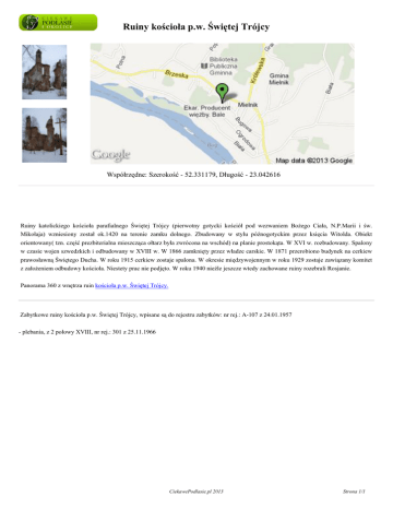Ruiny kościoła p.w. Świętej Trójcy Współrzędne: Szerokość - 52.331179, Długość - 23.042616 Ruiny katolickiego kościoła parafialnego Świętej Trójcy (pierwotny gotycki kościół pod wezwaniem Bożego Ciała, N.P.Marii i św. Mikołaja) wzniesiony został ok.1420 na terenie zamku dolnego. Zbudowany w stylu późnogotyckim przez księcia Witolda. Obiekt orientowany( tzn. część prezbiterialna mieszcząca ołtarz była zwrócona na wschód) na planie prostokąta. W XVI w. rozbudowany. Spalony w czasie wojen szwedzkich i odbudowany w XVIII w. W 1866 zamknięty przez władze carskie. W 1871 przerobiono budynek na cerkiew prawosławną Świętego Ducha. W roku 1915 cerkiew zostaje spalona. W okresie międzywojennym w roku 1929 zostaje zawiązany komitet z założeniem odbudowy kościoła. Niestety prac nie podjęto. W roku 1940 nieźle jeszcze wtedy zachowane ruiny rozebrali Rosjanie. Panorama 360 z wnętrza ruin kościoła p.w. Świętej Trójcy. Zabytkowe ruiny kościoła p.w. Świętej Trójcy, wpisane są do rejestru zabytków: nr rej.: A-107 z 24.01.1957 - plebania, z 2 połowy XVIII, nr rej.: 301 z 25.11.1966 CiekawePodlasie.pl 2013 Strona 1/1