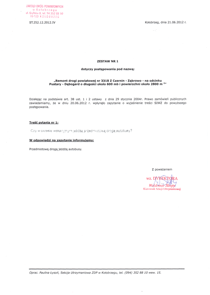 NARZĄD DRÓG POWIATOWYCH w Kołobrzegu ul. Gryfitćw 8, tel. 94 352 88 10 76-100 K O Ł O B R Z E G ST.252.12.2012.IV Kołobrzeg, dnia 21.06.2012 r. ZESTAW NR l dotyczy postępowania pod nazwą: „Remont drogi powiatowej nr 3318 Z Czernin - Ząbrowo - na odcinku Pustary - Dębogard o długości około 600 mb i powierzchni około 2800 m 2" Działając na podstawie art. 38 ust. l i 2 ustawy z dnia 29 stycznia 2004r. Prawo zamówień publicznych zawiadamiamy, że w dniu 20.06.2012 r. wpłynęło zapytanie o wyjaśnienie treści SIWZ do powyższego postępowania. Treść pytania nr 1 Czy * o«mst W odpowiedzi na zapytanie informujemy Przedmiotową drogą jeżdżą autobusy. Z poważaniem wz. DYTŚEKti .1. Kierownik Sekcji Ulr/.ymuniowej Oprać. Paulina Łysoń, Sekcja Utrzymań/owa ZDP w Kołobrzegu, tel, (094) 352 88 10 wew. 15.