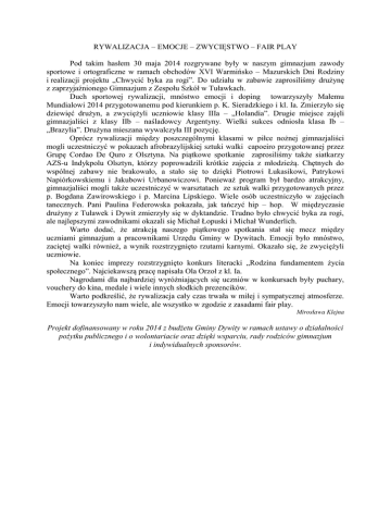 RYWALIZACJA – EMOCJE – ZWYCIĘSTWO – FAIR PLAY Pod takim hasłem 30 maja 2014 rozgrywane były w naszym gimnazjum zawody sportowe i ortograficzne w ramach obchodów XVI Warmińsko – Mazurskich Dni Rodziny i realizacji projektu „Chwycić byka za rogi”. Do udziału w zabawie zaprosiliśmy drużynę z zaprzyjaźnionego Gimnazjum z Zespołu Szkół w Tuławkach. Duch sportowej rywalizacji, mnóstwo emocji i doping towarzyszyły Małemu Mundialowi 2014 przygotowanemu pod kierunkiem p. K. Sieradzkiego i kl. Ia. Zmierzyło się dziewięć drużyn, a zwyciężyli uczniowie klasy IIIa – „Holandia”. Drugie miejsce zajęli gimnazjaliści z klasy IIb – naśladowcy Argentyny. Wielki sukces odniosła klasa Ib – „Brazylia”. Drużyna mieszana wywalczyła III pozycję. Oprócz rywalizacji między poszczególnymi klasami w piłce nożnej gimnazjaliści mogli uczestniczyć w pokazach afrobrazylijskiej sztuki walki capoeiro przygotowanej przez Grupę Cordao De Quro z Olsztyna. Na piątkowe spotkanie zaprosiliśmy także siatkarzy AZS-u Indykpolu Olsztyn, którzy poprowadzili krótkie zajęcia z młodzieżą. Chętnych do wspólnej zabawy nie brakowało, a stało się to dzięki Piotrowi Łukasikowi, Patrykowi Napiórkowskiemu i Jakubowi Urbanowiczowi. Ponieważ program był bardzo atrakcyjny, gimnazjaliści mogli także uczestniczyć w warsztatach ze sztuk walki przygotowanych przez p. Bogdana Zawirowskiego i p. Marcina Lipskiego. Wiele osób uczestniczyło w zajęciach tanecznych. Pani Paulina Federowska pokazała, jak tańczyć hip – hop. W międzyczasie drużyny z Tuławek i Dywit zmierzyły się w dyktandzie. Trudno było chwycić byka za rogi, ale najlepszymi zawodnikami okazali się Michał Łopuski i Michał Wunderlich. Warto dodać, że atrakcją naszego piątkowego spotkania stał się mecz między uczniami gimnazjum a pracownikami Urzędu Gminy w Dywitach. Emocji było mnóstwo, zaciętej walki również, a wynik rozstrzygnięto rzutami karnymi. Okazało się, że zwyciężyli uczniowie. Na koniec imprezy rozstrzygnięto konkurs literacki „Rodzina fundamentem życia społecznego”. Najciekawszą pracę napisała Ola Orzoł z kl. Ia. Nagrodami dla najbardziej wyróżniających się uczniów w konkursach były puchary, vouchery do kina, medale i wiele innych słodkich prezencików. Warto podkreślić, że rywalizacja cały czas trwała w miłej i sympatycznej atmosferze. Emocji towarzyszyło nam wiele, ale wszystko w zgodzie z zasadami fair play. Mirosława Klejna Projekt dofinansowany w roku 2014 z budżetu Gminy Dywity w ramach ustawy o działalności pożytku publicznego i o wolontariacie oraz dzięki wsparciu, rady rodziców gimnazjum i indywidualnych sponsorów.