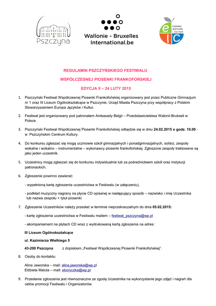REGULAMIN PSZCZYŃSKIEGO FESTIWALU WSPÓŁCZESNEJ PIOSENKI FRANKOFOŃSKIEJ EDYCJA II – 24 LUTY 2015 1. Pszczyński Festiwal Współczesnej Piosenki Frankofońskiej organizowany jest przez Publiczne Gimnazjum nr 1 oraz III Liceum Ogólnokształcące w Pszczynie, Urząd Miasta Pszczyna przy współpracy z Polskim Stowarzyszeniem Europa Języków i Kultur. 2. Festiwal jest organizowany pod patronatem Ambasady Belgii – Przedstawicielstwa Walonii-Brukseli w Polsce. 3. Pszczyński Festiwal Współczesnej Piosenki Frankofońskiej odbędzie się w dniu 24.02.2015 o godz. 10.00 w Pszczyńskim Centrum Kultury. 4. Do konkursu zgłaszać się mogą uczniowie szkół gimnazjalnych i ponadgimnazjalnych, soliści, zespoły wokalne i wokalno – instrumentalne – wykonawcy piosenki frankofońskiej. Zgłoszone zespoły traktowane są jako jeden uczestnik. 5. Uczestnicy mogą zgłaszać się do konkursu indywidualnie lub za pośrednictwem szkół oraz instytucji patronackich. 6. Zgłoszenie powinno zawierać: - wypełnioną kartę zgłoszenia uczestnictwa w Festiwalu (w załączeniu), - podkład muzyczny nagrany na płycie CD opisanej w następujący sposób – nazwisko i imię Uczestnika lub nazwa zespołu + tytuł piosenki 7. Zgłoszenie Uczestników należy przesłać w terminie nieprzekraczalnym do dnia 05.02.2015: - kartę zgłoszenia uczestnictwa w Festiwalu mailem – [email protected] - akompaniament na płytach CD wraz z wydrukowaną kartą zgłoszenia na adres: III Liceum Ogólnokształcące ul. Kazimierza Wielkiego 5 43-200 Pszczyna z dopiskiem „Festiwal Współczesnej Piosenki Frankofońskiej”. 8. Osoby do kontaktu: Alina Jaworska – mail: [email protected] Elżbieta Matula – mail: [email protected] 9. Przesłanie zgłoszenia jest równoznaczne ze zgodą Uczestnika na wykorzystanie jego zdjęć i nagrań dla celów promocji Festiwalu i Organizatorów. 10. Wykonawcy zgłaszający się do udziału w konkursie zobowiązani są do wyboru i przygotowania jednej z piosenek, których tytuły opublikowane zostały na stronie www.frankofonia.pl; każdy utwór może być wybrany tylko jeden raz; po jego wyborze - utwór zostaje usunięty z listy. Po wybraniu piosenki, należy jak najszybciej potwierdzić mailowo jej wybór u organizatorów. 11. Każdy Uczestnik (solista, duet, zespół) prezentuje dany utwór w wybranej formie i choreografii z przygotowanym przez siebie akompaniamentem, np. gitara, podkład z płyty CD. 12. W trakcie przesłuchań konkursowych oraz w trakcie Koncertu Finałowego, Uczestnicy będą prezentowali przygotowane przez siebie utwory w kolejności ustalonej przez Organizatorów. 13. Szczegółowy scenariusz i kolejność występów zostaną opracowane i przesłane Uczestnikom i opiekunom drogą mailową do dnia 10.02.2015r; zostaną one również umieszczone na stronie www.frankofonia.pl w zakładce "KONKURSY" 14. Organizator zapewnia Uczestnikom sprzęt nagłaśniający z odtwarzaczem CD i mikrofonami; organizacja innych instrumentów i sprzętu niezbędnego do ich nagłośnienia pozostaje w gestii Uczestników. 15. Prezentacje konkursowe oceniać będzie zaproszone przez Organizatorów Festiwalu Jury. 16. Przy ocenie będą brane pod uwagę: - indywidualność sceniczna - walory głosowe - poprawność językowa 17. W wyniku przesłuchań Jury wyłoni zwycięzców: I, II i III miejsce. 18. Przebieg obrad Jury odbywa się w formie niejawnej; Organizatorzy nie udzielają żadnych informacji na temat szczegółów przebiegu obrad Jury. 19. Decyzje Jury Festiwalowego są nieodwołalne i nie podlegają procedurom odwoławczym. 20. Uczestnicy nieznający tekstu, odmawiający występu lub powodujący opóźnienia w trwaniu Festiwalu podlegają dyskwalifikacji. 21. Organizator nie pokrywa kosztów poniesionych przez Uczestników w związku z udziałem w Festiwalu. 22. Organizator zastrzega sobie, z przyczyn technicznych lub losowych, możliwość dokonywania zmian w regulaminie. 23. Organizator zastrzega sobie możliwość anulowania Festiwalu w przypadku okoliczności uniemożliwiających jego przeprowadzenie. Serdecznie zapraszamy do wzięcia udziału w Festiwalu !!! Życzymy miłej przygody z piosenką frankofońską !!! Organizatorzy