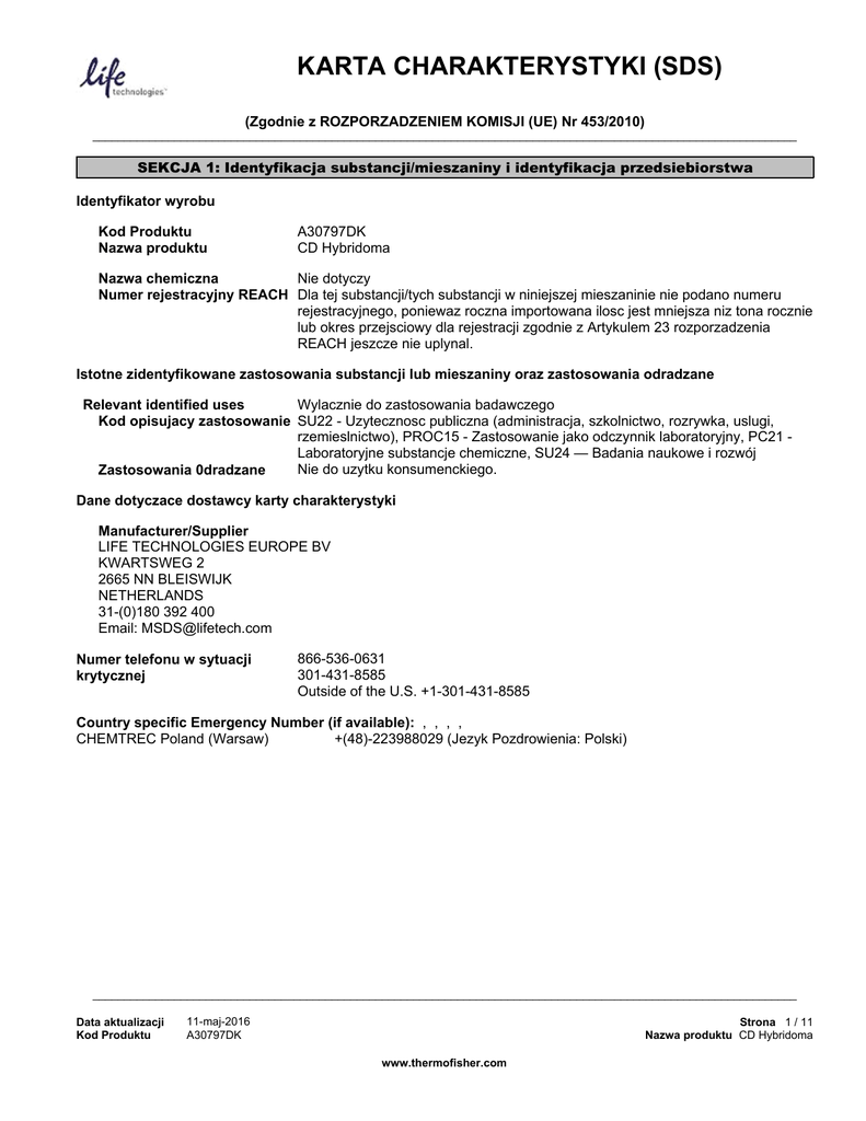 KARTA CHARAKTERYSTYKI (SDS) (Zgodnie z ROZPORZADZENIEM KOMISJI (UE) Nr 453/2010) ________________________________________________________________________________________________________________ SEKCJA 1: Identyfikacja substancji/mieszaniny i identyfikacja przedsiebiorstwa Identyfikator wyrobu Kod Produktu Nazwa produktu A30797DK CD Hybridoma Nie dotyczy Nazwa chemiczna Numer rejestracyjny REACH Dla tej substancji/tych substancji w niniejszej mieszaninie nie podano numeru rejestracyjnego, poniewaz roczna importowana ilosc jest mniejsza niz tona rocznie lub okres przejsciowy dla rejestracji zgodnie z Artykulem 23 rozporzadzenia REACH jeszcze nie uplynal. Istotne zidentyfikowane zastosowania substancji lub mieszaniny oraz zastosowania odradzane Wylacznie do zastosowania badawczego Relevant identified uses Kod opisujacy zastosowanie SU22 - Uzytecznosc publiczna (administracja, szkolnictwo, rozrywka, uslugi, rzemieslnictwo), PROC15 - Zastosowanie jako odczynnik laboratoryjny, PC21 Labor at or yj nesubst ancj echemi czne,SU24— Badani anaukoweir ozwój Nie do uzytku konsumenckiego. Zastosowania 0dradzane Dane dotyczace dostawcy karty charakterystyki Manufacturer/Supplier LIFE TECHNOLOGIES EUROPE BV KWARTSWEG 2 2665 NN BLEISWIJK NETHERLANDS 31-(0)180 392 400 Email: [email protected] Numer telefonu w sytuacji krytycznej 866-536-0631 301-431-8585 Outside of the U.S. +1-301-431-8585 Country specific Emergency Number (if available): , , , , CHEMTREC Poland (Warsaw) +(48)-223988029 (Jezyk Pozdrowienia: Polski) ________________________________________________________________________________________________________________ Data aktualizacji Kod Produktu 11-maj-2016 A30797DK Strona 1 / 11 Nazwa produktu CD Hybridoma www.thermofisher.com SEKCJA 2: Identyfikacja zagrozen Klasyfikacja substancji lub mieszaniny Klasyfikacja zgodna z Regulacja (WE) nr 1272/2008 (CLP) Zagrozenia fizyczne Nie klasyfikowany Zagrozenia dla zdrowia Nie klasyfikowany Zagrozenia dla srodowiska Nie klasyfikowany Additional information Nie dotyczy Skladniki etykiety Etykietowanie zgodne z Regulacja (WE) nr 1272/2008 (CLP) Piktogramy oznaczajace zagrozenie Brak piktogramu Haslo Ostrzegawcze Zaden(-a,-e) zwroty wskazujace na rodzaj zagrozenia Nie dotyczy zwroty wskazujace na srodki ostroznosci Nie dotyczy zwroty wskazujace na srodki ostroznosci Nie dotyczy Zapobieganie Nie dotyczy Response Nie dotyczy Storage Nie dotyczy Utylizacja Nie dotyczy Inne zagrozenia Ta mieszanina nie zawiera zadnych substancji ocenianych jako PBT lub vPvB. ________________________________________________________________________________________________________________ Data aktualizacji Kod Produktu 11-maj-2016 A30797DK Strona 2 / 11 Nazwa produktu CD Hybridoma www.thermofisher.com SEKCJA 3: Sklad/informacja o skladnikach Component Nr CAS Nr EINECS Procent wagowy Numer rejestracyjny REACH AMMONIUM Compound ( <0.01 ) BARIUM Compound ( <0.01 ) SILVER Compound ( <0.01 ) Tin Compound ( <0.01 ) Sodium selenite 10102-18-8 ( <0.00011 ) - Not Listed <0.01 - Classification according to Regulation (EC) No 1272/2008 [CLP] - - Listed <0.01 - Not Listed <0.01 01-2119502547-42-X XXX - Acute Tox. 3 - H301 Acute Tox. 4 - H332 Nie klasyfikowany - Not Listed <0.01 - - 10102-18-8 - <0.00011 01-2119985427-23-X XXX Acute Tox. 2 H300Tox. 2 H330Irrit. 2 - H315Irrit. 2 - H319Sens. 1 H317Chronic 2 - H411 SEKCJA 4: Srodki pierwszej pomocy Opis srodków pierwszej pomocy Przeplukac duza iloscia wody. Nie ma koniecznosci zasiegniecia natychmiastowej pomocy medycznej. Ostroznie plukac woda przez kilka minut. Zdjac soczewki kontaktowe w przypadku ich noszenia, jesli ich zdjecie jest latwe. W przewidzianych warunkach normalnego uzycia nie powinno wystapic znaczace niebezpieczenstwo spozycia. Jesli czujesz sie zle, skorzystaj z porady lekarskiej. W przewidzianych warunkach normalnego uzycia tego materialu nie powinno wystapic niebezpieczenstwo wdychania. W razie koniecznosci skontaktuj sie z lekarzem. Leczyc objawowo. Kontakt ze skóra Kontakt z oczyma SPOZYCIE Wdychanie Uwagi dla lekarza Najwazniejsze objawy i dzialania, zarówno ostre i opóznione Nie dotyczy. Wskazanie ewentualnej koniecznosci bezzwlocznej pomocy medycznej i leczenia specjalnego Zaden(-a,-e). SEKCJA 5: Postepowanie w przypadku pozaru Srodki gasnicze Rozpylona woda. Dwutlenek wegla (CO2). Piana. Sucha substancja chemiczna. Brak danych. Odpowiednie srodki gasnicze Nieodpowiednie srodki gasnicze Szczególne zagrozenia zwiazane z substancja lub mieszanina Nieznane. Wskazówki dla strazy pozarnej Standardowa procedura w przypadku pozarów substancji chemicznych. ________________________________________________________________________________________________________________ Data aktualizacji Kod Produktu 11-maj-2016 A30797DK Strona 3 / 11 Nazwa produktu CD Hybridoma www.thermofisher.com SEKCJA 6: Postepowanie w przypadku niezamierzonego uwolnienia do srodowiska Indywidualne srodki ostroznosci, wyposazenie ochronne i procedury w sytuacjach awaryjnych Zapewnic odpowiednia wentylacje. Zawsze nosic zalecany osobisty sprzet ochronny. Stosowac wyposazenie ochrony indywidualnej. Wiecej szczególów znajduje sie w Czesci 8. Srodki ostroznosci w zakresie ochrony srodowiska Brak szczególnych wymagan co do ochrony srodowiska. Metody i materialy zapobiegajace rozprzestrzenianiu sie skazenia i sluzace do usuwania skazenia Zanurzyc w obojetnym srodku absorbujacym. Odniesienia do innych sekcji Patrz sekcja 8 po dalsze informacje. SEKCJA 7: Postepowanie z substancjami i mieszaninami oraz ich magazynowanie Srodki ostroznosci dotyczace bezpiecznego postepowania Stosowac wymagane srodki ochrony indywidualnej. . Warunki bezpiecznego magazynowania, lacznie z informacjami dotyczacymi wszelkich wzajemnych niezgodnosci Trzymac w suchym, chlodnym i dobrze wentylowanym miejscu. Przechowywac w odpowiednio oznaczonych pojemnikach. Szczególne zastosowanie(-a) koncowe Wylacznie do zastosowania badawczego. __________________________________________________