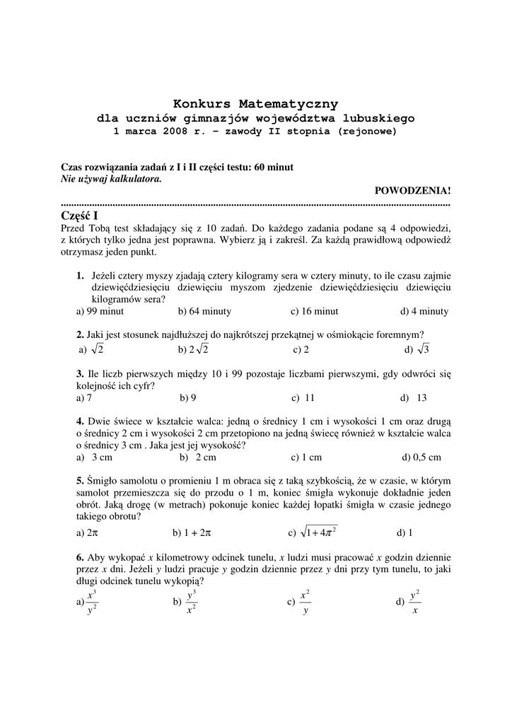 Konkurs Matematyczny dla uczniów gimnazjów województwa lubuskiego 1 marca 2008 r. – zawody II stopnia (rejonowe) Czas rozwiązania zadań z I i II części testu: 60 minut Nie uŜywaj kalkulatora. POWODZENIA! ....................................................................................................................................................... Część I Przed Tobą test składający się z 10 zadań. Do kaŜdego zadania podane są 4 odpowiedzi, z których tylko jedna jest poprawna. Wybierz ją i zakreśl. Za kaŜdą prawidłową odpowiedź otrzymasz jeden punkt. 1. JeŜeli cztery myszy zjadają cztery kilogramy sera w cztery minuty, to ile czasu zajmie dziewięćdziesięciu dziewięciu myszom zjedzenie dziewięćdziesięciu dziewięciu kilogramów sera? a) 99 minut b) 64 minuty c) 16 minut d) 4 minuty 2. Jaki jest stosunek najdłuŜszej do najkrótszej przekątnej w ośmiokącie foremnym? a) 2 b) 2 2 c) 2 d) 3 3. Ile liczb pierwszych między 10 i 99 pozostaje liczbami pierwszymi, gdy odwróci się kolejność ich cyfr? a) 7 b) 9 c) 11 d) 13 4. Dwie świece w kształcie walca: jedną o średnicy 1 cm i wysokości 1 cm oraz drugą o średnicy 2 cm i wysokości 2 cm przetopiono na jedną świecę równieŜ w kształcie walca o średnicy 3 cm . Jaka jest jej wysokość? a) 3 cm b) 2 cm c) 1 cm d) 0,5 cm 5. Śmigło samolotu o promieniu 1 m obraca się z taką szybkością, Ŝe w czasie, w którym samolot przemieszcza się do przodu o 1 m, koniec śmigła wykonuje dokładnie jeden obrót. Jaką drogę (w metrach) pokonuje koniec kaŜdej łopatki śmigła w czasie jednego takiego obrotu? a) 2π b) 1 + 2π c) 1 + 4π 2 d) 1 6. Aby wykopać x kilometrowy odcinek tunelu, x ludzi musi pracować x godzin dziennie przez x dni. JeŜeli y ludzi pracuje y godzin dziennie przez y dni przy tym tunelu, to jaki długi odcinek tunelu wykopią? x3 y3 x2 y2 a) 2 b) 2 c) d) y x y x 7. Czworokąt ABCD jest kwadratem. M jest środkiem BC, a N jest środkiem AD. Okrąg o środku N przechodzący przez M przecina CD w punkcie P. Ile stopni ma kąt PNM? a)150 b) 300 c) 450 d) 600 8. Które z następujących zdarzeń jest najbardziej prawdopodobne? a) w jednokrotnym rzucie kostką sześcienną wypadnie szóstka b) pierwszą kartą wyciągniętą z talii 52 kart będzie król albo królowa c) w rzucie równocześnie trzema monetami wypadną trzy orły d) wybrana losowo liczba całkowita będzie wielokrotnością liczby 5 9. Roczne zmiany wydajności pewnej uprawy w ciągu czterech lat przedstawiają się następująco: wzrost o 25%, potem spadek o 25%, potem znów spadek o 25% i wreszcie wzrost o 25%. Jaka była łączna (na przestrzeni czterech lat) zmiana wydajności tej uprawy? a) spadek o około 1% c) spadek o około 12 % b) 0% - bez zmian d) wzrost o około 1% 10. Jaką ma wartość tangens kąta α, jaki z osią odciętych tworzy prosta o równaniu: y + x = 2x + 6 ? 1 3 a) 1 b) 3 c) d) 3 3 ................................................................................................................................................. Część II Przed Tobą 2 zadania z treścią. RozwiąŜ je, dokładnie zapisując swoje rozwiązania. Starannie wykonuj rysunki. Zadanie 1. (0 – 5 punktów) W liczbach całkowitych x i y rozwiąŜ równanie: 2 xy = x + y + 1. Zadanie 2. (0 – 5 punktów) W trójkąt równoboczny o boku a wpisano koło K. Oblicz pole koła stycznego zewnętrznie do koła K i do dwóch boków trójkąta. Wykonaj rysunek. Tu zapisuj rozwiązania zadań z części II: