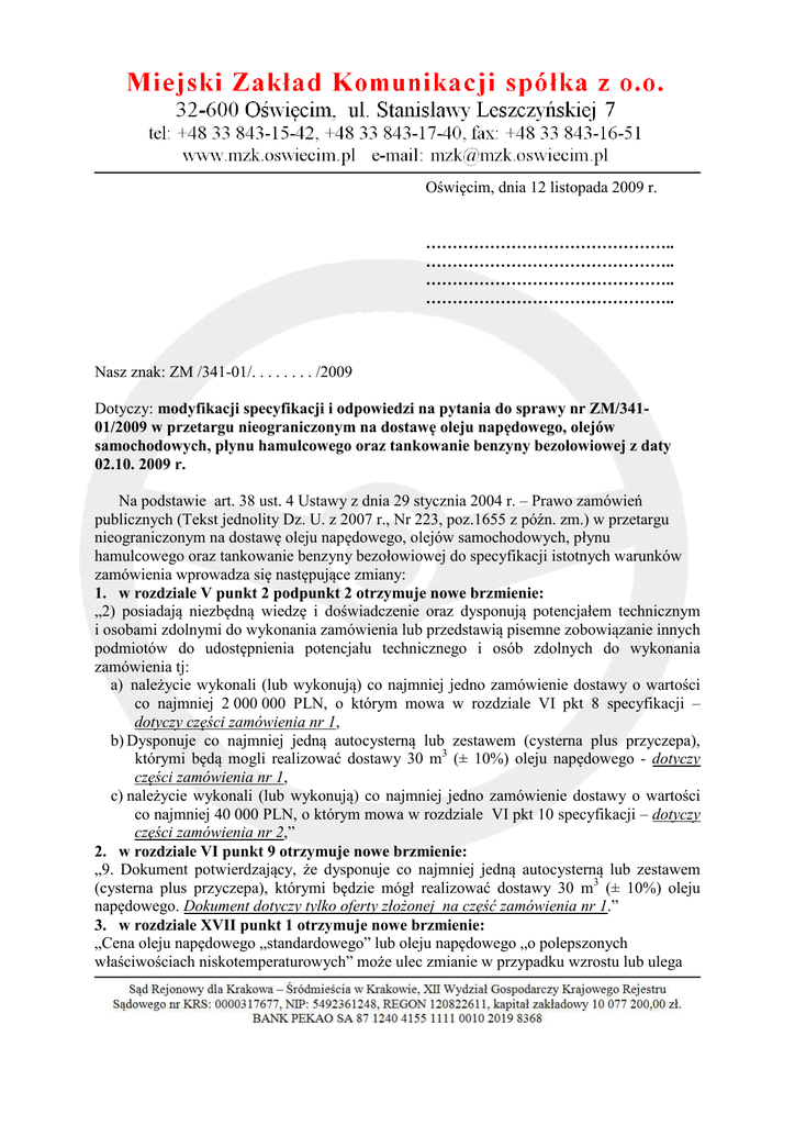 Oświęcim, dnia 12 listopada 2009 r. ……………………………………….. ……………………………………….. ……………………………………….. ……………………………………….. Nasz znak: ZM /341-01/. . . . . . . . /2009 Dotyczy: modyfikacji specyfikacji i odpowiedzi na pytania do sprawy nr ZM/34101/2009 w przetargu nieograniczonym na dostawę oleju napędowego, olejów samochodowych, płynu hamulcowego oraz tankowanie benzyny bezołowiowej z daty 02.10. 2009 r. Na podstawie art. 38 ust. 4 Ustawy z dnia 29 stycznia 2004 r. – Prawo zamówień publicznych (Tekst jednolity Dz. U. z 2007 r., Nr 223, poz.1655 z późn. zm.) w przetargu nieograniczonym na dostawę oleju napędowego, olejów samochodowych, płynu hamulcowego oraz tankowanie benzyny bezołowiowej do specyfikacji istotnych warunków zamówienia wprowadza się następujące zmiany: 1. w rozdziale V punkt 2 podpunkt 2 otrzymuje nowe brzmienie: „2) posiadają niezbędną wiedzę i doświadczenie oraz dysponują potencjałem technicznym i osobami zdolnymi do wykonania zamówienia lub przedstawią pisemne zobowiązanie innych podmiotów do udostępnienia potencjału technicznego i osób zdolnych do wykonania zamówienia tj: a) należycie wykonali (lub wykonują) co najmniej jedno zamówienie dostawy o wartości co najmniej 2 000 000 PLN, o którym mowa w rozdziale VI pkt 8 specyfikacji – dotyczy części zamówienia nr 1, b) Dysponuje co najmniej jedną autocysterną lub zestawem (cysterna plus przyczepa), którymi będą mogli realizować dostawy 30 m3 (± 10%) oleju napędowego - dotyczy części zamówienia nr 1, c) należycie wykonali (lub wykonują) co najmniej jedno zamówienie dostawy o wartości co najmniej 40 000 PLN, o którym mowa w rozdziale VI pkt 10 specyfikacji – dotyczy części zamówienia nr 2,” 2. w rozdziale VI punkt 9 otrzymuje nowe brzmienie: „9. Dokument potwierdzający, że dysponuje co najmniej jedną autocysterną lub zestawem (cysterna plus przyczepa), którymi będzie mógł realizować dostawy 30 m3 (± 10%) oleju napędowego. Dokument dotyczy tylko oferty złożonej na część zamówienia nr 1.” 3. w rozdziale XVII punkt 1 otrzymuje nowe brzmienie: „Cena oleju napędowego „standardowego” lub oleju napędowego „o polepszonych właściwościach niskotemperaturowych” może ulec zmianie w przypadku wzrostu lub ulega zmianie w przypadku obniżki cen oleju napędowego „Ekodiesel” dokonanej przez PKN Orlen i obowiązującej w dniu dostawy, pomnożonej przez współczynnik korygujący. Współczynnik korygujący cenę jest to stosunek ceny ofertowej wykonawcy oleju napędowego „standardowego” lub oleju napędowego „o polepszonych właściwościach niskotemperaturowych” do ceny PKN Orlen obowiązującej w dniu 30 listopada 2009 roku, wyliczony z dokładnością do czterech miejsc po przecinku.” 4. w rozdziale XIX część zamówienia nr 1 otrzymuje nowe brzmienie: „Część zamówienia nr 1 Sukcesywna dostawa cysternami samochodowymi oleju napędowego w ilości 780 m3, w tym oleju napędowego „standardowego” w ilości 660 m3 i oleju napędowego „ o polepszonych właściwościach niskotemperaturowych” w ilości 120 m3. Olej napędowy należy dostarczyć do magazynu zamawiającego w Oświęcimiu ul. St. Leszczyńskiej 7. Olej napędowy powinien odpowiadać Polskiej Normie: PN – EN 590; 2009 „Paliwa do pojazdów samochodowych – Oleje napędowe – wymagania i metody badań” oraz Rozporządzeniu Ministra Gospodarki i Pracy w sprawie wymagań jakościowych dla paliw ciekłych z dnia 09 grudnia 2008 r. (Dz. U. nr 221, poz. 1441) Każda dostawa oleju napędowego powinna posiadać każdorazowo świadectwo jakości i dowód nalewu paliwa. Dokumenty te powinny być zgodne z aktualnie obowiązującymi przepisami w tym zakresie. Zamawiający zastrzega sobie możliwość dokonywania kontroli jakości dostarczonego oleju napędowego poprzez wykonanie, na koszt i po uprzednim zawiadomieniu dostawcy, badań w niezależnym laboratorium akredytowanym przez Polskie Centrum Akredytacji. Regularne pobieranie próbek dostarczanego oleju napędowego do badań będzie następować zgodnie z PN ISO 3170:1993. W przypadku stwierdzenia zanieczyszczeń w dostarczonym oleju napędowym w trakcie przyjmowania dostawy tj. podczas pobierania próbek: 1) kierownik działu zaopatrzenia, zamówień publicznych i zespołu magazynów natychmiast wstrzyma rozładunek; 2) kierownik działu zaopatrzenia, zamówień publicznych i zespołu magazynów, pracownik magazynu i przedstawiciel dostawcy zamieszczą informację o tym fakcie w protokole komisyjnego pobrania próbek, którego kopię przekażą dostawcy faksem; 3) za dostawę zanieczyszczonego oleju napędowego faktura VAT nie zostanie wystawiona; 4) w terminie 24 godzin od przekazania kopii protokołu, o którym mowa wyżej, dostawca dostarczy olej napędowy o właściwych parametrach i we właściwej ilości. W przypadku stwierdzenia, że dostarczona ilość oleju napędowego uwzględniając graniczne błędy określone w Rozporządzeniu Ministra Gospodarki, Pracy i Polityki Społecznej z dnia 2 kwietnia 2004 roku w sprawie wymagań metrologicznych, którymi powinny odpowiadać przyrządy pomiarowe do dynamicznego pomiaru objętości lub masy cieczy innych niż woda (Dz..U. z 2004; nr 77 poz.731) oraz Rozporządzenie Ministra Gospodarki, Pracy i Polityki Społecznej z dnia 15 kwietnia 2004 roku w sprawie wymagań metrologicznych, którymi powinny odpowiadać zbiorniki pomiarowe, które określają błędy graniczne urządzeń pomiarowych w postaci zbiornika jak i liczników pomiarowych (Dz.U. z 2004; nr 85 poz.800) nie odpowiada ilości podanej w zamówieniu szczegółowym: 1) kierownik działu zaopatrzenia, zamówień publicznych i zespołu magazynów, pracownik magazynu i przedstawiciel dostawcy określą przyczyny zaistniałej sytuacji i zamieszczą informację o tym fakcie w sporządzony