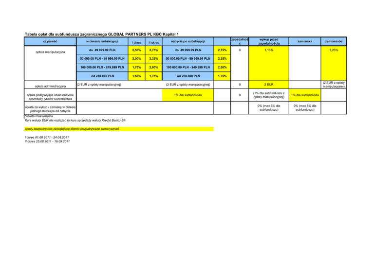 Tabela opłat dla subfunduszu zagranicznego GLOBAL PARTNERS PL KBC Kapital 1 czynność opłata manipulacyjna opłata administracyjna wykup przed zapadalnością 0 1,15% 1,25% (2 EUR z opłaty manipulacyjnej) 0 2 EUR (2 EUR z opłaty manipulacyjnej) 1% dla subfunduszu 0 (1% dla subfunduszu z opłaty manipulacyjnej) 1% dla subfunduszu 0% (max 5% dla subfunduszu) 0% (max 5% dla subfunduszu) I okres II okres nabycia po subskrypcji do 49 999.99 PLN 2,50% 2,75% do 49 999.99 PLN 2,75% 50 000.00 PLN - 99 999.99 PLN 2,00% 2,25% 50 000.00 PLN - 99 999.99 PLN 2,25% 100 000.00 PLN - 249.999 PLN 1,75% 2,00% 100 000.00 PLN - 249.999 PLN 2,00% od 250.000 PLN 1,50% 1,75% od 250.000 PLN 1,75% (2 EUR z opłaty manipulacyjnej) opłata pokrywająca koszt nabycia/ sprzedaży tytułów uczestnictwa opłata za wykup / zamianę w okresie jednego miesiąca od nabycia *opłata maksymalna Kurs waluty EUR dla rozliczeń to kurs sprzedaży waluty Kredyt Banku SA opłaty bezpośrednio obciążające klienta (rozpatrywane sumarycznie) I okres 01.08.2011 - 24.08.2011 II okres 25.08.2011 - 16.09.2011 zapadalnoś ć w okresie subskrypcji zamiana z zamiana do