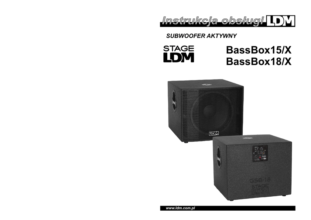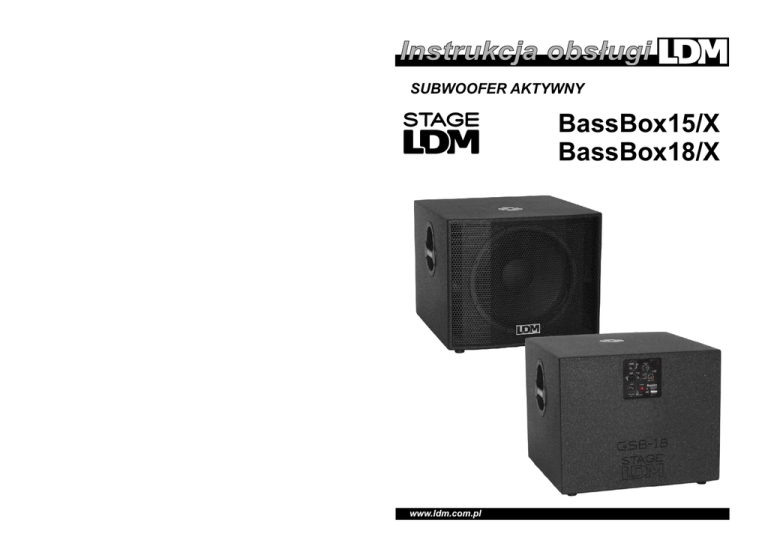 Instrukcja obs³ugi SUBWOOFER AKTYWNY BassBox15/X BassBox18/X www.ldm.com.pl GNIAZDA I ELEMENTY STERUJ¥CE - Po zakoñczeniu u¿ytkowania subwoofera nale¿y wyciszyæ g³oœnoœæ regulatorem MASTER VOLUME (3) i wy³¹czyæ urz¹dzenie przyciskiem ON (6). Szanownym Klientom ¿yczymy zadowolenia z naszego wyrobu . LDM Electronic 10 Uwaga! Z powodu dokonywanych ulepszeñ szczegó³owe dane techniczne oraz konstrukcja urz¹dzenia mog¹ ulec zmianie. HIGH RANGE BAL. OUTPUT B B 2 9 TO MID-HI UNIT BASS CUT 90 120 80 1 140 70 3 60 BAL. LINE BAL. INPUT 160 180 POW AMPS LIMITERS POWER ON - PROTECT LINE LINK B 8 Producent: LDM Electronic ul. Olszewska 35, 09 - 300 ¯uromin tel. 023 657 32 42, fax 023 657 22 37 100 Hz FULL RANGE INPUT 2 B 1 2 B BASS BOOST 1 4 3 5 2 6 PHASE INVERT 8 1 0 9 10 BASS LEVEL 7 NOTATKI 7 2 3 3 E-mail:[email protected], [email protected] Zapraszamy na nasz¹ stronê internetow¹: www.ldm.com.pl 1 3 4 MAINS POWER 6 BassBox ACTIVE SYSTEM LDM Electronic Use only with a 250V fuse SERIAL No. Employer uniquement avec un fusible de 250V 6,3 A [230v] MADE IN EU 5 2 7 1. OPIS ELEMENTÓW SYSTEMU 4. DANE TECHNICZNE MODEL BassBox15/X BassBox18/X Moc wyjœciowa (RMS) 800WRMS 1000WRMS Pasmo przenoszenia [Hz] 38 - 180* 34 - 180* Efektywnoœæ SPLmax [dB] 131 131 Impedancja 8Ù 8Ù Combo (XLR/Jack) LINE INPUT XLR LINK OUTPUT XLR MID-HI OUT Wejœcia/wyjœcia Wymiary S x W x G [mm] 535x457x535 640x540x640 32,5 43 Waga [kg] *Górna granica pasma regulowana w zakresie 60 - 180 Hz 5. INSTALACJA I POD£¥CZENIE URZ¥DZENIA - Po³o¿yæ kolumnê bezpoœrednio na pod³odze w pozycji poziomej lub pionowej; - Pod³¹czyæ za pomoc¹ przewodu sieciowego urz¹dzenie z sieci¹ energetyczn¹ 230V/50Hz; - W³¹czyæ zasilanie w³¹cznikiem ON (5); Uwaga! Zgaœniêcie podœwietlenia prze³¹cznika informuje o przepaleniu siê bezpiecznika. - Po za³¹czeniu zasilania subwoofer zaczyna prawid³owo pracowaæ po up³ywie ok. 5 sekund; Uwaga! Urz¹dzenie posiada uk³ad zabezpieczaj¹cy, który od³¹cza g³oœniki w przypadku uszkodzenia lub zwarcia na wyjœciu wzmacniacza mocy. 6. OBS£UGA URZ¥DZENIA - W³¹czyæ urz¹dzenie w³¹cznikiem ON (5). Przez kilka sekund dioda PROTECT bêdzie œwieci³a siê na czerwono, a nastêpnie zmieni kolor na zielony, co oznacza normaln¹ pracê urz¹dzenia; - W³¹czyæ pod³¹czone Ÿród³o sygna³u; 6 Ustawiæ g³oœnoœæ pokrêt³em MASTER VOLUME (3). Je¿eli poziom g³oœnoœci bêdzie za du¿y wówczas zapali siê dioda POW LIMITER (1). Limiter ogranicza poziom sygna³u od pewnej ustalonej wartoœci. Je¿eli dioda bêdzie siê œwieci³a ci¹gle nale¿y zmniejszyæ odpowiednio g³oœnoœæ potencjometrem MASTER VOLUME. Dopuszcza siê chwilowe zapalenie wskaŸnika limitera. - Aby w³¹czyæ podbicie niskich czêstotliwoœci nale¿y wcisn¹æ przycisk BASS-BOOST (2). W³¹czenie tej funkcji sygnalizowane jest zapaleniem siê diody LED. - Aby odwróciæ fazê sygna³u wejœciowego nale¿y w³¹czyæ przycisk TOTAL PHASE INVERT (4). Jest to istotne w rozbudowanych systemach nag³oœnieniowych, gdzie mo¿e siê zdarzyæ odtwarzanie sygna³ów w przeciwnych fazach, co mo¿e spowodowaæ t³umienie pewnych czêstotliwoœci w odtwarzaniu dŸwiêku. - Do ustawienia górnej granicy pasma przenoszenia subwoofera s³u¿y regulator CROSSOVER FREQUENCY (10). Pozwala on na ustawienie podzia³u pasma miêdzy subwoofer, a satelity (wyjœcie 9) w granicach 60-180Hz. 1 WskaŸniki: PROTECT zaœwieci siê: - na zielono, kiedy urz¹dzenie jest w³¹czone, - na czerwono kiedy aktywny jest obwód zabezpieczaj¹cy: a)przez kilka sekund zaraz po w³¹czeniu, b) przez ca³y czas w przypadku nie prawid³owej pracy urz¹dzenia, POW LIMITER zapala siê, w przypadku zadzia³ania zintegrowanego uk³adu ograniczaj¹cego maksymaln¹ moc przekazywan¹ do g³oœników; 2 BASS BOOST - w³¹czanie funkcji zwiêkszenia poziomu w zakresie bardzo niskiego basu - gdy funkcja jest aktywna, œwieci siê dioda LED przy przycisku; 3 MASTER VOLUME - regulator g³oœnoœci subwoofera; 4 TOTAL PHASE INVERT - przycisk do odwracania fazy sygna³u. Funkcja ta jest u¿ywana do uzyskania zgodnoœci fazowej w stosunku do wspó³pracuj¹cych kolumn g³oœnikowych w systemach nag³oœnieniowych; 5 ON - w³¹cznik zasilania urz¹dzenia; 6 LINE 230V - gniazdo do pod³¹czenia kabla zasilaj¹cego; 7 BAL. LINE LINK - wyjœcie sygna³owe typu XLR zrównoleglone z wejœciem (9) do pod³¹czenia zestawów aktywnych; 8 BAL. LINE INPUT - wejœcie (XLR/Jack 6,3 mm) do pod³¹czenia mikrofonu lub urz¹dzenia z liniowym poziomem np.: odtwarzacz CD, mikser; 9 TO MID-HI UNIT - wyjœcie symetryczne, liniowe (typu XLR) do pod³¹czenia aktywnego zestawu satelitarnego; 10 CROSSOVER FREQUENCY - regulacja: - górnej granicy pasma przenoszenia (60-180 Hz), - czêstotliwoœci podzia³u pasma miêdzy subwoofer a g³oœniki satelitarne; 2. INFORMACJE DOTYCZ¥CE BEZPIECZEÑSTWA Uwaga! Urz¹dzenie dzia³a na pr¹d zmienny (230V~50Hz). Nie nale¿y samodzielnie przeprowadzaæ ¿adnych zmian, ani nie wk³adaæ niczego do otworów wentylacyjnych urz¹dzenia, gdy¿ mo¿e to spowodowaæ pora¿enie pr¹dem. Proszê zawsze przestrzegaæ nastêpuj¹cych zasad: - urz¹dzenie jest przeznaczone tylko do u¿ytku wewn¹trz pomieszczeñ. Chroniæ przed wod¹, wysok¹ temperatur¹ (dopuszczalny zakres temperatury to 0 40 °C). - na urz¹dzeniu nie stawiaæ naczyñ z p³ynami np. szklanek z wod¹. - urz¹dzenie jest ch³odzone powietrzem. Nie przykrywaæ wlotów powietrza. - nie uruchamiaæ i natychmiast wy³¹czyæ g³ówn¹ wtyczkê zasilania z pr¹du: a) jeœli istnieje widoczne uszkodzenie urz¹dzenia lub kabla zasilaj¹cego, b) jeœli uszkodzenie mog³o powstaæ na skutek upuszczenia urz¹dzenia lub podobnego wypadku, c) jeœli urz¹dzenie nie dzia³a prawid³owo. - nigdy nie ci¹gn¹æ za kabel zasilaj¹cy podczas od³¹czania wtyczki z gniazdka, chwytaæ zawsze za wtyczkê. - do czyszczenia obudowy u¿ywaæ suchej, miêkkiej œciereczki. Nie stosowaæ wody