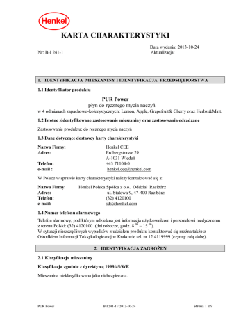 KARTA CHARAKTERYSTYKI Data wydania: 2013-10-24 Aktualizacja: Nr: B-I 241-1 1. IDENTYFIKACJA MIESZANINY I IDENTYFIKACJA PRZEDSI BIORSTWA 1.1 Identyfikator produktu PUR Power p yn do r cznego mycia naczy w 4 odmianach zapachowo-kolorystycznych: Lemon, Apple, Grapefruit& Cherry oraz Herbst&Mint. 1.2 Istotne zidentyfikowane zastosowanie mieszaniny oraz zastosowania odradzane Zastosowanie produktu: do r cznego mycia naczy 1.3 Dane dotycz ce dostawcy karty charakterystyki Nazwa Firmy: Adres: Henkel CEE Erdbergstrasse 29 A-1031 Wiede +43 71104-0 [email protected] Telefon: e-mail : W Polsce w sprawie karty charakterystyki nale y kontaktowa si z: Nazwa Firmy: Adres: Telefon: e-mail: Henkel Polska Spó ka z o.o. Oddzia Racibórz ul. Stalowa 9, 47-400 Racibórz (32) 4120100 [email protected] 1.4 Numer telefonu alarmowego Telefon alarmowy, pod którym udzielana jest informacja u ytkownikom i personelowi medycznemu z terenu Polski: (32) 4120100 (dni robocze, godz. 8 00 – 15 00). W sytuacji nieszcz liwych wypadków z udzia em produktu kontaktowa si mo na tak e z rodkiem Informacji Toksykologicznej w Krakowie tel. nr 12 4119999 (czynny ca dob ). 2. IDENTYFIKACJA ZAGRO 2.1 Klasyfikacja mieszaniny Klasyfikacja zgodnie z dyrektyw 1999/45/WE Mieszanina nieklasyfikowana jako niebezpieczna. PUR Power B-I 241-1 / 2013-10-24 Strona 1 z 9 2.2 Elementy oznakowania Ostrze enia / zalecenia: Przechowywa poza zasi giem dzieci Unika kontaktu z oczami. W razie kontaktu dok adnie przemy oczy wod . Nie po yka . W razie po kni cia skontaktowa si z lekarzem. Osoby o wra liwej lub uszkodzonej skórze powinny unika d szego kontaktu z produktem. Po umyciu naczynia dok adnie sp uka wod . Zwroty zalecane przez europejskie stowarzyszenie producentów detergentów A.I.S.E. do stosowania na produktach nie sklasyfikowanych jako niebezpieczne. Na opakowaniu s podane wraz z odpowiadaj cymi im piktogramami Sk adniki, deklarowane zgodnie z za cznikiem VII A do Rozporz dzenia (WE) Nr 648/2004 Parlamentu Europejskiego i Rady z dnia 31 marca 2004 w sprawie detergentów : 5 - 15 % anionowe rodki powierzchniowo czynne < 5 % amfoteryczne rodki powierzchniowo czynne Zawiera enzymy i konserwanty: 2-Bromo-2 - Nitropropane - 1,3 - diol*/, Methylchloroisothiazolinone*/, Methylizothiazolinone*/ oraz kompozycj zapachow , a w niej nast puj ce alergeny (w podanych w nawiasie odmianach kolorystycznych): - Limonene*/, Citral*/, Linalool*/ (odmiana Lemon) - Linalool*/ (odmiana Grapefruit& Cherry) */ nazwy INCI 2.3 Inne zagro enia Brak w przypadku stosowania zgodnie z przeznaczeniem. 3. SK AD /INFORMACJA O SK ADNIKACH MIESZANINY Niebezpieczne substancje (klasyfikacja wg dyrektywy 67/548/EWG implementowanej do prawa polskiego w Rozporz dzeniu Ministra Zdrowia z dnia 2.09.2003 r. w sprawie kryteriów i sposobu klasyfikacji substancji i preparatów chemicznych): Zawarto [ %] >=5,0 -< 7,0 >=1,0 -< 3,0 Symbol Substancja Sole sodowe siarczanowanych Xi etoksylowanych (2 EO) alkohli uszczowych C12 - C14 1-Propanaminium, 3-amino-N- Xi (karboksymetylo)-N,Ndimetylo-, N-koko acylowe pochodne, wodorotlenki, sole wewn trzne Zwroty R 38, 41 Nr rej. REACH 68891-38-3 500-234-8 01-2119488639-16 41 61789-40-0 263-058-8 01-2119488533-30 01-2119489410-39 CAS WE Klasyfikacja w/w substancji zgodnie z rozporz dzeniem (WE) nr 1272/2008 (CLP): Sole sodowe siarczanowanych etoksylowanych alkoholi t uszczowych C12 – C14 : Skin Irrit 2 [Dzia anie dra ni ce na skór , kat. 2] , H315; Eye Dam1 [Powa ne uszkodzenie oczu, kat. 1], H318, Aquatic Chronic 3 [Toksyczno przewlek a dla rodowiska wodnego, kat. 3] H412; 1-Propanaminium, 3-amino-N-(karboksymetylo)-N,N-dimetylo-, N-koko acylowe pochodne, wodorotlenki, sole wewn trzne: Eye Dam1 [Powa ne uszkodzenie oczu, Kategoria 1], H318, Aquatic Chronic 3 [Toksyczno przewlek a dla rodowiska wodnego, kat. 3] H412. Pe ne brzmienie zwrotów R i H - patrz sekcja 16 PUR Power B-I 241-1 / 2013-10-24 Strona 2 z 9 4. RODKI PIERWSZEJ POMOCY 4.1 Opis rodków pierwszej pomocy Ogólna informacja: przy wyst pieniu dolegliwo ci skonsultowa si z lekarzem. Po zanieczyszczeniu oczu: wyp uka oczy pod bie okulisty. wod . Je li to konieczne zasi gn Po kontakcie ze skór : zanieczyszczone powierzchnie skóry sp uka pod bie zanieczyszczon odzie . porady wod . Zdj W przypadku dostania si do dróg oddechowych: wyprowadzi poszkodowanego na wie e powietrze. W przypadku trudno ci z oddychaniem natychmiast skorzysta z pomocy lekarza. Po po kni ciu: wyp uka usta i gard o, nie wywo ywa wymiotów. Zasi gn porady lekarza. 4.2 Najwa niejsze ostre i opó nione objawy oraz skutki nara enia Po kontakcie ze skór : chwilowe podra nienie ( zaczerwienienie, obrz k, pieczenie) Po zanieczyszczeniu oczu: chwilowe podra nienie (zaczerwienienie, obrz k, pieczenie, zawienie) Po po knieciu: mo e wyst pi podra nienie jamy ustnej, gard a, uk adu pokarmowego, biegunka i wymioty. Wymiociny mog spowodowa uszkodzenie p uc (zach ni cie). Po wdychaniu py ów: podra nienie dróg oddechowych, kaszel. Wi ksza ilo spowodowa skurcze krtani i zadyszk . py ów mo e 4.3 Wskazania dotycz ce wszelkiej natychmiastowej pomocy lekarskiej i szczególnego post powania z poszkodowanym. Po po kni ciu: nie powodowa wymiotów. Poda niegazowany napój (wod , herbat ), a w przypadku po kni cia wi kszych lub nieznanych ilo ci - rodek antypienny (dimeticon lub simeticon) 5. POST POWANIE W PRZYPADKU PO ARU 5.1 rodki ga nicze: brak ogranicze , wod stosowa w postaci rozpylonej (unika pe nego strumienia). Wszystkie dost pne w handlu ga nice mog by u yte do gaszenia ognisk zap onu. Dzia ania ga nicze nale y dostosowa do warunków otoczenia, w szczególno ci do materia ów sk adowanych w pobli u gaszonego produktu. 5.2 Szczególne zagro enia zwi zane z mieszanin : niebezpiecznymi produktami podczas spalania mog by zwi zki powstaj ce w wyniku pirolizy i/lub tlenek w gla. 5.3 Informacje dla stra y po arnej: brak specyficznych zalece 6. POST POWANIE W PRZYPADKU NIEZAMIERZONEGO UWOLNIENIA DO RODOWISKA 6.1 Indywidualne rodki o
