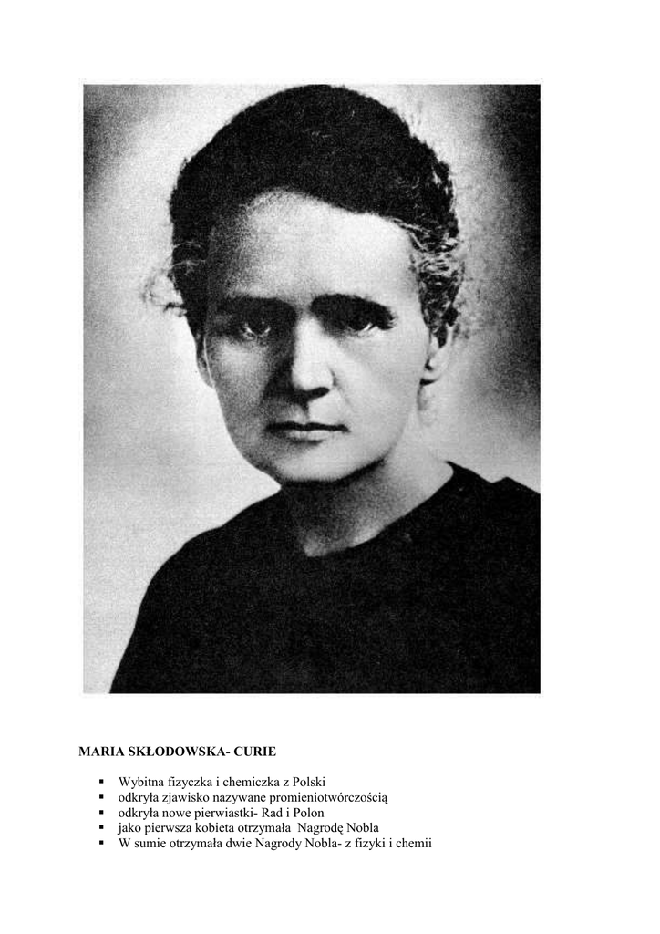 MARIA SKŁODOWSKA- CURIE Wybitna fizyczka i chemiczka z Polski odkryła zjawisko nazywane promieniotwórczością odkryła nowe pierwiastki- Rad i Polon jako pierwsza kobieta otrzymała Nagrodę Nobla W sumie otrzymała dwie Nagrody Nobla- z fizyki i chemii IRENA SENDLEROWA W czasie drugiej Wojny Światowej wykazała się niezwykłą odwagą ratując życie wielu żydowskich dzieci. Ryzykowała swoim własnym życiem, bo za takie zachowanie naziści karali śmiercią. Mimo to nie bała się i pomagała dalej, nawet kiedy została złapana i uciekła przy pomocy koleżanki, która przekupiła strażnika. Dzięki jej odwadze wojnę przeżyło wiele żydowskich dzieci, którym zapewniła schronienie. Została odznaczona przez prezydenta RP Orderem Orła Białego. Walentina Tierieszkowa Była radziecką kosmonautką, pierwszą kobieta, która poleciała w kosmos. Następna kobieta poleciała w kosmos dopiero po 19 latach! KRÓLOWA BONA Królowa Polski. Obdarzona była nieprzeciętną inteligencją, była dumna i bezwzględna wobec możnych, broniła biednych i słabych przed uciskiem. Dzięki niej również na polskie stoły trafiło wiele nieznanych wcześniej warzyw, tzw. włoszczyzna. Wyjeżdżając z Polski pozostawiła po sobie doskonale zagospodarowane dobra królewskie, przynoszące ogromne dochody.