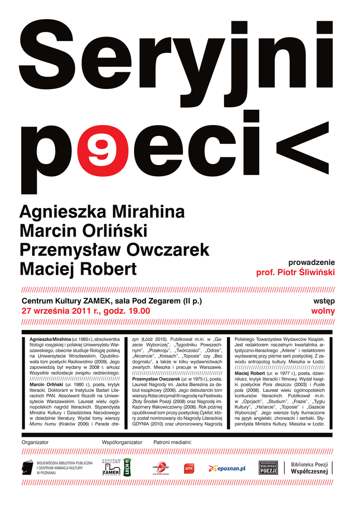 Seryjni 9 poeci< Agnieszka Mirahina Marcin Orliński Przemysław Owczarek Maciej Robert prowadzenie prof. Piotr Śliwiński ///////////////////////////////////////////////////////////////////////////////////////////////////////////////////////////////////////////////// Centrum Kultury ZAMEK, sala Pod Zegarem (II p.) wstęp 27 września 2011 r., godz. 19.00 wolny ///////////////////////////////////////////////////////////////////////////////////////////////////////////////////////////////////////////////// Agnieszka Mirahina (ur. 1985 r.), absolwentka filologii rosyjskiej i polskiej Uniwersytetu Warszawskiego, obecnie studiuje filologię polską na Uniwersytecie Wrocławskim. Opublikowała tom poetycki Radiowidmo (2009). Jego zapowiedzią był wydany w 2008 r. arkusz Wszystkie radiostacje związku radzieckiego. /////////////////////////////////////////////// Marcin Orliński (ur. 1980 r.), poeta, krytyk literacki. Doktorant w Instytucie Badań Literackich PAN. Absolwent filozofii na Uniwersytecie Warszawskim. Laureat wielu ogólnopolskich nagród literackich. Stypendysta Ministra Kultury i Dziedzictwa Narodowego w dziedzinie literatury. Wydal tomy wierszy Mumu humu (Kraków 2006) i Parada dre- Organizator zyn (Łódź 2010). Publikował m.in. w „Gazecie Wyborczej”, „Tygodniku Powszechnym”, „Przekroju”, „Twórczości”, „Odrze”, „Akcencie”, „Kresach”, „Toposie” czy „Bez dogmatu”, a także w kilku wydawnictwach zwartych. Mieszka i pracuje w Warszawie. /////////////////////////////////////////////// Przemysław Owczarek (ur. w 1975 r.), poeta. Laureat Nagrody im. Jacka Bierezina za debiut książkowy (2006). Jego debiutancki tom wierszy Rdza otrzymał III nagrodę na Festiwalu Złoty Środek Poezji (2008) oraz Nagrodę im. Kazimery Iłłakowiczówny (2008). Rok później opublikował tom prozy poetyckiej Cyklist, który został nominowany do Nagrody Literackiej GDYNIA (2010) oraz uhonorowany Nagrodą Współorganizator Polskiego Towarzystwa Wydawców Książek. Jest redaktorem naczelnym kwartalnika artystyczno-literackiego „Arterie” i redaktorem wydawanej przy piśmie serii poetyckiej. Z zawodu antropolog kultury. Mieszka w Łodzi. //////////////////////////////////////////// Maciej Robert (ur. w 1977 r.), poeta, dziennikarz, krytyk literacki i filmowy. Wydał książki poetyckie Pora deszczu (2003) i Puste pola (2008). Laureat wielu ogólnopolskich konkursów literackich. Publikował m.in. w „Opcjach”, „Studium”, „Frazie”, „Tyglu Kultury”, „Ha!arcie”, „Toposie” i „Gazecie Wyborczej”. Jego wiersze były tłumaczone na język angielski, chorwacki i serbski. Stypendysta Ministra Kultury. Mieszka w Łodzi. Patroni medialni: //////////////////////////////////////////////////////////////////////////////////////////////////////////////////////////////////////////////// WOJEWÓDZKA BIBLOTEKA PUBLICZNA I CENTRUM ANIMACJI KULTURY W POZNANIU WIELKOPOLSKA BIBLIOTEKA POEZJI ////////////////////////////////////////////////////////////////////////////////////////////////////////////////////////////////////////////////