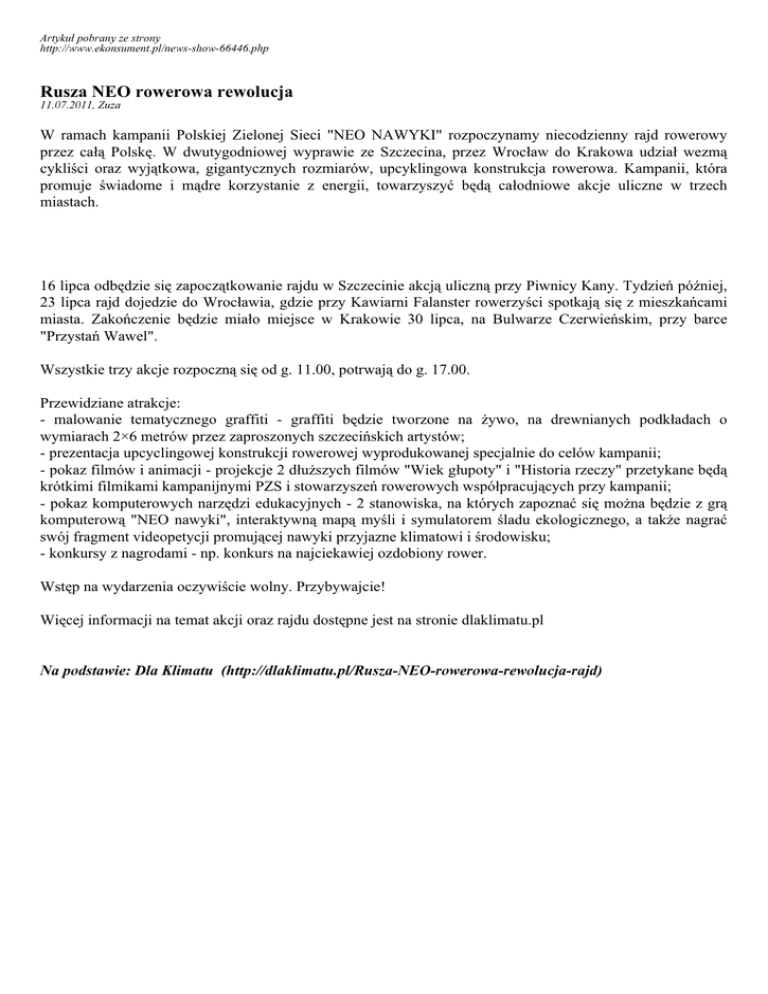 Artykuł pobrany ze strony http://www.ekonsument.pl/news-show-66446.php Rusza NEO rowerowa rewolucja 11.07.2011, Zuza W ramach kampanii Polskiej Zielonej Sieci "NEO NAWYKI" rozpoczynamy niecodzienny rajd rowerowy przez całą Polskę. W dwutygodniowej wyprawie ze Szczecina, przez Wrocław do Krakowa udział wezmą cykliści oraz wyjątkowa, gigantycznych rozmiarów, upcyklingowa konstrukcja rowerowa. Kampanii, która promuje świadome i mądre korzystanie z energii, towarzyszyć będą całodniowe akcje uliczne w trzech miastach. 16 lipca odbędzie się zapoczątkowanie rajdu w Szczecinie akcją uliczną przy Piwnicy Kany. Tydzień później, 23 lipca rajd dojedzie do Wrocławia, gdzie przy Kawiarni Falanster rowerzyści spotkają się z mieszkańcami miasta. Zakończenie będzie miało miejsce w Krakowie 30 lipca, na Bulwarze Czerwieńskim, przy barce "Przystań Wawel". Wszystkie trzy akcje rozpoczną się od g. 11.00, potrwają do g. 17.00. Przewidziane atrakcje: - malowanie tematycznego graffiti - graffiti będzie tworzone na żywo, na drewnianych podkładach o wymiarach 2×6 metrów przez zaproszonych szczecińskich artystów; - prezentacja upcyclingowej konstrukcji rowerowej wyprodukowanej specjalnie do celów kampanii; - pokaz filmów i animacji - projekcje 2 dłuższych filmów "Wiek głupoty" i "Historia rzeczy" przetykane będą krótkimi filmikami kampanijnymi PZS i stowarzyszeń rowerowych współpracujących przy kampanii; - pokaz komputerowych narzędzi edukacyjnych - 2 stanowiska, na których zapoznać się można będzie z grą komputerową "NEO nawyki", interaktywną mapą myśli i symulatorem śladu ekologicznego, a także nagrać swój fragment videopetycji promującej nawyki przyjazne klimatowi i środowisku; - konkursy z nagrodami - np. konkurs na najciekawiej ozdobiony rower. Wstęp na wydarzenia oczywiście wolny. Przybywajcie! Więcej informacji na temat akcji oraz rajdu dostępne jest na stronie dlaklimatu.pl Na podstawie: Dla Klimatu (http://dlaklimatu.pl/Rusza-NEO-rowerowa-rewolucja-rajd)