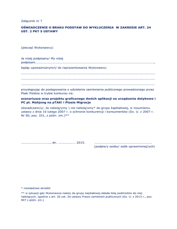 Załącznik nr 7 OŚWIADCZENIE O BRAKU PODSTAW DO WYKLUCZENIA W ZAKRESIE ART. 24 UST. 2 PKT 5 USTAWY (pieczęć Wykonawcy) Ja niżej podpisany/ My niżej podpisani……………………………………………………………………………………………………………………………….., będąc upoważnionym/i/ do reprezentowania Wykonawcy: ............................................................................................................................ ............................................................................................................................ ............................................................................................................................ przystępując do postępowania o udzielenie zamówienia publicznego prowadzonego przez Ptaki Polskie w trybie konkursu na: scenariusza oraz projektu graficznego dwóch aplikacji na urządzenia dotykowe i PC pt. Mahjong na pTAK! i Ptasie Migracje oświadczam/y/, że należę/ymy \ nie należę/ymy* do grupy kapitałowej, w rozumieniu ustawy z dnia 16 lutego 2007 r. o ochronie konkurencji i konsumentów (Dz. U. z 2007 r. Nr 50, poz. 331, z późn. zm.)** ..........................., dn. ................ 2015. ..................................................... (podpis/y osoby/ osób uprawnionej/ych) * niewłaściwe skreślić ** w sytuacji gdy Wykonawca należy do grupy kapitałowej składa listę podmiotów do niej należących, zgodnie z art. 26 ust. 2d ustawy Prawo zamówień publicznych (Dz. U. z 2013 r., poz. 907 z późn. zm.)
