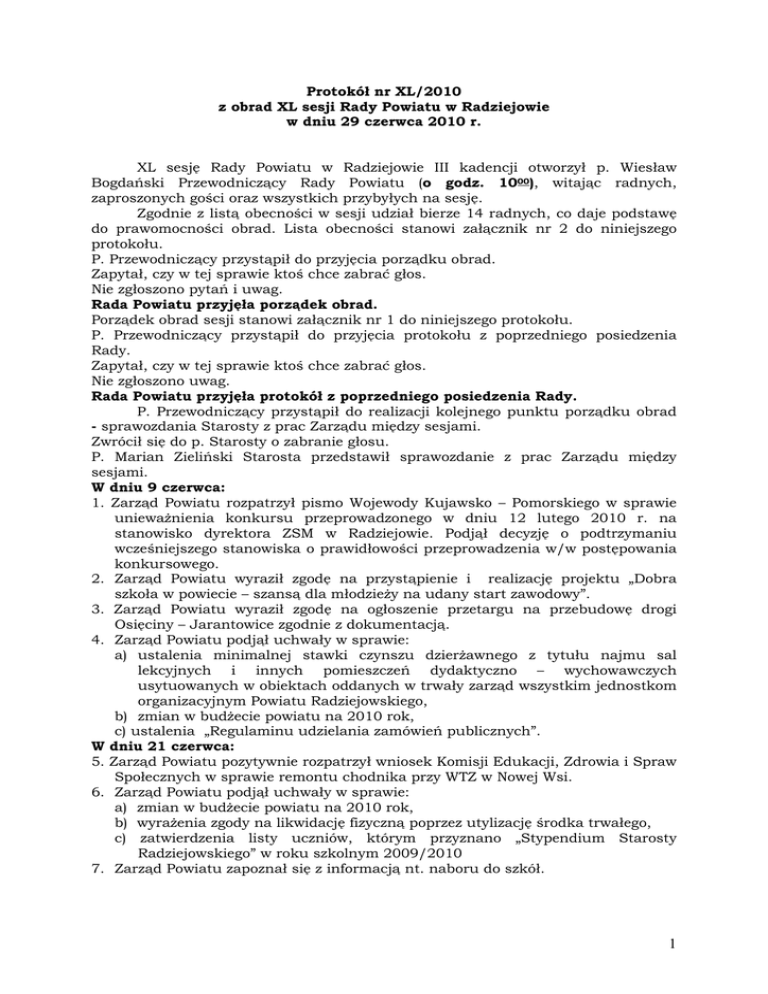 Protokół nr XL/2010 z obrad XL sesji Rady Powiatu w Radziejowie w dniu 29 czerwca 2010 r. XL sesję Rady Powiatu w Radziejowie III kadencji otworzył p. Wiesław Bogdański Przewodniczący Rady Powiatu (o godz. 1000), witając radnych, zaproszonych gości oraz wszystkich przybyłych na sesję. Zgodnie z listą obecności w sesji udział bierze 14 radnych, co daje podstawę do prawomocności obrad. Lista obecności stanowi załącznik nr 2 do niniejszego protokołu. P. Przewodniczący przystąpił do przyjęcia porządku obrad. Zapytał, czy w tej sprawie ktoś chce zabrać głos. Nie zgłoszono pytań i uwag. Rada Powiatu przyjęła porządek obrad. Porządek obrad sesji stanowi załącznik nr 1 do niniejszego protokołu. P. Przewodniczący przystąpił do przyjęcia protokołu z poprzedniego posiedzenia Rady. Zapytał, czy w tej sprawie ktoś chce zabrać głos. Nie zgłoszono uwag. Rada Powiatu przyjęła protokół z poprzedniego posiedzenia Rady. P. Przewodniczący przystąpił do realizacji kolejnego punktu porządku obrad - sprawozdania Starosty z prac Zarządu między sesjami. Zwrócił się do p. Starosty o zabranie głosu. P. Marian Zieliński Starosta przedstawił sprawozdanie z prac Zarządu między sesjami. W dniu 9 czerwca: 1. Zarząd Powiatu rozpatrzył pismo Wojewody Kujawsko – Pomorskiego w sprawie unieważnienia konkursu przeprowadzonego w dniu 12 lutego 2010 r. na stanowisko dyrektora ZSM w Radziejowie. Podjął decyzję o podtrzymaniu wcześniejszego stanowiska o prawidłowości przeprowadzenia w/w postępowania konkursowego. 2. Zarząd Powiatu wyraził zgodę na przystąpienie i realizację projektu „Dobra szkoła w powiecie – szansą dla młodzieży na udany start zawodowy”. 3. Zarząd Powiatu wyraził zgodę na ogłoszenie przetargu na przebudowę drogi Osięciny – Jarantowice zgodnie z dokumentacją. 4. Zarząd Powiatu podjął uchwały w sprawie: a) ustalenia minimalnej stawki czynszu dzierżawnego z tytułu najmu sal lekcyjnych i innych pomieszczeń dydaktyczno – wychowawczych usytuowanych w obiektach oddanych w trwały zarząd wszystkim jednostkom organizacyjnym Powiatu Radziejowskiego, b) zmian w budżecie powiatu na 2010 rok, c) ustalenia „Regulaminu udzielania zamówień publicznych”. W dniu 21 czerwca: 5. Zarząd Powiatu pozytywnie rozpatrzył wniosek Komisji Edukacji, Zdrowia i Spraw Społecznych w sprawie remontu chodnika przy WTZ w Nowej Wsi. 6. Zarząd Powiatu podjął uchwały w sprawie: a) zmian w budżecie powiatu na 2010 rok, b) wyrażenia zgody na likwidację fizyczną poprzez utylizację środka trwałego, c) zatwierdzenia listy uczniów, którym przyznano „Stypendium Starosty Radziejowskiego” w roku szkolnym 2009/2010 7. Zarząd Powiatu zapoznał się z informacją nt. naboru do szkół. 1 8. Zarząd Powiatu zapoznał się z pismem p. Krzysztofa Lewczuka w sprawie wyrażenia zgody na budowę na dachach obiektów oświatowych będących własnością powiatu małych elektrowni fotowoltaicznych o mocy 50-100 KW. 9. Zarząd Powiatu omówił bieżące sprawy dotyczące Rodzinnego Domu Dziecka w Biskupicach. 10. Zarząd Powiatu pozytywnie rozpatrzył wniosek WTZ w Nowej Wsi w sprawie dofinansowania wycieczki. Budżet WTZ zostanie zwiększony o kwotę 2.000 zł na najbliższej sesji. 11. Zarząd Powiatu przyjął porządek i materiały na sesję. P. Przewodniczący przystąpił do kolejnego punku porządku obrad – zapytań i uwag do sprawozdania Starosty. Głos zabrał radny Kalinowski. Zapytał czy Zarząd rozpatrywał pismo Wojewody informujące w sprawie unieważnienia konkursu na stanowisko dyrektora ZSM. Wicestarosta odpowiedział, że takie pismo było rozpatrywane. Rada Powiatu przyjęła sprawozdanie Starosty z prac Zarządu między sesjami. P. Przewodniczący przystąpił do realizacji kolejnego punktu porządku obrad – sprawozdanie kierownika PCPR z działalności Centrum: przedstawienia wykazu potrzeb z zakresu pomocy społecznej; informacji z działalności Domu Pomocy Społecznej w Piotrkowie Kujawskim; informacji z działalności Rodzinnego Domu Dziecka w Biskupicach. Poprosił o zabranie głosu p. Bartczak kierownika PCPR. P. Bartczak przekazała, że PCPR na swoją działalność otrzymało w ubiegłym roku kwotę 212.104 zł, na ten rok 303.387 zł. PCPR zajmuje się takimi zadaniami jak: przeciwdziałanie alkoholizmowi, w ubiegłym roku przekazano 1.500 zł na ten cel, w tym roku taka sama kwota. Odprowadzane są składki za dzieci w RDD, w 2009 roku wydano kwotę 3.772 zł, na 2010 rok do dyspozycji jest przeznaczona kwota 4.493 zł. PCPR zajmuje się dziećmi w placówkach opiekuńczo – wychowawczych poza powiatem. W 2009 roku na ten cel wydano 314.570 zł. na dzień sporządzania sprawozdania w placówkach przebywało ośmiu wychowanków, na dzień dzisiejszy jest ich siedmioro, dwójka dzieci jest przygotowywana do przejścia do rodziny zastępczej, jedna wychowanka się usamodzielni. Na terenie powiatu funkcjonują 24 rodziny zastępcze, umieszczonych jest w nich 29 dzieci. W 2009 roku wydano 260.472 zł, na 2010 rok planuje się wydać 292.249 zł. Aktualnie kontynuuje naukę czterech wychowanków z rodzin zastępczych. Poza powiatem istnieje siedem rodzin, w tym umieszczonych jest 11 dzieci. W 2009 roku wydano 139.131 zł. Na 2010 rok zaplanowanych jest 131.242 zł. PCPR obsługuje również Powiatowy Zespół ds. Orzekania o Niepełnosprawności. Budżet w 2009 roku wyniósł 169.569 zł, w 2010 roku 169.074 zł. PRCP od 2009 roku realizuje projekt współfinansowany z EFS pod nazwą Lepszy Start. W 2009 roku wydano na ten cel 106.604 zł w tym udział powiatu wyniósł 11.193,42 zł. Na 2010 rok ten sam projekt 159.085 zł, z czego udział powiatu wyniesie 16.703,93 zł. PCPR realizuje zadania z zakresu rehabilitacji społecznej. W 2009 roku wydano łącznie kwotę 817.533,75 zł, z czego na WTZ w Nowej Wsi wydano 443.880 zł. W 2010 roku otrzymano kwotę 732.304 zł, 443.880 zł środki na WTZ. Pow