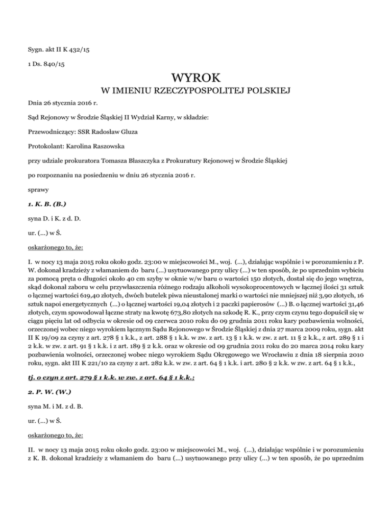 Sygn. akt II K 432/15 1 Ds. 840/15 WYROK W IMIENIU RZECZYPOSPOLITEJ POLSKIEJ Dnia 26 stycznia 2016 r. Sąd Rejonowy w Środzie Śląskiej II Wydział Karny, w składzie: Przewodniczący: SSR Radosław Gluza Protokolant: Karolina Raszowska przy udziale prokuratora Tomasza Błaszczyka z Prokuratury Rejonowej w Środzie Śląskiej po rozpoznaniu na posiedzeniu w dniu 26 stycznia 2016 r. sprawy 1. K. B. (B.) syna D. i K. z d. D. ur. (...) w Ś. oskarżonego to, że: I. w nocy 13 maja 2015 roku około godz. 23:00 w miejscowości M., woj. (...), działając wspólnie i w porozumieniu z P. W. dokonał kradzieży z włamaniem do baru (...) usytuowanego przy ulicy (...) w ten sposób, że po uprzednim wybiciu za pomocą pręta o długości około 40 cm szyby w oknie w/w baru o wartości 150 złotych, dostał się do jego wnętrza, skąd dokonał zaboru w celu przywłaszczenia różnego rodzaju alkoholi wysokoprocentowych w łącznej ilości 31 sztuk o łącznej wartości 619,40 złotych, dwóch butelek piwa nieustalonej marki o wartości nie mniejszej niż 3,90 złotych, 16 sztuk napoi energetycznych (...) o łącznej wartości 19,04 złotych i 2 paczki papierosów (...) B. o łącznej wartości 31,46 złotych, czym spowodował łączne straty na kwotę 673,80 złotych na szkodę R. K., przy czym czynu tego dopuścił się w ciągu pięciu lat od odbycia w okresie od 09 czerwca 2010 roku do 09 grudnia 2011 roku kary pozbawienia wolności, orzeczonej wobec niego wyrokiem łącznym Sądu Rejonowego w Środzie Śląskiej z dnia 27 marca 2009 roku, sygn. akt II K 19/09 za czyny z art. 278 § 1 k.k., z art. 288 § 1 k.k. w zw. z art. 13 § 1 k.k. w zw. z art. 11 § 2 k.k., z art. 289 § 1 i 2 k.k. w zw. z art. 91 § 1 k.k. i z art. 189 § 2 k.k. oraz w okresie od 09 grudnia 2011 roku do 20 marca 2014 roku kary pozbawienia wolności, orzeczonej wobec niego wyrokiem Sądu Okręgowego we Wrocławiu z dnia 18 sierpnia 2010 roku, sygn. akt III K 221/10 za czyny z art. 282 k.k. w zw. z art. 64 § 1 k.k. i art. 280 § 2 k.k. w zw. z art. 64 § 1 k.k., tj. o czyn z art. 279 § 1 k.k. w zw. z art. 64 § 1 k.k.; 2. P. W. (W.) syna M. i M. z d. B. ur. (...) w Ś. oskarżonego to, że: II. w nocy 13 maja 2015 roku około godz. 23:00 w miejscowości M., woj. (...), działając wspólnie i w porozumieniu z K. B. dokonał kradzieży z włamaniem do baru (...) usytuowanego przy ulicy (...) w ten sposób, że po uprzednim wybiciu za pomocą pręta o długości około 40 cm szyby w oknie w/w baru o wartości 150 złotych, dostał się do jego wnętrza, skąd dokonał zaboru w celu przywłaszczenia różnego rodzaju alkoholi wysokoprocentowych w łącznej ilości 31 sztuk o łącznej wartości 619,40 złotych, dwóch butelek piwa nieustalonej marki o wartości nie mniejszej niż 3,90 złotych, 16 sztuk napoi energetycznych (...) o łącznej wartości 19,04 złotych i 2 paczki papierosów (...) B. o łącznej wartości 31,46 złotych, czym spowodował łączne straty na kwotę 673,80 złotych na szkodę R. K., tj. o czyn z art. 279 § 1 k.k.; orzeka: I. uznaje oskarżonego K. B. za winnego popełnienia zarzucanego mu czynu opisanego w pkt I części wstępnej wyroku, przy czym ustala, że działał on w warunkach powrotu do przestępstwa będąc uprzednio skazany prawomocnym wyrokiem Sądu Okręgowego we Wrocławiu z dnia 18 sierpnia 2010r. sygn. akt III K 221/10 za przestępstwo z art. 282 k.k. w zw. z art. 64 § 1 k.k. na karę 1 roku pozbawienia wolności i za przestępstwo z art. 280 § 2 k.k. w zw. z art. 64 § 1 k.k. na karę 2 lat pozbawienia wolności oraz karę łączną 2 lat i 6 miesięcy pozbawienia wolności, którą odbył w okresie od 09.12.2011r. do 08.08.2013r., tj. popełnienia przestępstwa z art. 279 § 1 k.k. w zw. z art. 64 § 1 k.k. i za to, na podstawie art. 279 § 1 k.k., wymierza mu karę 1 (jednego) roku pozbawienia wolności; II. na podstawie art. 63 § 1 k.k. zalicza oskarżonemu K. B. na poczet wymierzonej mu kary pozbawienia wolności okres jego zatrzymania w sprawie od dnia 25.06.2015r. do dnia 26.06.2015r., co odpowiada jednemu dniowi kary pozbawienia wolności; III. uznaje oskarżonego P. W. za winnego popełnienia zarzucanego mu czynu opisanego w pkt II części wstępnej wyroku, to jest przestępstwa z art. 279 § 1 k.k. i za to, na podstawie tego przepisu wymierza mu karę 1 (jednego) roku pozbawienia wolności; IV. na podstawie art. 69 § 1 i 2 k.k. i art. 70 § 1 pkt 1 k.k. w zw. z art. 4 § 1 k.k. warunkowo zawiesza oskarżonemu P. W. wykonanie orzeczonej kary pozbawienia wolności na okres 3 (trzech) lat próby; V. na podstawie art. 63 § 1 k.k. zalicza oskarżonemu P. W. na poczet wymierzonej mu kary pozbawienia wolności, na wypadek zarządzenia jej wykonania, okres jego zatrzymania od dnia 25.06.2015r. do dnia 26.06.2015r., co odpowiada jednemu dniowi kary pozbawienia wolności ; VI. na podstawie art. 46 § 1 k.k. zobowiązuje oskarżonych K. B. i P. W. do solidarnego naprawienia szkody wyrządzonej przestępstwem poprzez zapłatę na rzecz pokrzywdzonej R. K. kwoty 673,80 zł (sześćset siedemdziesiąt trzy złote osiemdziesiąt groszy); VII. na podstawie art. 624 § 1 k.p.k. i art. 17 ust. 1 ustawy z dnia 23.06.1973r. o opłatach w sprawach karnych zwalnia oskarżonych K. B. i P. W. od ponoszenia kosztów sądowych, w tym opłaty i zalicza je na rachunek Skarbu Państwa. UZASADNIENIE WYROKU (ograniczone na podstawie art. 424 § 3 k.p.k. do wyjaśnienia podstawy prawnej wyroku) Sąd Rejonowy zważył, co następuje: Ustalając sprawstwo i winę oskarżonych K. B. i P. W. w zakresie zarzucanych im czynów, sąd stwierdził, iż wyczerpują one ustawowe znamiona występków z art. 279 § 1 k.k., tak w zakresie strony przedmiotowej, jak i podmiotowej. Zdaniem sądu nie budzi jakichkolwiek wątpliwości, że oskarżeni w dniu 13 maja 2015r. w miejscowości M., działając wspólnie i w porozumieniu, dokonali kradzieży z włamaniem do baru (...). Jak wynika ze zgromadzone w spraw