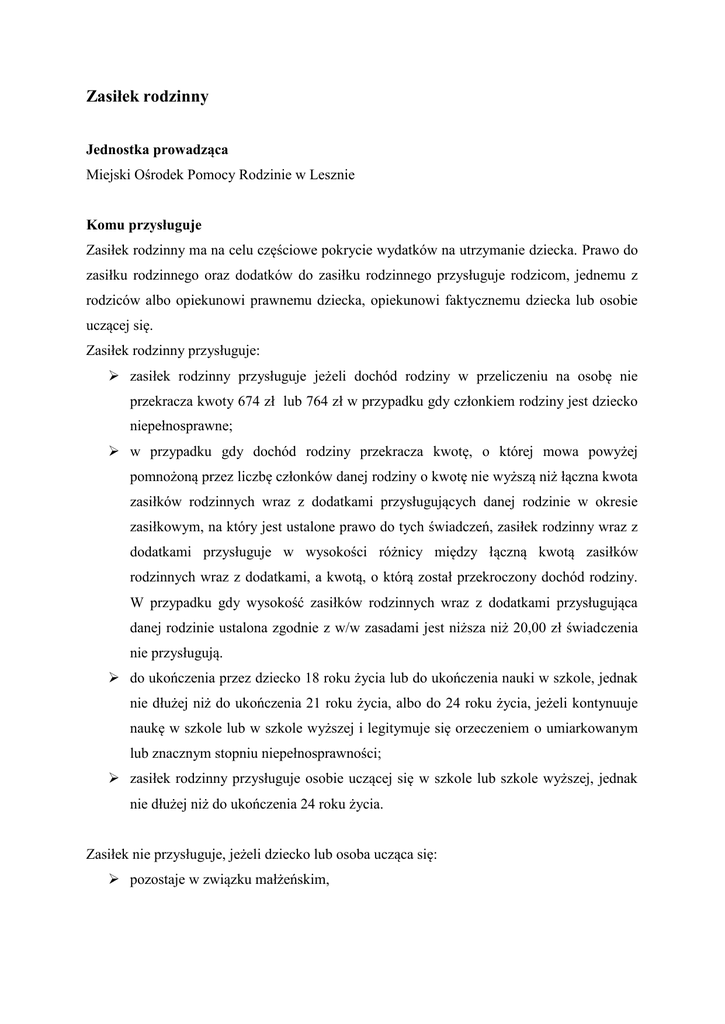 Zasiłek rodzinny Jednostka prowadząca Miejski Ośrodek Pomocy Rodzinie w Lesznie Komu przysługuje Zasiłek rodzinny ma na celu częściowe pokrycie wydatków na utrzymanie dziecka. Prawo do zasiłku rodzinnego oraz dodatków do zasiłku rodzinnego przysługuje rodzicom, jednemu z rodziców albo opiekunowi prawnemu dziecka, opiekunowi faktycznemu dziecka lub osobie uczącej się. Zasiłek rodzinny przysługuje: zasiłek rodzinny przysługuje jeżeli dochód rodziny w przeliczeniu na osobę nie przekracza kwoty 674 zł lub 764 zł w przypadku gdy członkiem rodziny jest dziecko niepełnosprawne; w przypadku gdy dochód rodziny przekracza kwotę, o której mowa powyżej pomnożoną przez liczbę członków danej rodziny o kwotę nie wyższą niż łączna kwota zasiłków rodzinnych wraz z dodatkami przysługujących danej rodzinie w okresie zasiłkowym, na który jest ustalone prawo do tych świadczeń, zasiłek rodzinny wraz z dodatkami przysługuje w wysokości różnicy między łączną kwotą zasiłków rodzinnych wraz z dodatkami, a kwotą, o którą został przekroczony dochód rodziny. W przypadku gdy wysokość zasiłków rodzinnych wraz z dodatkami przysługująca danej rodzinie ustalona zgodnie z w/w zasadami jest niższa niż 20,00 zł świadczenia nie przysługują. do ukończenia przez dziecko 18 roku życia lub do ukończenia nauki w szkole, jednak nie dłużej niż do ukończenia 21 roku życia, albo do 24 roku życia, jeżeli kontynuuje naukę w szkole lub w szkole wyższej i legitymuje się orzeczeniem o umiarkowanym lub znacznym stopniu niepełnosprawności; zasiłek rodzinny przysługuje osobie uczącej się w szkole lub szkole wyższej, jednak nie dłużej niż do ukończenia 24 roku życia. Zasiłek nie przysługuje, jeżeli dziecko lub osoba ucząca się: pozostaje w związku małżeńskim, zostało umieszczone w instytucji zapewniającej całodobowe utrzymanie( np. w domu dziecka, pogotowiu opiekuńczym itd.) i instytucja ta zapewnia nieodpłatnie pełne utrzymanie; zostało umieszczone w rodzinnie zastępczej; pełnoletnie dziecko lub osoba ucząca się jest upoważniona do zasiłku rodzinnego na własne dziecko; Wysokość zasiłku rodzinnego w okresie od 1 listopada 2015 r. do 31 października 2016 r. wynosi: 89 zł na dziecko w wieku do ukończenia 5 roku życia; 118 zł na dziecko w wieku powyżej 5 roku życia do ukończenia 18 roku życia; 129 zł na dziecko w wieku powyżej 18 roku życia do ukończenia 24 roku życia. Wysokość zasiłku rodzinnego w okresie od 1 listopada 2016 r. do 31 października 2017 r. wynosi: 95 zł na dziecko w wieku do ukończenia 5 roku życia; 124 zł na dziecko w wieku powyżej 5 roku życia do ukończenia 18 roku życia; 135 zł na dziecko w wieku powyżej 18 roku życia do ukończenia 24 roku życia. Do zasiłku rodzinnego przysługują następujące dodatki: dodatek z tytułu urodzenia dziecka; dodatek z tytułu opieki nad dzieckiem w okresie korzystania z urlopu wychowawczego; dodatek z tytułu samotnego wychowywania dziecka; dodatek z tytułu wychowywania dziecka w rodzinie wielodzietnej; dodatek z tytułu kształcenia i rehabilitacji dziecka niepełnosprawnego; dodatek z tytułu rozpoczęcia roku szkolnego; dodatek z tytułu podjęcia przez dziecko nauki w szkole poza miejscem zamieszkania. Wymagane dokumenty Wniosek o ustalenie prawa do zasiłku rodzinnego oraz dodatków do zasiłku rodzinnego. Oświadczenia członków rodziny o dochodach osiągniętych w roku kalendarzowym poprzedzającym okres zasiłkowy, innych niż dochody podlegające opodatkowaniu podatkiem dochodowym od osób fizycznych na zasadach określonych w art. 27, art. 30b, art. 30c, art. 30e i art. 30f ustawy z dnia 26 lipca 1991 r. o podatku dochodowym od osób fizycznych, ustawy z dnia 26 lipca 1991r o podatku dochodowym od osób fizycznych (Dz.U z 2012r poz. 261 z późn. zm.) dokumenty stwierdzające wysokość dochodu rodziny, w tym odpowiednio: oświadczenia członków rodziny rozliczających się na podstawie przepisów o zryczałtowanym podatku dochodowym od niektórych przychodów osiąganych przez osoby fizyczne o dochodzie osiągniętym w roku kalendarzowym poprzedzającym okres, na który ustalane jest prawo do świadczenia rodzinnego, zaświadczenie właściwego organu gminy, nakaz płatniczy albo oświadczenie o wielkości gospodarstwa rolnego wyrażonej w hektarach przeliczeniowych ogólnej powierzchni w roku kalendarzowym poprzedzającym okres, na który ustalane jest prawo do świadczenia rodzinnego, umowę dzierżawy − w przypadku oddania części lub całości znajdującego się w posiadaniu rodziny gospodarstwa rolnego w dzierżawę, na podstawie umowy zawartej stosownie do przepisów o ubezpieczeniu społecznym rolników, albo oddania gospodarstwa rolnego w dzierżawę w związku z pobieraniem renty określonej w przepisach o wspieraniu rozwoju obszarów wiejskich ze środków pochodzących z Sekcji Gwarancji Europejskiego Funduszu Orientacji i Gwarancji Rolnej, umowę o wniesieniu wkładów gruntowych – w przypadku wniesienia gospodarstwa rolnego do użytkowania przez rolniczą spółdzielnię produkcyjną, odpis podlegającego wykonaniu orzeczenia sądu zasądzającego alimenty na rzecz osób w rodzinie lub poza rodziną lub odpis protokołu posiedzenia zawierającego treść ugody sądowej, odpis zatwierdzonej przez sąd ugody zawartej przed mediatorem lub innego tytułu wykonawczego pochodzącego lub zatwierdzonego przez sąd, zobowiązujących do alimentów na rzecz osób w rodzinie lub poza rodziną, przekazy lub przelewy pieniężne dokumentujące wysokość zapłaconych alimentów, jeżeli członkowie rodziny są zobowiązani orzeczeniem sądu, ugodą sądową, ugodą zawartą przed mediatorem lub innym tytułem wykonawczym pochodzącym lub zatwierdzonym przez sąd do ich płacenia na rzecz osoby spoza rodziny, w przypadku gdy osoba uprawniona nie otrzymała alimentów albo otrzymała je w wysokości niższej od ustalone