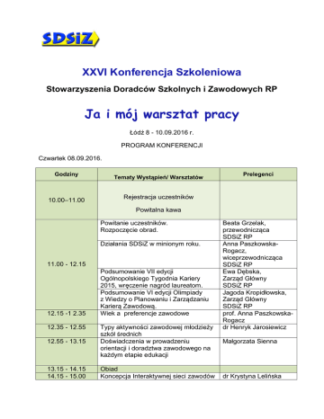 XXVI Konferencja Szkoleniowa Stowarzyszenia Doradców Szkolnych i Zawodowych RP Ja i mój warsztat pracy Łódź 8 - 10.09.2016 r. PROGRAM KONFERENCJI Czwartek 08.09.2016. Godziny 10.00–11.00 Tematy Wystąpień/ Warsztatów Prelegenci Rejestracja uczestników Powitalna kawa Powitanie uczestników. Rozpoczęcie obrad. Działania SDSiZ w minionym roku. 11.00 - 12.15 12.15 -1 2.35 Podsumowanie VII edycji Ogólnopolskiego Tygodnia Kariery 2015, wręczenie nagród laureatom. Podsumowanie VI edycji Olimpiady z Wiedzy o Planowaniu i Zarządzaniu Karierą Zawodową. Wiek a preferencje zawodowe 12.55 - 13.15 Typy aktywności zawodowej młodzieży szkół średnich Doświadczenia w prowadzeniu orientacji i doradztwa zawodowego na każdym etapie edukacji 13.15 - 14.15 14.15 - 15.00 Obiad Koncepcja Interaktywnej sieci zawodów 12.35 - 12.55 Beata Grzelak, przewodnicząca SDSiZ RP Anna PaszkowskaRogacz, wiceprzewodnicząca SDSiZ RP Ewa Dębska, Zarząd Główny SDSiZ RP Jagoda Kropidłowska, Zarząd Główny SDSiZ RP prof. Anna PaszkowskaRogacz dr Henryk Jarosiewicz Małgorzata Sienna dr Krystyna Lelińska 15.00 - 15.20 15.20 - 15.50 15. 50 - 16.45 (warsztaty równoległe) jako pomoc w planowaniu kariery. Studia za granicą - Atrakcyjna alternatywa dla młodzieży? Fakty i mity. przerwa kawowa Określanie kodu planowanej kariery na podstawie pomiaru preferowanej aktywności. Diagnoza typów aktywności zawodowej młodzieży szkół średnich: narzędzia i interpretacja Aleksandra Kozera dr Krystyna Lelińska dr Henryk Jarosiewicz Krajowy Zjazd Członków SDSiZ RP Uroczysta kolacja Członkowie SDSiZ RP 9.00 - 11.15 „The Coaching Maps” prof. Robert Geisler 11.15 - 11.45 11.45 - 13.45 przerwa kawowa Coaching w prowadzeniu doradztwa zawodowego Małgorzata Sienna 17.00 - 19.00 20.00 Piątek 09.09.2016. (warsztaty Równoległe) 13.45 - 14.45 14.45 - 15.05 15.05 - 15.25 15.25 - 15.45 15.45 - 16.45 19.00 Jak pomóc uczniom planować międzynarodową edukację Doradztwo, Aplikacje i Finanse (UK, USA, Dania, Niemcy, Holandia)? obiad Wybrane aspekty władzy w pracy doradcy Wielokulturowe Szkoły’ - wsparcie dla nauczycieli w kształceniu w środowisku wielokulturowym Techniki doskonalenia pracy trenerów IT – międzynarodowe doświadczenia zebrane w ramach projektu QualiTools Dyskusja i podsumowanie konferencji. Kolacja Sobota 10.09.2016. Wycieczka – dla chętnych Zarząd Główny SDSIZ RP Aleksandra Kozera dr Ewa Dębska dr Adam K. Gogacz dr Anna Sołtys