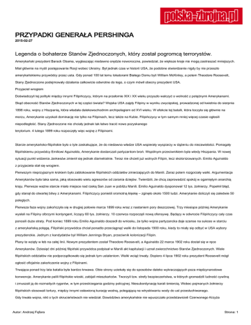 PRZYPADKI GENERAŁA PERSHINGA 2015-02-27 Legenda o bohaterze Stanów Zjednoczonych, który został pogromcą terrorystów. Amerykański prezydent Barack Obama, wygłaszając niedawno orędzie noworoczne, powiedział, że większe kraje nie mogą zastraszać mniejszych. Miał głównie na myśli postępowanie Rosji wobec Ukrainy. Był jednak czas w historii USA, że podobne stwierdzenie nigdy by nie przeszło amerykańskiemu przywódcy przez usta. Gdy ponad 100 lat temu lokatorami Białego Domu byli William McKinley, a potem Theodore Roosevelt, Stany Zjednoczone podejmowały działania całkowicie odwrotne do tego, o czym mówił obecny prezydent USA. Przyjaciel wrogiem Doświadczyli tej polityki między innymi Filipińczycy, którym na przełomie XIX i XX wieku przyszło walczyć o wolność z potężnymi Amerykanami. Skąd obecność Stanów Zjednoczonych w tej części świata? Wojska USA zajęły Filipiny w wyniku zwycięskiej, prowadzonej od kwietnia do sierpnia 1898 roku, wojny z Hiszpanią, która władała dalekowschodnim archipelagiem od XVI wieku. W efekcie tej batalii, która toczyła się głównie na morzu, Amerykanie uzyskali dominację nie tylko na Filipinach, lecz także na Kubie. Filipińczycy w tym samym mniej więcej czasie ogłosili niepodległość. Stany Zjednoczone nie chciały jednak tak łatwo tracić nowo pozyskanego terytorium. 4 lutego 1899 roku rozpoczęły więc wojnę z Filipinami. Starcie amerykańsko-filipińskie było o tyle zaskakujące, że do niedawna władze USA wspierały wyspiarzy w dążeniu do niezawisłości. Pomagały filipińskiemu przywódcy Emiliowi Aguinaldo, Amerykanie dostarczali partyzantom broń. Wspólnym przeciwnikiem była wtedy Hiszpania. W nowej sytuacji punkt widzenia Jankesów zmienił się jednak diametralnie. Teraz nie chcieli już wolnych Filipin, lecz skolonizowanych. Emilio Aguinaldo z przyjaciela stał się wrogiem. Pierwszym nieprzyjaznym krokiem było zablokowanie filipińskich oddziałów zmierzających do Manili. Zaraz potem rozgorzały walki. Argumentacja Amerykanów była taka sama, jaką stosowało wielu agresorów od zarania dziejów. Twierdzili, że chcą zaprowadzić spokój w ogarniętym anarchią kraju. Pierwsze ważne starcie miało miejsce nad rzeką San Juan w pobliżu Manili. Emilio Aguinaldo dysponował 12 tys. żołnierzy. Popełnił błąd, gdy stanął do otwartej bitwy z Amerykanami. Filipińczycy ponieśli sromotną klęskę – zginęło około 1500 ludzi. Amerykanie doliczyli się zaledwie 50 poległych. Pierwsza faza wojny zakończyła się w drugiej połowie marca 1899 roku wraz z nastaniem pory deszczowej. Trzy miesiące później Amerykanie wysłali na Filipiny olbrzymi kontyngent, liczący 60 tys. żołnierzy. 10 czerwca rozpoczęli nową ofensywę. Będący w odwrocie Filipińczycy cały czas ponosili duże straty. Pod koniec 1899 roku Emilio Aguinaldo doszedł do wniosku, że tylko wojna partyzancka daje szanse na sukces w starciu z amerykańską potęgą. Filipiński przywódca chciał ponadto przeciągnąć walki do listopada 1900 roku, kiedy to miały się odbyć w USA wybory prezydenckie. Jednym z kandydatów był William Jennings Bryan, przeciwnik kolonizacji Filipin. Plany te wzięły w łeb na całej linii. Nowym prezydentem został Theodore Roosevelt, a Aguinaldo 22 marca 1902 roku dostał się w ręce Amerykanów. Dziesięć dni później filipiński przywódca podpisał w Manili akt kapitulacji i uznał zwierzchnictwo Stanów Zjednoczonych. Wiele filipińskich oddziałów nie podporządkowało się jednak tym ustaleniom. Walki wciąż trwały. Dopiero 4 lipca 1902 roku prezydent Roosevelt mógł ogłosić oficjalnie zakończenie wojny z Filipinami. Trwająca ponad trzy lata batalia była bardzo krwawa. Obie strony uciekały się do sposobów daleko wykraczających poza międzynarodowe konwencje. Amerykanie palili filipińskie wioski, zabijali mieszkańców. Tworzyli tzw. strefy bezpieczeństwa, w których gromadzili ludność cywilną i zmuszali ją do rozmaitych rygorów, w tym przestrzegania godziny policyjnej. Niesubordynację karali śmiercią. Wobec pojmanych żołnierzy filipińskich stosowali tortury, między innymi osławioną kurację wodną, polegającą na wtryskiwaniu wody do ust przesłuchiwanego. Gdy trwała wojna, nikt o tych okrucieństwach nie wiedział. Dowództwo amerykańskie nie wpuszczało przedstawicieli Czerwonego Krzyża Autor: Andrzej Fąfara Strona: 1 i dziennikarzy na tereny, gdzie toczyły się walki. Informacje o łamaniu prawa przeciekały w listach żołnierzy do rodzin. Dowództwo kontrolowało jednak korespondencję i rzadkie przypadki niedyskrecji karało z całą stanowczością. Filipińczycy wcale nie byli Amerykanom dłużni. Oni też traktowali jeńców bez ceregieli. Głodzili ich i torturowali. Okaleczali wrogów, zdarzało się, że odcinali żołnierzom US Army genitalia. To oczywiście powodowało potworne represje ze strony Jankesów. Nie tylko wobec partyzantów, lecz także w stosunku do mieszkańców miast i wsi. W wojnie amerykańsko-filipińskiej straciło życie około 200 tys. cywilów. Pogromca terrorystów Oficjalnym obwieszczeniem Theodore’a Roosevelta dotyczącym zakończenia wojny nie przejęli się zupełnie muzułmanie zwani Moro, którzy zamieszkiwali wyspę Mindanao. Stali się na tyle dokuczliwi dla Amerykanów, że zadanie ostatecznego rozprawienia się z nimi otrzymał jeden z najwybitniejszych wojskowych USA, gen. John Pershing. Miał on chlubną przeszłość. Ukończył West Point, najsłynniejszą amerykańską uczelnię wojskową, gdzie przez pewien czas był instruktorem strategii. To z tamtego okresu pochodzi jego przydomek „Black Jack”. Gwoli ścisłości, słuchacze West Point nazywali go pierwotnie „Nigger Jack” (Jack Czarnuch). Nie miało to związku z kolorem skóry – John Pershing był biały. Wynikało z niechęci do piekielnie wymagającego wykładowcy. Z biegiem czasu otoczenie złagodziło ps