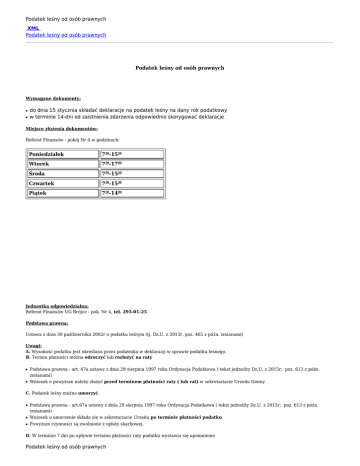 Podatek leśny od osób prawnych XML Podatek leśny od osób prawnych Podatek leśny od osób prawnych Wymagane dokumenty: ● ● do dnia 15 stycznia składać deklaracje na podatek leśny na dany rok podatkowy w terminie 14-dni od zaistnienia zdarzenia odpowiednio skorygować deklaracje Miejsce złożenia dokumentów: Referat Finansów - pokój Nr 4 w godzinach: Poniedziałek 730-1530 Wtorek 730-1700 Środa 730-1530 Czwartek 730-1530 Piątek 730-1400 Jednostka odpowiedzialna: Referat Finansów UG Brójce - pok. Nr 4, tel. 295-01-25 Podstawa prawna: Ustawa z dnia 30 października 2002r o podatku leśnym (tj. Dz.U. z 2013r, poz. 465 z późn. zmianami) Uwagi: A. Wysokość podatku jest określana przez podatnika w deklaracji w sprawie podatku leśnego. B. Termin płatności można odroczyć lub rozłożyć na raty ● ● Podstawa prawna - art. 67a ustawy z dnia 29 sierpnia 1997 roku Ordynacja Podatkowa ( tekst jednolity Dz.U. z 2015r; poz. 613 z późn. zmianami) Wniosek o powyższe należy złożyć przed terminem płatności raty ( lub rat) w sekretariacie Urzedu Gminy C. Podatek leśny można umorzyć. ● ● ● Podstawa prawna - art.67a ustawy z dnia 29 sierpnia 1997 roku Ordynacja Podatkowa ( tekst jednolity Dz.U. z 2015r; poz. 613 z późn. zmianami) Wniosek o umorzenie składa się w sekretariacie Urzędu po terminie płatności podatku Powyższe czynności są zwolnione z opłaty skarbowej. D. W terminie 7 dni po upływie terminu płatności raty podatku wystawia się upomnienie Podatek leśny od osób prawnych Podatek leśny od osób prawnych Należność winna być uregulowana w terminie 7 dni. W przypadku dalszego uchylania się od zapłaty wystawia się tytuł wykonawczy przesyłany do Urzędu Skarbowego Łódź-Widzew w celu podjęcia czynności egzekucyjnych. E. Terminy płatności podatku leśnego określa art. 6 ust. 5 pkt 3 ustawy z dnia 30 października 2002r o podatku leśnym (tj. Dz.U. z 2013r, poz. 465 z późn. zmianami) Podatek płatny jest w 12 ratach miesięcznych w terminie do dnia 15 każdego miesiąca. Raty podatku leśnego wpłaca się bez wezwania. F. Wpłaty Należy dokonywać na konto Urzędu Gminy w Brójcach - Nr Konta - Bank Spółdzielczy w Andrespolu - 22 8781 0006 0060 0141 2000 0020 Podmiot publikujący Urząd Gminy Brójce Wytworzył Anna Cieplucha - inspektor 2009-03-09 Publikujący Admin Administrator Admin Rejestr zmian Podatek leśny od osób prawnych 2009-03-09 12:34