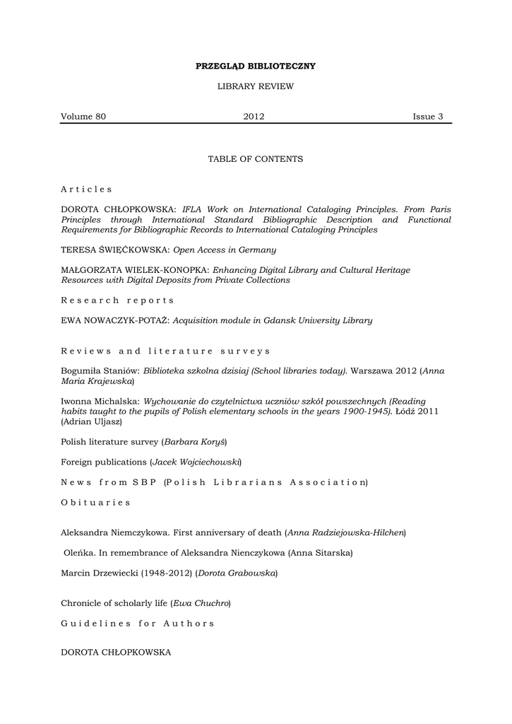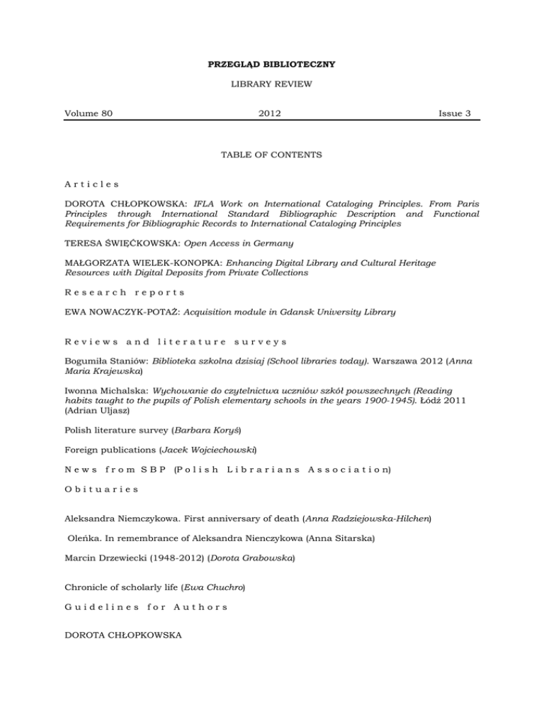 PRZEGLĄD BIBLIOTECZNY LIBRARY REVIEW Volume 80 2012 Issue 3 TABLE OF CONTENTS Articles DOROTA CHŁOPKOWSKA: IFLA Work on International Cataloging Principles. From Paris Principles through International Standard Bibliographic Description and Functional Requirements for Bibliographic Records to International Cataloging Principles TERESA ŚWIĘĆKOWSKA: Open Access in Germany MAŁGORZATA WIELEK-KONOPKA: Enhancing Digital Library and Cultural Heritage Resources with Digital Deposits from Private Collections Research reports EWA NOWACZYK-POTAŻ: Acquisition module in Gdansk University Library Reviews and literature surveys Bogumiła Staniów: Biblioteka szkolna dzisiaj (School libraries today). Warszawa 2012 (Anna Maria Krajewska) Iwonna Michalska: Wychowanie do czytelnictwa uczniów szkół powszechnych (Reading habits taught to the pupils of Polish elementary schools in the years 1900-1945). Łódź 2011 (Adrian Uljasz) Polish literature survey (Barbara Koryś) Foreign publications (Jacek Wojciechowski) N e w s f r o m S B P (P o l i s h L i b r a r i a n s A s s o c i a t i o n) Obituaries Aleksandra Niemczykowa. First anniversary of death (Anna Radziejowska-Hilchen) Oleńka. In remembrance of Aleksandra Nienczykowa (Anna Sitarska) Marcin Drzewiecki (1948-2012) (Dorota Grabowska) Chronicle of scholarly life (Ewa Chuchro) Guidelines for Authors DOROTA CHŁOPKOWSKA Institute of Library and Information Science Wroclaw University e-mail: [email protected] IFLA WORK ON INTERNATIONAL CATALOGING PRINCIPLES. FROM PARIS PRINCIPLES THROUGH INTERNATIONAL STANDARD BIBLIOGRAPHIC DESCRIPTION AND FUNCTIONAL REQUIREMENTS FOR BIBLIOGRAPHIC RECORDS TO INTERNATIONAL CATALOGING PRINCIPLES KEYWORDS: Cataloging. Cataloging principles. IFLA. ISBD. ICP. FRBR. ISADN. ABSTRACT: Objective – The author presents changes in international cataloging principles influenced by IFLA since 1960s and current trends in the development of rules for bibliographic description. Methodology – The article is based on the analysis of the literature and selected results of a survey conducted by the author for her PhD thesis. Results and conclusions – The need for standardization and dissemination of uniform rules of bibliographic description and access points (headings) were influenced by the technological revolution in the second half of 20th century and beginning of 21st century. IFLA activities conducted in the international field since 1950s helped to standardize bibliographic description (ISBD), authority entries (ISADN – International Standard Authority Data Number, VIAF – Virtual International Authority File), requirements for bibliographic records (FRBR – Functional Requirements for Bibliographic Records) and general cataloging principles (Paris Principles, ICP – International Cataloguing Principles). Standards are introduced to simplify the exchange of bibliographic information in the electronic environment and adjust the display of bibliographic data to the changing needs of information users. TERESA ŚWIĘĆKOWSKA Institute of Information and Book Studies The University of Warsaw e-mail: [email protected] OPEN ACCESS IN GERMANY KEYWORDS: Open Access. Germany. Green approach. Gold approach. Repositories. Scholarly communication. Open science. ABSTRACT: Objective – The author discusses current status of Open Access (OA) in Germany, methods of promoting OA and some implementation cases. Methodology – The article is based on the analysis of the literature in the field, source texts such as OA programs and initiatives and letters exchanged with representatives of selected German institutions involved in OA development. Results and conclusions – In Germany most important scholarly institutions support both green and gold approach in OA. All OA mandates are guidelines implemented through the development of the infrastructure and financial support of publishing process. Further acceleration of OA development is considered to be possible with changes in copyright. MAŁGORZATA WIELEK-KONOPKA Jagiellonian Library e-mail: [email protected] ENHANCING DIGITAL LIBRARY AND CULTURAL HERITAGE RESOURCES WITH DIGITAL DEPOSITS FROM PRIVATE COLLECTIONS KEYWORDS: Digital deposits. Private collections. Digitization. Protection of cultural heritage. Poland. Origin of digital resources. ABSTRACT: Objective – The author points to the need for the inclusion of digitized private bibliophilic collections into Polish digital library resources and attempts to evaluate the presence of that type of documents in Polish digital libraries. Methodology – Based on the analysis of town information portals, local press published on Internet and documents published on the websites of digital libraries, National Digital Archives and National Audiovisual Institute an attempt was made to evaluate the interest of digital libraries in the digitization of private bibliophilic collections. The presence of such deposits in Polish digital libraries was analyzed on the basis of the results of the survey addressed to libraries members of Polish Digital Library Federation in February 2012. The survey evaluated the amount of digital resources received from private collections, types of resources obtained from that source and rules for cooperation with private owners. Results – It was discovered that digital libraries mostly include both historical and contemporary library holdings and private collections are virtually non-existent on the list of sources for digital libraries. It is particularly well visible in the case of university digital libraries receiving their content from traditional libraries as well as digital repositories related to various institutions. Private collections are very scarce in those databases. The largest amount of private collections has been digitized so far by Wielkopolska Biblioteka Cyfrowa (Wielkopolska Digital Library) – approx. 3,000 publications (2% of all Library collections). The situation is considerably differen