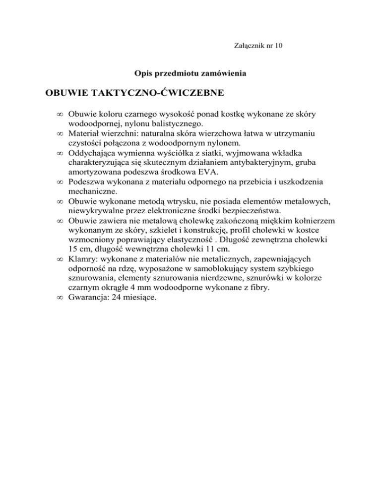 Załącznik nr 10 Opis przedmiotu zamówienia OBUWIE TAKTYCZNO-ĆWICZEBNE • Obuwie koloru czarnego wysokość ponad kostkę wykonane ze skóry wodoodpornej, nylonu balistycznego. • Materiał wierzchni: naturalna skóra wierzchowa łatwa w utrzymaniu czystości połączona z wodoodpornym nylonem. • Oddychająca wymienna wyściółka z siatki, wyjmowana wkładka charakteryzująca się skutecznym działaniem antybakteryjnym, gruba amortyzowana podeszwa środkowa EVA. • Podeszwa wykonana z materiału odpornego na przebicia i uszkodzenia mechaniczne. • Obuwie wykonane metodą wtrysku, nie posiada elementów metalowych, niewykrywalne przez elektroniczne środki bezpieczeństwa. • Obuwie zawiera nie metalową cholewkę zakończoną miękkim kołnierzem wykonanym ze skóry, szkielet i konstrukcję, profil cholewki w kostce wzmocniony poprawiający elastyczność . Długość zewnętrzna cholewki 15 cm, długość wewnętrzna cholewki 11 cm. • Klamry: wykonane z materiałów nie metalicznych, zapewniających odporność na rdzę, wyposażone w samoblokujący system szybkiego sznurowania, elementy sznurowania nierdzewne, sznurówki w kolorze czarnym okrągłe 4 mm wodoodporne wykonane z fibry. • Gwarancja: 24 miesiące. .