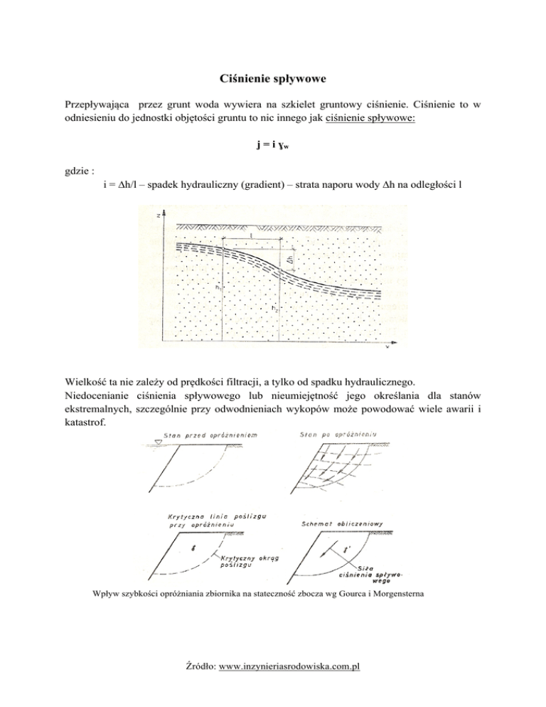 Ciśnienie spływowe Przepływająca przez grunt woda wywiera na szkielet gruntowy ciśnienie. Ciśnienie to w odniesieniu do jednostki objętości gruntu to nic innego jak ciśnienie spływowe: j = i ɣw gdzie : i = ∆h/l – spadek hydrauliczny (gradient) – strata naporu wody ∆h na odległości l Wielkość ta nie zależy od prędkości filtracji, a tylko od spadku hydraulicznego. Niedocenianie ciśnienia spływowego lub nieumiejętność jego określania dla stanów ekstremalnych, szczególnie przy odwodnieniach wykopów może powodować wiele awarii i katastrof. Wpływ szybkości opróżniania zbiornika na stateczność zbocza wg Gourca i Morgensterna Źródło: www.inzynieriasrodowiska.com.pl Zgodnie z tym rysunkiem szybkie obniżenie zwierciadła wody wywołuje bardziej krytyczny stan w zboczu naturalnym lub skarpie wykopu, niż stan istniejący przy jego całkowitym zanurzeniu w wodzie. Działa tu dodatkowa siła ciśnienia spływowego. Szybkie obniżenie zwierciadła wody wywołuje zawsze poślizg bryły odłamu. Tak też ruch wody w gruncie może spowodować duże zmiany w jego strukturze, a w następstwie doprowadzić do zmian właściwości fizyko-mechanicznych gruntów. Źródło: www.inzynieriasrodowiska.com.pl