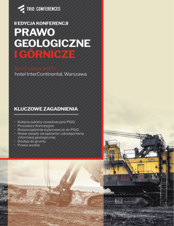 II EDYCJA KONFERENCJI PRAWO GEOLOGICZNE I GÓRNICZE 16-17 marca 2017 r. hotel InterContinental, Warszawa KLUCZOWE ZAGADNIENIA • • • • Kolejne pakiety nowelizacyjne PGiG Procedury Koncesyjne Rozporządzenia wykonawcze do PGiG Nowe zasady zarządzania i udostępniania informacji geologicznej • Dostęp do gruntu • Prawo wodne 16-17 marca 2017 r. hotel InterContinental, Warszawa Szanowni Państwo, Wspólnie z kancelarią SSW Spaczyński, Szczepaniak i Wspólnicy serdecznie zapraszamy do udziału w drugiej edycji konferencji, poświęconej analizie i dyskusji na temat obecnego i przyszłego otoczenia prawnego branży geologicznej i górniczej. W jej trakcie będą mieli Państwo okazję zapoznać się z planowanymi zmianami w obszarach związanych z m. in. • pozyskiwaniem i przedłużaniem koncesji • nabywaniem i dzierżawą gruntów w celu wykonywania działalności geologicznej i górniczej • nowymi zasadami zarządzania i udostępniania informacji geologicznej • postępowaniem środowiskowym w działalności górniczej • kwalifikacjami górniczymi • nowym prawem wodnym Powyższe zagadnienia, jak również sposobność do dyskusji i wymiany doświadczeń, zapewni doskonałe grono prelegentów, reprezentujących takie firmy i instytucje, jak: Polskie Górnictwo Naftowe i Gazownictwo, KGHM, Ecoland, Colas Kruszywa, Górniczą Izbę Przemysłowo-Handlową, Akademię Górniczo-Hutniczą, Wyższy Urząd Górniczy. Udział w konferencji to nie tylko możliwość zasięgnięcia opinii i zdobycia wiedzy z najwyższej półki, ale i doskonała okazja do odnowienia starych i nawiązania nowych kontaktów biznesowych. Sprzyjać temu będzie bankiet na koniec pierwszego dnia konferencji. Serdecznie zapraszamy do zapoznania się ze szczegółami agendy i rejestracji swojego udziału już dziś! Zostań Partnerem: Anna Piotrowska Senior Associate, LL.M., SSW kom. +48 664 445 107 [email protected] Joanna Jamka Dyrektor ds. konferencji kom. +48 500 161 297 [email protected] Hotel InterContinental przygotował specjalną ofertę dla uczestników konferencji: przy ,, rezerwacji do 15.02.2017 r. na hasło ,,Konferencja PGiG specjalna cena za pokój jednoosobowy ze śniadaniem wyniesie 460 zł netto. Organizatorzy Patroni medialni Robert Szpindler Business Development Manager kom. +48 519 407 698 [email protected] Patronat PROGRAM KONFERENCJI Dzień I, 16 marca 2017 r., czwartek 9:30 Rejestracja, poranna kawa 10:00 Uroczyste otwarcie konferencji, powitanie uczestników 10:10 Prelekcja inaugurująca Konferencję Ireneusz Zyska, Poseł na Sejm RP, Przewodniczący Parlamentarnego Zespołu Górnictwa i Energii 10:30 Quo vadis Polonia? Aktualna sytuacja na polskim rynku geologii i górnictwa (węgiel, węglowodory, metale; nowe technologie) • • • • 11:00 Kolejne pakiety nowelizacyjne PGiG Najważniejsze problemy branży geologicznej i górniczej Obciążenia fiskalne działalności geologicznej i górniczej Nowelizacje przepisów pokrewnych: Prawo wodne, Prawo zamówień publicznych Piotr Spaczyński, Partner, Radca Prawny, SSW Spaczyński, Szczepaniak i Wspólnicy Umowy dzierżawy – jak skutecznie zabezpieczyć dostęp do gruntu • • • • Umowy dzierżawy z nadleśnictwami Na kim spoczywa obowiązek rekultywacji gruntów Kiedy uzyskać decyzję rekultywacyjną – wymogi prawa a praktyka OUG Wytyczne dot. wzorów umów dzierżawy zawieranych z Lasami Polskimi 11:45 Przerwa na kawę 12:00 Wybrane problemy w stosowaniu Prawa geologicznego i górniczego • • • • 12:45 Znowelizowane i nowe rozporządzenia wykonawcze do ustawy Ruch zakładu górniczego, bezpieczeństwo i higiena pracy Przedłużanie i zmiana koncesji węglowodorowych Postępowanie kwalifikacyjne – doświadczenie PGNiG Maciej Nowakowski, Dyrektor Wsparcia Prac Geologicznych Oddziału Geologii i Eksploatacji PGNiG SA Bariery funkcjonowania górnictwa węgla kamiennego wynikające z Prawa geologicznego i górniczego ze szczególnym uwzględnieniem procesu koncesyjnego • Przedłużenie koncesji wydobywczych • Opłaty i inne obciążenia przedsiębiorców górniczych nałożone ustawą PGiG • Propozycje rozwiązań prawnych Janusz Olszowski, Prezes, Górnicza Izba Przemysłowo-Handlowa 13:30 lunch PROGRAM KONFERENCJI Dzień I, 16 marca 2017 r., czwartek 14:30 Nowe zasady zarządzania i udostępniania informacji geologicznej • • • • 15:15 Obowiązki przedsiębiorcy dot. sprawozdawczości w zakresie informacji geologicznej Prawo do informacji geologicznej a prawo autorskie Przechowywanie informacji geologicznej w trakcie dokumentowania prac Przekazywanie informacji geologicznej do organów administracji geologicznej Anita Palukiewicz, Radca Prawny, SSW Spaczyński, Szczepaniak i Wspólnicy Polska polityka surowcowa a ochrona złóż • Zabezpieczenie złoża pod kątem rozbudowy infrastruktury nad złożem dr Maciej Kruś, Of Counsel, Radca Prawny, SSW Spaczyński, Sczepaniak i Wspólnicy 16:00 Przerwa na kawę 16:15 Strategiczne uwarunkowania formalno-prawne i techniczne dla rozwoju górnictwa odkrywkowego w Polsce • Stan górnictwa odkrywkowego i perspektywa rozwoju • Uwarunkowania w postaci „kroków milowych”, których wdrożenie winno przyczynić się do kontynuacji i rozwoju górnictwa odkrywkowego w Polsce • Zielone i inteligentne górnictwo odkrywkowe, to szansa na rozwój na następne dekady XXI wieku prof. dr hab. inż. Zbigniew Kasztelewicz, Kierownik Katedry Górnictwa Odkrywkowego Akademia Górniczo-Hutnicza 17:00 Zakończenie pierwszego dnia Konferencji 19:00 Uroczysta kolacja Doskonała okazja do odświeżenia dotychczasowych i nawiązania nowych kontaktów biznesowych oraz rozmów w kuluarach! PROGRAM KONFERENCJI Dzień II, 17 marca 2017 r., piątek 9:00 Poranna kawa, rejestracja uczestników II dnia 9:20 Uroczyste otwarcie drugiego dnia konferencji 9:30 Aktualna sytuacja na rynku węglowodorów Piotr Woźniak, Prezes Zarządu PGNiG SA 9:45 Otoczenie prawne poszukiwania i