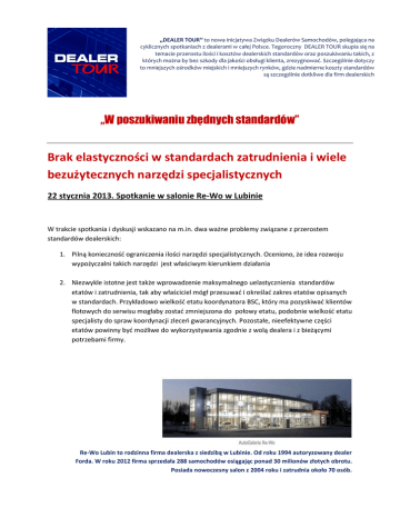 „DEALER TOUR” to nowa inicjatywa Związku Dealerów Samochodów, polegająca na cyklicznych spotkaniach z dealerami w całej Polsce. Tegoroczny DEALER TOUR skupia się na temacie przerostu ilości i kosztów dealerskich standardów oraz poszukiwaniu takich, z których można by bez szkody dla jakości obsługi klienta, zrezygnować. Szczególnie dotyczy to mniejszych ośrodków miejskich i mniejszych rynków, gdzie nadmierne koszty standardów są szczególnie dotkliwe dla firm dealerskich „W poszukiwaniu zbędnych standardów” Brak elastyczności w standardach zatrudnienia i wiele bezużytecznych narzędzi specjalistycznych 22 stycznia 2013. Spotkanie w salonie Re-Wo w Lubinie W trakcie spotkania i dyskusji wskazano na m.in. dwa ważne problemy związane z przerostem standardów dealerskich: 1. Pilną konieczność ograniczenia ilości narzędzi specjalistycznych. Oceniono, że idea rozwoju wypożyczalni takich narzędzi jest właściwym kierunkiem działania 2. Niezwykle istotne jest także wprowadzenie maksymalnego uelastycznienia standardów etatów i zatrudnienia, tak aby właściciel mógł przesuwać i określać zakres etatów opisanych w standardach. Przykładowo wielkość etatu koordynatora BSC, który ma pozyskiwać klientów flotowych do serwisu mogłaby zostać zmniejszona do połowy etatu, podobnie wielkość etatu specjalisty do spraw koordynacji zleceń gwarancyjnych. Pozostałe, nieefektywne części etatów powinny być możliwe do wykorzystywania zgodnie z wolą dealera i z bieżącymi potrzebami firmy. Re-Wo Lubin to rodzinna firma dealerska z siedzibą w Lubinie. Od roku 1994 autoryzowany dealer Forda. W roku 2012 firma sprzedała 288 samochodów osiągając ponad 30 milionów złotych obrotu. Posiada nowoczesny salon z 2004 roku i zatrudnia około 70 osób.