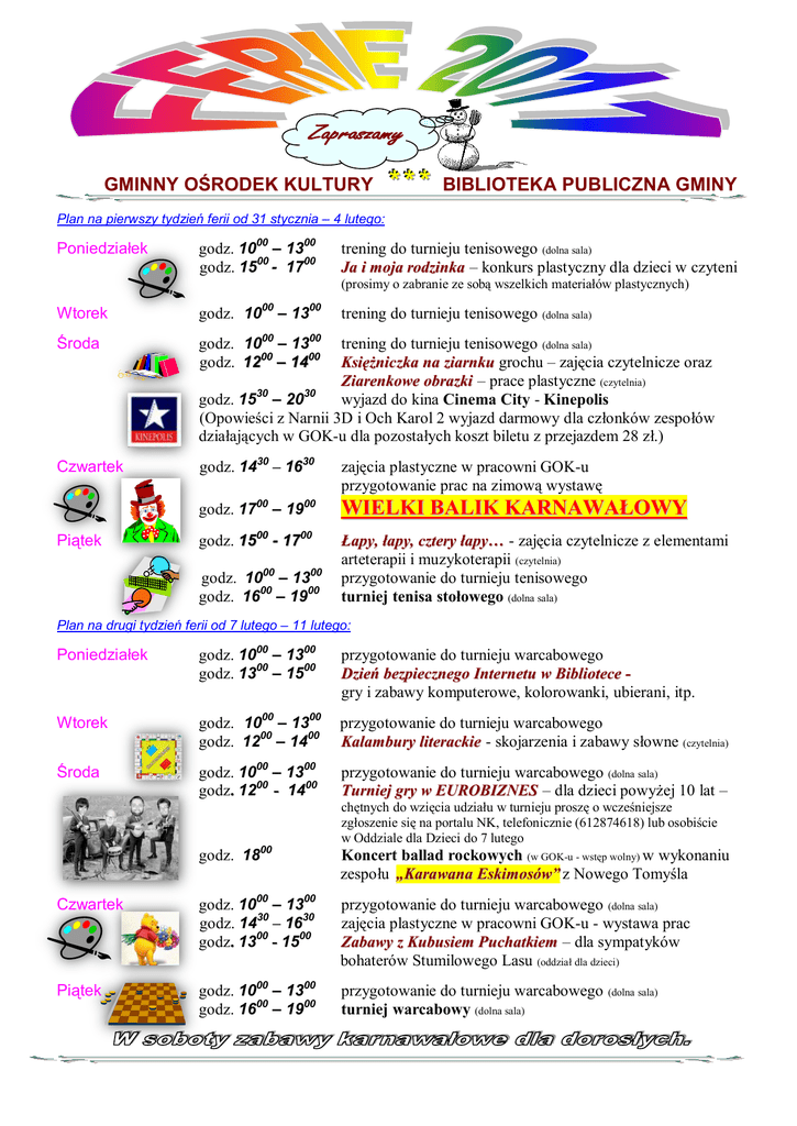 Zapraszamy GMINNY OŚRODEK KULTURY *** BIBLIOTEKA PUBLICZNA GMINY Plan na pierwszy tydzień ferii od 31 stycznia – 4 lutego: Poniedziałek godz. 1000 – 1300 godz. 1500 - 1700 trening do turnieju tenisowego (dolna sala) Ja i moja rodzinka – konkurs plastyczny dla dzieci w czyteni (prosimy o zabranie ze sobą wszelkich materiałów plastycznych) Wtorek godz. 1000 – 1300 Środa godz. 1000 – 1300 godz. 1200 – 1400 Czwartek godz. 1430 – 1630 zajęcia plastyczne w pracowni GOK-u przygotowanie prac na zimową wystawę godz. 1700 – 1900 WIELKI BALIK KARNAWAŁOWY godz. 1500 - 1700 Łapy, łapy, cztery łapy… - zajęcia czytelnicze z elementami arteterapii i muzykoterapii (czytelnia) przygotowanie do turnieju tenisowego turniej tenisa stołowego (dolna sala) Piątek trening do turnieju tenisowego (dolna sala) trening do turnieju tenisowego (dolna sala) Księżniczka na ziarnku grochu – zajęcia czytelnicze oraz Ziarenkowe obrazki – prace plastyczne (czytelnia) godz. 1530 – 2030 wyjazd do kina Cinema City - Kinepolis (Opowieści z Narnii 3D i Och Karol 2 wyjazd darmowy dla członków zespołów działających w GOK-u dla pozostałych koszt biletu z przejazdem 28 zł.) godz. 1000 – 1300 godz. 1600 – 1900 Plan na drugi tydzień ferii od 7 lutego – 11 lutego: Poniedziałek godz. 1000 – 1300 godz. 1300 – 1500 przygotowanie do turnieju warcabowego Dzień bezpiecznego Internetu w Bibliotece gry i zabawy komputerowe, kolorowanki, ubierani, itp. Wtorek godz. 1000 – 1300 godz. 1200 – 1400 przygotowanie do turnieju warcabowego Kalambury literackie - skojarzenia i zabawy słowne (czytelnia) Środa godz. 1000 – 1300 godz.. 1200 - 1400 przygotowanie do turnieju warcabowego (dolna sala) Turniej gry w EUROBIZNES – dla dzieci powyżej 10 lat – godz. 1800 Koncert ballad rockowych (w GOK-u - wstęp wolny) w wykonaniu zespołu „Karawana Eskimosów” z Nowego Tomyśla Czwartek godz. 1000 – 1300 godz. 1430 – 1630 godz.. 1300 - 1500 przygotowanie do turnieju warcabowego (dolna sala) zajęcia plastyczne w pracowni GOK-u - wystawa prac Zabawy z Kubusiem Puchatkiem – dla sympatyków bohaterów Stumilowego Lasu (oddział dla dzieci) Piątek godz. 1000 – 1300 godz. 1600 – 1900 przygotowanie do turnieju warcabowego (dolna sala) turniej warcabowy (dolna sala) chętnych do wzięcia udziału w turnieju proszę o wcześniejsze zgłoszenie się na portalu NK, telefonicznie (612874618) lub osobiście w Oddziale dla Dzieci do 7 lutego