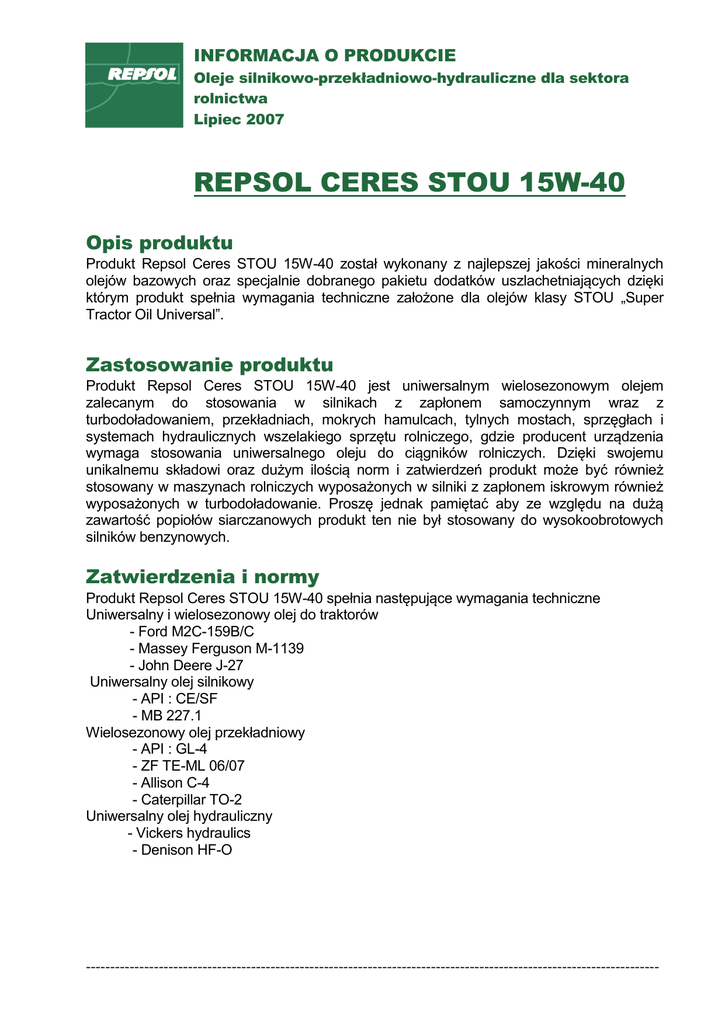 INFORMACJA O PRODUKCIE Oleje silnikowo-przekładniowo-hydrauliczne dla sektora rolnictwa Lipiec 2007 REPSOL CERES STOU 15W-40 Opis produktu Produkt Repsol Ceres STOU 15W-40 został wykonany z najlepszej jakości mineralnych olejów bazowych oraz specjalnie dobranego pakietu dodatków uszlachetniających dzięki którym produkt spełnia wymagania techniczne założone dla olejów klasy STOU „Super Tractor Oil Universal”. Zastosowanie produktu Produkt Repsol Ceres STOU 15W-40 jest uniwersalnym wielosezonowym olejem zalecanym do stosowania w silnikach z zapłonem samoczynnym wraz z turbodoładowaniem, przekładniach, mokrych hamulcach, tylnych mostach, sprzęgłach i systemach hydraulicznych wszelakiego sprzętu rolniczego, gdzie producent urządzenia wymaga stosowania uniwersalnego oleju do ciągników rolniczych. Dzięki swojemu unikalnemu składowi oraz dużym ilością norm i zatwierdzeń produkt może być również stosowany w maszynach rolniczych wyposażonych w silniki z zapłonem iskrowym również wyposażonych w turbodoładowanie. Proszę jednak pamiętać aby ze względu na dużą zawartość popiołów siarczanowych produkt ten nie był stosowany do wysokoobrotowych silników benzynowych. Zatwierdzenia i normy Produkt Repsol Ceres STOU 15W-40 spełnia następujące wymagania techniczne Uniwersalny i wielosezonowy olej do traktorów - Ford M2C-159B/C - Massey Ferguson M-1139 - John Deere J-27 Uniwersalny olej silnikowy - API : CE/SF - MB 227.1 Wielosezonowy olej przekładniowy - API : GL-4 - ZF TE-ML 06/07 - Allison C-4 - Caterpillar TO-2 Uniwersalny olej hydrauliczny - Vickers hydraulics - Denison HF-O ---------------------------------------------------------------------------------------------------------------------- INFORMACJA O PRODUKCIE Oleje silnikowo-przekładniowo-hydrauliczne dla sektora rolnictwa Lipiec 2007 REPSOL CERES STOU 15W-40 Bezpieczeństwo użytkowania produktu Karta Bezpieczeństwa produkt Repsol Ceres STOU 15W-40 przygotowana w oparciu o zgodność z aktualnymi wymaganiami prawa wraz z dyrektywą REACH jest dostępna na każde życzenie klienta. Charakterystyka techniczna Wszystkie poniższe charakterystyczne dane techniczne są wielkościami typowymi. Szczegółowe i dokładne dane techniczne mogą być przedstawione w certyfikatach dostępnych na życzenie dla konkretnego numeru partii produkcyjnej. Repsol Ceres STOU 15W-40 Jednostka Metoda badawcza Klasyfkacja wg SAE Wartość 15W-40 Gęstość w temperaturze 15°C g/cm3 ASTM D 4052 0,887 Lepkość w temperaturze 100 °C cSt ASTM D 445 13,2 Lepkość w temperaturze 40 °C cSt ASTM D 445 98 Lepkość w temperaturze -20 °C cP ASTM D 5293 7000 max. - ASTM D 2270 124 min. Temperatura zapłonu (COC) °C ASTM D 92 215 min. Temperatura płynięcia °C ASTM D 97 -30 mg KOH/g ASTM D 2896 10 % wagi ASTM D 874 1,5 % wagi DIN 51581 13 max. cSt ASTM D 3945 12 min. Wskaźnik lepkości T.B.N. Zawartość Popiołu Siarczanowego Wskażnik lotnosći wg Noack'a, 1h.250 °C Test na ścinanie (Shear Stability Injector),100 °C Bosch ----------------------------------------------------------------------------------------------------------------------