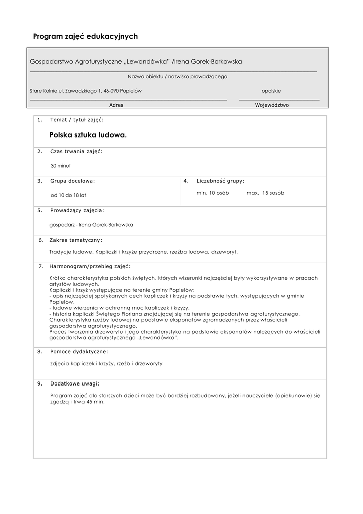 Program zajęć edukacyjnych Gospodarstwo Agroturystyczne „Lewandówka” /Irena Gorek-Borkowska ______________________________________________________________________________________________________________________ Nazwa obiektu / nazwisko prowadzącego Stare Kolnie ul. Zawadzkiego 1, 46-090 Popielów _________________________________________________________________________________ Adres 1. opolskie _________________________________ Województwo Temat / tytuł zajęć: Polska sztuka ludowa. 2. Czas trwania zajęć: 30 minut 3. Grupa docelowa: od 10 do 18 lat 5. 4. Liczebność grupy: min. 10 osób max. 15 sosób Prowadzący zajęcia: gospodarz - Irena Gorek-Borkowska 6. Zakres tematyczny: Tradycje ludowe. Kapliczki i krzyże przydrożne, rzeźba ludowa, drzeworyt. 7. Harmonogram/przebieg zajęć: Krótka charakterystyka polskich świętych, których wizerunki najczęściej były wykorzystywane w pracach artystów ludowych. Kapliczki i krzyż występujące na terenie gminy Popielów: - opis najczęściej spotykanych cech kapliczek i krzyży na podstawie tych, występujących w gminie Popielów, - ludowe wierzenia w ochronną moc kapliczek i krzyży, - historia kapliczki Świętego Floriana znajdującej się na terenie gospodarstwa agroturystycznego. Charakterystyka rzeźby ludowej na podstawie eksponatów zgromadzonych przez właścicieli gospodarstwa agroturystycznego. Proces tworzenia drzeworytu i jego charakterystyka na podstawie eksponatów należących do właścicieli gospodarstwa agroturystycznego „Lewandówka”. 8. Pomoce dydaktyczne: zdjęcia kapliczek i krzyży, rzeźb i drzeworyty 9. Dodatkowe uwagi: Program zajęć dla starszych dzieci może być bardziej rozbudowany, jeżeli nauczyciele (opiekunowie) się zgodzą i trwa 45 min.