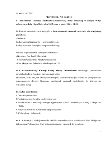 O. 0012.3.13.2012 PROTOKÓŁ NR 13/2012 z posiedzenia Komisji Społeczno-Gospodarczej Rady Miejskiej w Książu Wlkp. odbytego w dniu 10 października 2012 roku w godz. 9,00 – 11,20. W Komisji uczestniczyło 6 radnych - lista obecności, stanowi załącznik do niniejszego protokołu. Nieobecni: Radny Leszek Kaczmarek - usprawiedliwiony Radny Sławomir Przybylski - usprawiedliwiony, Ponadto w posiedzeniu Komisji uczestniczyli: - Burmistrz Pan Teofil Marciniak, - Sekretarz Gminy Pani Mirela Grześkowiak - Pani Małgorzata Zakrzewska Podinspektor UM. ad.1. Przewodniczący Komisji Radny Maciej Lewandowski otwierając posiedzenie powitał członków Komisji i zaproszonych gości. Stwierdził, że na sali jest obecnych 6 radnych, zatem komisja jest władna do podejmowania prawomocnych decyzji. Następnie przedstawił porządek posiedzenie, do którego nie wniesiono uwag. Porządek posiedzenia: 1.Otwarcie posiedzenia. 2.Funkcjonowanie świetlic środowiskowych. 3.Sprawozdanie z realizacji letniego wypoczynku dzieci i młodzieży szkolnej – akcja lato 2012. 4.Przyjęcie protokołu z poprzedniego posiedzenia. 5.Wolne głosy i informacje. ad.2. Informację z funkcjonowania świetlic środowiskowych przedstawiła Pani Małgorzata Zakrzewska Podinspektor UM. Informacja stanowi załącznik do protokołu. 1 Burmistrz poinformował, że w świetlicy w Kołacinie w tym roku będzie remont sanitariatów i pozostanie do remontu jeszcze świetlica w Mchach. Radny Lewandowski – świetlica w Mchach miała być przeniesiona do szkoły. Burmistrz – mieszkańcy chcą zająć się świetlicą, chcą by przekazać im pomieszczenie po poczcie, które wyremontowaliby ze środków funduszu sołeckiego. Wtedy my zajęlibyśmy się remontem świetlicy środowiskowej a wioska świetlicą wiejską. Radny Lewandowski – swego czasu mówiliśmy, aby ze środków funduszy przeciwalkoholowych dofinansować kluby sportowe. Burmistrz – ze środków tych mają być zakupione bramki na boisko we Włościejewicach. Radny Mądry – w Mchach bramki nie mają certyfikatu, nie wiem czy będzie załatwiony. Radna Jankowiak – czy opiekunki świetlic, też są opłacane ze środków przeciwalkoholowych. Pani Grześkowiak – tak, opłacane są z tych środków. Ponieważ więcej głosów w dyskusji nie było, Przewodniczący Komisji podziękował za złożoną informację. ad.3. Sprawozdanie z realizacji letniego wypoczynku dzieci i młodzieży szkolnej – akcja lato 2012 złożyła Pani Mariola Kaźmierczak Dyrektor Centrum Kultury w Książu Wlkp. Informacja stanowi załącznik do niniejszego protokołu. W dyskusji Radny Mostowski zwrócił się z zapytaniem kto decydował o doborze zespołów na Dni Książa. Burmistrz – Pani Dyrektor CK przedstawiła oferty i wspólnie z Centrum Kultury wybraliśmy te zespoły. Radny Mostowski – w jakiej formie są realizowane płatności dla zespołów. Pani Kaźmierczak – za występ Pani Markowskiej i zespołu Zakopower płaciliśmy przelewem, zaś zespołowi Big-Cyc część płaciliśmy przelewem a część gotówką. Radny Mostowski – czy Pani mąż malował Centrum Kultury. Pani Kaźmierczak – tak malował, ale w formie wolontariatu, ale nie jako mąż, wtedy był przyjacielem. Radny Mostowski – dlaczego Pan Madaliński został zwolniony z pracy. Pani Kaźmierczak – Pan Madaliński nie został zwolniony, wygasła mu umowa o pracę a nie przedłużono ponieważ nie sprawdzał się. Od stycznia została zatrudniona inna osoba. Radny Mostowski – dlaczego zabawa była 6 maja a nie 1 czy 3 maja. 2 Pani Kaźmierczak – nie pracowałam w tym okresie, dlatego poproszę Panią Zastępcę o wyjaśnienie. Radny Mostowski – ile kosztuje rozłożenie sceny i jaka firma to robi. Pani Kaźmierczak – koszt wynosi 800 złotych i jest to firma ze Śremu. Radny Mostowski – czy rozważa Pani inne możliwości. Pani Kaźmierczak – tak rozważam, jestem w trakcie rozmów z firmą „Kalia” z Książa Wlkp. Radny Lewandowski – rozmawiałem też o szkoleniu w tym zakresie, ponieważ szkolenie kosztuje 2000 zł. bez względu na ilość osób biorących w nim udział, może warto byłoby z tego skorzystać. Radny Mostowski – jak układa się wspólpraca z OSP. Pani Kaźmierczak – z OSP współpraca układa się dobrze, gorzej z gospodarzem. Radny Mostowski – jak układa się współpraca z orkiestrą dętą. Pani Kaźmierczak – według mnie układa się dobrze, zatrudniony jest jako instruktor emeryt który pracował w filharmonii, zakupujemy też instrumenty. Radny Szymański – dwa razy byłem w CK gdy był instruktor i myślę, że daje to dużo. Jeśli będą organizowane zabawy, to proszę organizować w soboty. Radny Mostowski – pytałem się Panią czy po Dniach Książa planuje się zorganizować imprezę dla młodzieży, była odpowiedź, że tak. Dlaczego impreza nie odbyła się. Pani Kaźmierczak – impreza nie została zorganizowana ze względu na brak środków. Ponieważ więcej głosów w dyskusji nie było, Przewodniczący Komisji podziękował za złożoną informację. ad.4. Protokół nr 12/2012 z dnia 27 czerwca 2012 roku został przyjęty bez uwag – jednogłośnie. ad.5.Wolne głosy i informacje. Radny Maciej Lewandowski – czy będą sankcje karne za nie wykonanie w terminie zatok autobusowych. Burmistrz – kary będą naliczane zgodnie z umowa. Radny Lewandowski – jako komisja rewizyjna mieliśmy uwagi do modernizacji Palcu Kosynierów, czy zrealizowano wnioski i zalecenia komisji. Burmistrz – drobne usterki naprawiono, wiem też, że Pan Janicki przekazał 12 000 zł. na zakup i wymianę lamp przy fontannie. 3 Radny Szymański – kostka na rynku powinna być zamulona. Radny Kuderczak – fontanna w pełni działała 3 miesiące, nie świeci też iluminacja pomnika. Radny Mostowski – wczoraj na komisji działy się rzeczy niebywałe. Dyrektor Zakładu Usług Komunalnych zarzucił koledze Radnemu brak obiektywizmu w swych wypowie
