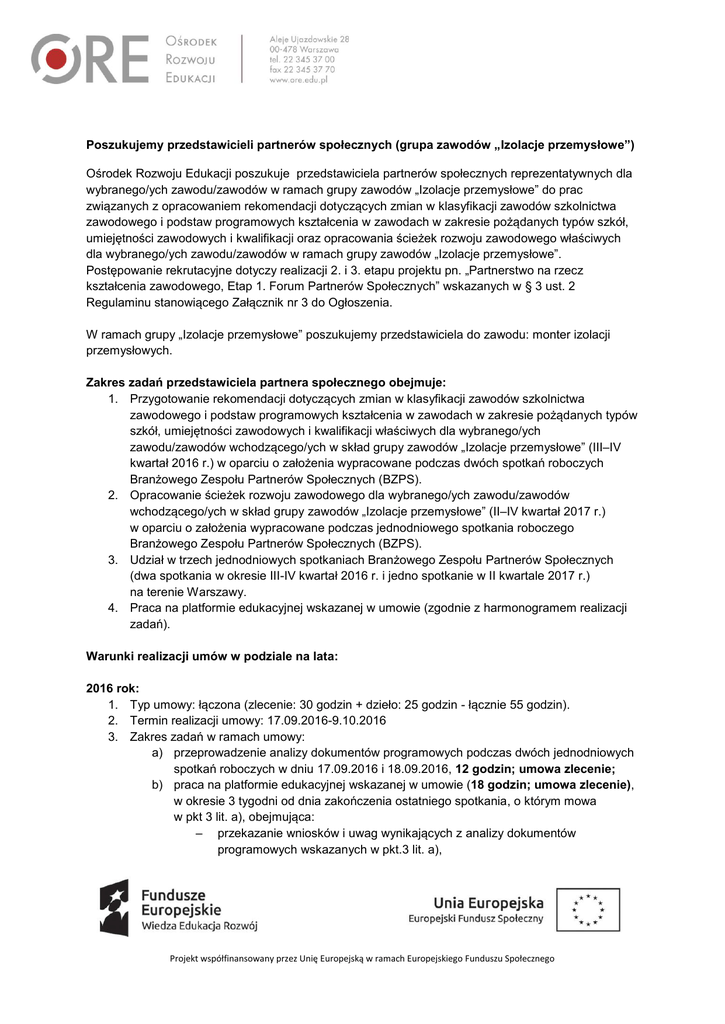 Poszukujemy przedstawicieli partnerów społecznych (grupa zawodów „Izolacje przemysłowe”) Ośrodek Rozwoju Edukacji poszukuje przedstawiciela partnerów społecznych reprezentatywnych dla wybranego/ych zawodu/zawodów w ramach grupy zawodów „Izolacje przemysłowe” do prac związanych z opracowaniem rekomendacji dotyczących zmian w klasyfikacji zawodów szkolnictwa zawodowego i podstaw programowych kształcenia w zawodach w zakresie pożądanych typów szkół, umiejętności zawodowych i kwalifikacji oraz opracowania ścieżek rozwoju zawodowego właściwych dla wybranego/ych zawodu/zawodów w ramach grupy zawodów „Izolacje przemysłowe”. Postępowanie rekrutacyjne dotyczy realizacji 2. i 3. etapu projektu pn. „Partnerstwo na rzecz kształcenia zawodowego, Etap 1. Forum Partnerów Społecznych” wskazanych w § 3 ust. 2 Regulaminu stanowiącego Załącznik nr 3 do Ogłoszenia. W ramach grupy „Izolacje przemysłowe” poszukujemy przedstawiciela do zawodu: monter izolacji przemysłowych. Zakres zadań przedstawiciela partnera społecznego obejmuje: 1. Przygotowanie rekomendacji dotyczących zmian w klasyfikacji zawodów szkolnictwa zawodowego i podstaw programowych kształcenia w zawodach w zakresie pożądanych typów szkół, umiejętności zawodowych i kwalifikacji właściwych dla wybranego/ych zawodu/zawodów wchodzącego/ych w skład grupy zawodów „Izolacje przemysłowe” (III–IV kwartał 2016 r.) w oparciu o założenia wypracowane podczas dwóch spotkań roboczych Branżowego Zespołu Partnerów Społecznych (BZPS). 2. Opracowanie ścieżek rozwoju zawodowego dla wybranego/ych zawodu/zawodów wchodzącego/ych w skład grupy zawodów „Izolacje przemysłowe” (II–IV kwartał 2017 r.) w oparciu o założenia wypracowane podczas jednodniowego spotkania roboczego Branżowego Zespołu Partnerów Społecznych (BZPS). 3. Udział w trzech jednodniowych spotkaniach Branżowego Zespołu Partnerów Społecznych (dwa spotkania w okresie III-IV kwartał 2016 r. i jedno spotkanie w II kwartale 2017 r.) na terenie Warszawy. 4. Praca na platformie edukacyjnej wskazanej w umowie (zgodnie z harmonogramem realizacji zadań). Warunki realizacji umów w podziale na lata: 2016 rok: 1. Typ umowy: łączona (zlecenie: 30 godzin + dzieło: 25 godzin - łącznie 55 godzin). 2. Termin realizacji umowy: 17.09.2016-9.10.2016 3. Zakres zadań w ramach umowy: a) przeprowadzenie analizy dokumentów programowych podczas dwóch jednodniowych spotkań roboczych w dniu 17.09.2016 i 18.09.2016, 12 godzin; umowa zlecenie; b) praca na platformie edukacyjnej wskazanej w umowie (18 godzin; umowa zlecenie), w okresie 3 tygodni od dnia zakończenia ostatniego spotkania, o którym mowa w pkt 3 lit. a), obejmująca: – przekazanie wniosków i uwag wynikających z analizy dokumentów programowych wskazanych w pkt.3 lit. a), Projekt współfinansowany przez Unię Europejską w ramach Europejskiego Funduszu Społecznego – wypracowywanie uwag i wniosków (z pomocą narzędzia elektronicznego – ankieta online) będących podstawą przygotowania rekomendacji, – udzielanie informacji będących podstawą opracowania Raportu z prac zespołu branżowego przez moderatora; c) przygotowanie rekomendacji dotyczących zmian w klasyfikacji zawodów szkolnictwa zawodowego i podstaw programowych kształcenia w zawodach w zakresie pożądanych typów szkół, umiejętności zawodowych i kwalifikacji właściwych dla wybranego/ych zawodu/zawodów wchodzącego/ych w skład grupy zawodów „Izolacje przemysłowe”, w oparciu o założenia wypracowane podczas dwóch spotkań roboczych Branżowych Zespołów Partnerów Społecznych (BZPS) oraz wypracowane uwagi i wnioski na platformie edukacyjnej wskazanej w umowie, według szablonu w załączniku do umowy; 25 godzin; umowa o dzieło. 4. Łączna liczba godzin zaangażowania: 55 godzin. 5. Warunki finansowe: Na podstawie wniosku o dofinansowanie projektu Zamawiający określa następujący maksymalny limit kosztów na poszczególne wydatki związane z opisanym zadaniem: realizacja przedmiotu umowy: 50 zł/godzina * 55 h = 2750 zł/os. w 2016 roku. 2017 rok: 1. Typ umowy: łączona (zlecenie: 6 godzin + dzieło: 14 godzin w 2017 r. - łącznie 20 godzin). 2. Termin realizacji umowy: II-IV kwartał 2017 r. (zgodnie z harmonogramem realizacji zadań, w przypadku przekazania środków na realizację projektu na rok 2017). 3. Zakres zadań w ramach umowy: opracowanie ścieżek rozwoju zawodowego dla wybranego/ych zawodu/zawodów wchodzącego/ych w skład grupy zawodów „Izolacje przemysłowe” w oparciu o założenia wypracowane podczas jednodniowego spotkania roboczego Branżowych Zespołów Partnerów Społecznych (BZPS) oraz podczas dwudniowego konsultacyjnego seminarium branżowego, 14 godzin; typ umowy: umowa o dzieło; udział w jednodniowym spotkaniu roboczym Branżowego Zespołu Partnerów Społecznych (BZPS); 6 godzin; typ umowy: umowa zlecenie. 4. Łączna liczba godzin zaangażowania: 20 godzin. 5. Warunki finansowe: Na podstawie wniosku o dofinansowanie projektu Zamawiający określa następujący maksymalny limit kosztów na poszczególne wydatki związane z opisanym zadaniem: realizacja przedmiotu umowy: 50 zł/godzina * 20 h = 1000 zł/ os. w 2017 roku. Informacje uzupełniające: 1. Wykonawcy zobowiązani będą do przedstawiania oświadczenia w postaci protokołu o faktycznej liczbie godzin, którą przeznaczyli na realizację umowy w ujęciu miesięcznym oraz poświadczą, że łączna miesięczna liczba godzin zadań realizowanych w ramach wszystkich projektów finansowanych z funduszy strukturalnych i Funduszu Spójności Projekt współfinansowany przez Unię Europejską w ramach Europejskiego Funduszu Społecznego oraz zadań finansowanych z innych źródeł, obejmujących okres realizacji umowy zawartej z ORE nie przekracza łącznie 276 godzin miesięcznie. Jednocześnie wykonawca będzie zobowiązany do złożenia oświadczenia, że 