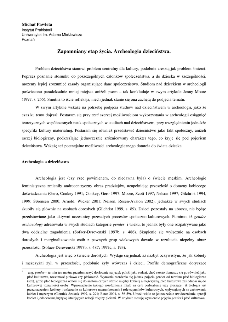 Michał Pawleta Instytut Prahistorii Uniwersytet im. Adama Mickiewicza Poznań Zapomniany etap życia. Archeologia dzieciństwa. Problem dzieciństwa stanowi problem centralny dla kultury, podobnie zresztą jak problem śmierci. Poprzez poznanie stosunku do poszczególnych członków społeczeństwa, a do dziecka w szczególności, możemy lepiej zrozumieć zasady organizujące dane społeczeństwo. Studiom nad dzieckiem w archeologii poświecono paradoksalnie mniej miejsca aniżeli psom – tak konkluduje w swym artykule Jenny Moore (1997, s. 255). Smutna to iście refleksja, niech jednak stanie się ona zachętą do podjęcia tematu. W swym artykule wskażę na potrzebę podjęcia studiów nad dzieciństwem w archeologii, jako że czas ku temu dojrzał. Postaram się przyjrzeć szerzej możliwościom wykorzystania w archeologii osiągnięć teoretycznych współczesnych nauk społecznych w studiach nad dzieciństwem, przy uwzględnieniu jednakże specyfiki kultury materialnej. Postaram się również przedstawić dzieciństwo jako fakt społeczny, aniżeli raczej biologiczny, podkreślając jednocześnie zróżnicowany charakter tego, co kryje się pod pojęciem dzieciństwa. Wskażę też potencjalne możliwości archeologicznego dotarcia do świata dziecka. Archeologia a dzieciństwo Archeologia jest (czy rzec powinienem, do niedawna była) o świecie męskim. Archeologie feministyczne zmieniły androcentryczny obraz pradziejów, uzupełniając przeszłość o domeny kobiecego doświadczenia (Gero, Conkey 1991; Conkey, Gero 1997; Moore, Scott 1997; Nelson 1997; Gilchrist 1994, 1999; Sørensen 2000; Arnold, Wicker 2001; Nelson, Rosen-Avalon 2002), jednakże w swych studiach skupiły się głównie na osobach dorosłych (Gilchrist 1999, s. 89). Dzieci pozostały na uboczu, nie będąc przedstawiane jako aktywni uczestnicy przeszłych procesów społeczno-kulturowych. Pomimo, iż gender archaeology adresowała w swych studiach kategorie gender1 i wieku, to jednak były one rozpatrywane jako dwa oddzielne zagadnienia (Sofaer-Derevenski 1997b, s. 486). Skupienie się wyłącznie na osobach dorosłych i marginalizowanie osób z pewnych grup wiekowych dawało w rezultacie niepełny obraz przeszłości (Sofaer-Derevenski 1997b, s. 487; 1997c, s. 193). Archeologia jest więc o świecie dorosłych. Wydaje się jednak aż nazbyt oczywistym, że jak kobiety i mężczyźni żyli w przeszłości, podobnie żyły wówczas i dzieci. Profile demograficzne dotyczące 1 ang. gender – termin ten można przetłumaczyć dosłownie na język polski jako rodzaj, choć często tłumaczy się go również jako płeć kulturowa, tożsamość płciowa czy płciowość. Wyraźnie rozróżnia się jednak pojęcie gender od terminu płeć biologiczna (sex), gdzie płeć biologiczna odnosi się do anatomicznych różnic między kobietą a mężczyzną, płeć kulturowa zaś odnosi się do kulturowej tożsamości osoby. Wprowadzenie takiego rozróżnienia miało na celu podważenie tezy głoszącej, iż biologia jest przeznaczeniem kobiety i wskazanie na kulturowe uwarunkowania i rolę czynników kulturowych, wpływających na zachowania kobiet i mężczyzn (Cierniak-Szóstak 1997, s. 291; Bator 2001, s. 56-59). Umożliwiało to jednocześnie uwidocznienie opresji kobiet i jednoczesną krytykę istniejących relacji między płciami. W artykule stosuję wymiennie pojęcia gender i płeć kulturowa. pradziejów wskazują na wysoką śmiertelność dzieci w przeszłości (około 50%), przy czym można oczekiwać wyższej śmiertelności w bardziej zagęszczonych populacjach (Dąbrowski 1973, s. 338). Dzieci stanowić powinny według tych obliczeń około połowy populacji pradziejowych (Chamberlain 1997). Wobec takiego stanu rzeczy należałoby sobie na wstępie uświadomić, iż dzieci uczestniczyły w przeszłych procesach społecznych, bez względu na to, czy posiadamy na poparcie tej tezy dostatecznie wiele dowodów materialnych. Tematyka dzieciństwa znalazła się poza głównym nurtem zainteresowań w archeologii z kilku powodów. Przede wszystkim problematykę dzieciństwa traktowano wyłącznie jako domenę kobiecą, w związku z czym jako coś nieistotnego (Moore 1997, s. 252). Androcentryczny charakter dyscypliny faworyzował bowiem dostrzeganie wytwórcy, myśliwego czy wojownika, przypisując tym samym mniejsze znaczenie zajęciom kobiet. Jako wytłumaczenie faktu nie uwzględniania dzieci w interpretacjach archeologicznych przywoływano często niewielką ilość reprezentatywnych źródeł, możliwych do uwzględnienia przy analizowaniu owego zagadnienia. Stanowi to istotne ograniczenie, jednak jak podkreślano wielokrotnie w literaturze przedmiotu (Sofaer-Derevenski 1997b, s. 496; 1997c, s. 193), poszukiwanie świata dziecka nie jest uwarunkowane li tylko kwestią reprezentatywności źródeł, ale stanowi głównie problem metodologiczny i odpowiednich pytań skierowanych na ten okres życia ludzkiego. W wielu opracowaniach dotyczących pradziejów pojawia się co prawda problematyka dzieci i dzieciństwa, ale dzieci postrzegane są jako pasywne, nie zaś jako aktywne podmioty. Powoduje to sytuację, w której dzieci „są”, natomiast nie działają. Szeroko podkreślano w literaturze (np. Wiślański; Czarnecka 1990), że dzieci w przeszłości pozbawione były statusu społecznego, zajmując najniższy szczebel w hierarchii społecznej, ich istnienie stanowiło wynik potrzeby zachowania ciągłości gatunku ludzkiego i zapewnienia grupie przetrwania. Dzieci rodziły się, umierały, ich ciała grzebane były pod domami, w jamach odpadowych albo na odseparowanych przestrzennie miejscach. Pochówki dzieci cechowały się zazwyczaj skromnym wyposażeniem lub w ogóle takowego nie posiadały. Dodatkowo zauważa się małą ilość ich szczątków na cmentarzyskach. W literaturze zwraca się uwagę jedynie na nieliczne pochówki dzieci, których wyposażenie odbiegało „bogactwem” i różnorodno