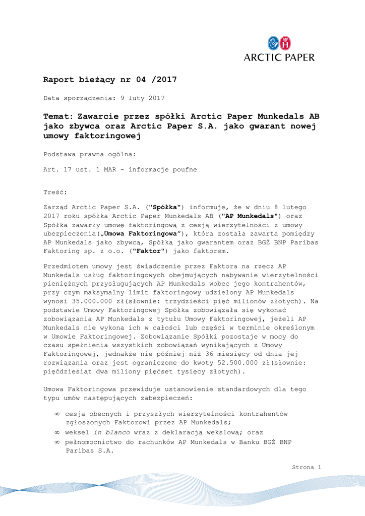 Temat: Zawarcie przez spółki Arctic Paper Munkedals AB