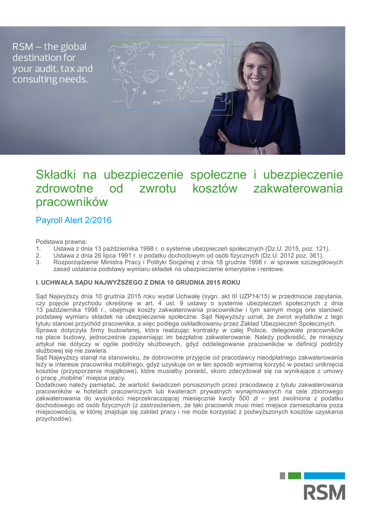 Składki na ubezpieczenie społeczne i ubezpieczenie zdrowotne od zwrotu kosztów zakwaterowania pracowników Payroll Alert 2/2016 Podstawa prawna: 1. Ustawa z dnia 13 października 1998 r. o systemie ubezpieczeń społecznych (Dz.U. 2015, poz. 121). 2. Ustawa z dnia 26 lipca 1991 r. o podatku dochodowym od osób fizycznych (Dz.U. 2012 poz. 361). 3. Rozporządzenie Ministra Pracy i Polityki Socjalnej z dnia 18 grudnia 1998 r. w sprawie szczegółowych zasad ustalania podstawy wymiaru składek na ubezpieczenie emerytalne i rentowe. I. UCHWAŁA SĄDU NAJWYŻSZEGO Z DNIA 10 GRUDNIA 2015 ROKU Sąd Najwyższy dnia 10 grudnia 2015 roku wydał Uchwałę (sygn. akt III UZP14/15) w przedmiocie zapytania, czy pojęcie przychodu określone w art. 4 ust. 9 ustawy o systemie ubezpieczeń społecznych z dnia 13 października 1998 r., obejmuje koszty zakwaterowania pracowników i tym samym mogą one stanowić podstawę wymiaru składek na ubezpieczenie społeczne. Sąd Najwyższy uznał, że zwrot wydatków z tego tytułu stanowi przychód pracownika, a więc podlega oskładkowaniu przez Zakład Ubezpieczeń Społecznych. Sprawa dotyczyła firmy budowlanej, która realizując kontrakty w całej Polsce, delegowała pracowników na place budowy, jednocześnie zapewniając im bezpłatne zakwaterowanie. Należy podkreślić, że niniejszy artykuł nie dotyczy w ogóle podróży służbowych, gdyż oddelegowanie pracowników w definicji podróży służbowej się nie zawiera. Sąd Najwyższy stanął na stanowisku, że dobrowolne przyjęcie od pracodawcy nieodpłatnego zakwaterowania leży w interesie pracownika mobilnego, gdyż uzyskuje on w ten sposób wymierną korzyść w postaci uniknięcia kosztów (przysporzenie majątkowe), które musiałby ponieść, skoro zdecydował się na wynikające z umowy o pracę „mobilne” miejsce pracy. Dodatkowo należy pamiętać, że wartość świadczeń ponoszonych przez pracodawcę z tytułu zakwaterowania pracowników w hotelach pracowniczych lub kwaterach prywatnych wynajmowanych na cele zbiorowego zakwaterowania do wysokości nieprzekraczającej miesięcznie kwoty 500 zł – jest zwolniona z podatku dochodowego od osób fizycznych (z zastrzeżeniem, że taki pracownik musi mieć miejsce zamieszkania poza miejscowością, w której znajduje się zakład pracy i nie może korzystać z podwyższonych kosztów uzyskania przychodów). II. KONSEKWENCJE DLA UBEZPIECZONYCH Niestety podjęta uchwała ma negatywny wydźwięk dla ubezpieczonych. Może mieć duże znaczenie dla wszystkich przedsiębiorców zapewniających zakwaterowanie pracownikom niebędącym w podróży służbowej oraz samych zatrudnionych. Należy liczyć się z tym, że ZUS będzie domagał się wstecz naliczania składek od wydatków z rachunków zakwaterowań oddelegowanych pracowników. III. JAK BRONIĆ SIĘ PRZED ZUS-EM? Jedyną prawną możliwością nienaliczania składek od zakwaterowania, choć należy liczyć się z próbą jej kwestionowania przez ZUS, jest jak najszybsze uregulowanie w przepisach wewnętrznych każdego przedsiębiorstwa, które deleguje do pracy na terenie Polski, ale i poza jej granicami, że pracownicy partycypują w kosztach nabycia usług zakwaterowania. O ile wykażemy, że zakwaterowanie pracowników to ich korzyść materialna, wynikająca z układów zbiorowych pracy, regulaminów wynagradzania lub przepisów o wynagradzaniu, a polegająca na uprawnieniu do zakupu po cenach niższych niż detaliczne, to wówczas przychody takie nie będą podlegać oskładkowaniu. RSM Poland jest członkiem RSM, 6. co do wielkości sieci niezależnych firm doradczych i audytorskich, która posiada ponad 760 biur w ponad 120 krajach i zatrudnia więcej niż 38.300 specjalistów na świecie. RSM Poland działa na polskim rynku już od 1991 roku. Przez ten czas zyskaliśmy ogromną wiedzę i doświadczenie. Udało nam się także stworzyć unikatowy zespół najlepszych specjalistów. Naszą firmę tworzą nasi klienci, których potrzeby stawiamy na pierwszym miejscu, dlatego oferujemy im kompleksową obsługę dostosowaną indywidualnie do ich potrzeb. To nasi klienci decydują o wachlarzu naszych usług, a my dajemy im możliwość rozwoju i wzrostu na każdym etapie ich działalności. Z wieloletniego doświadczenia wiemy, że nasze podejście jest gwarancją obopólnego sukcesu. W razie jakichkolwiek pytań lub potrzeby omówienia tematu, gorąco zachęcamy do kontaktu: Aleksandra DUSZA HR&Payroll Supervisor E: [email protected] M: +48 786 250 009 Dział Kadr i Płac RSM Poland RSM Poland Spółka Doradztwa Podatkowego S.A. ul. Miła 2 00-180 Warszawa T: +48 22 560 06 66 www.rsmpoland.pl [email protected] RSM Poland BLOG Praktyczny przewodnik po podatkach i biznesie. Zapraszamy do lektury! Prosimy zwrócić uwagę, że zaprezentowany tekst nie powinien być rozumiany jako porada prawna, gdyż każdy indywidualny przypadek wymaga odrębnej, rzetelnej analizy. Z tego względu RSM Poland Spółka Doradztwa Podatkowego S.A. oraz RSM Poland Audyt S.A. nie ponoszą żadnej odpowiedzialności w związku z wykorzystaniem informacji, porad i wskazówek zamieszczonych w niniejszej publikacji. © RSM Poland, 2016 15.03.2016 THE POWER OF BEING UNDERSTOOD AUDIT | TAX | CONSULTING RSM Poland is a member of the RSM network and trades as RSM. RSM is the trading name used by the members of the RSM network. Each member of the RSM network is an independent accounting and consulting firm which practices in its own right. The RSM network is not itself a separate legal entity in any jurisdiction.
