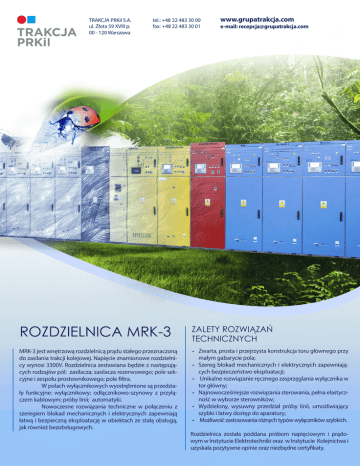 TRAKCJA PRKiI S.A. ul. Złota 59 XVIII p. 00 - 120 Warszawa tel.: +48 22 483 30 00 fax: +48 22 483 30 01 www.grupatrakcja.com e-mail: [email protected] ROZDZIELNICA MRK-3 ZALETY ROZWIĄZAŃ TECHNICZNYCH MRK-3 jest wnętrzową rozdzielnicą prądu stałego przeznaczoną do zasilania trakcji kolejowej. Napięcie znamionowe rozdzielnicy wynosi 3300V. Rozdzielnica zestawiana będzie z następujących rodzajów pól: zasilacza; zasilacza rezerwowego; pole sekcyjne i zespołu prostownikowego; pole filtra. W polach wyłącznikowych wyodrębnione są przedziały funkcyjne: wyłącznikowy; odłącznikowo-szynowy z przyłączem kablowym; próby linii; automatyki. Nowoczesne rozwiązania techniczne w połączeniu z szeregiem blokad mechanicznych i elektrycznych zapewniają łatwą i bezpieczną eksploatację w obiektach ze stałą obsługą, jak również bezobsługowych. • Zwarta, prosta i przejrzysta konstrukcja toru głównego przy małym gabarycie pola; • Szereg blokad mechanicznych i elektrycznych zapewniających bezpieczeństwo eksploatacji; • Unikalne rozwiązanie ręcznego zasprzęglania wyłącznika w tor główny; • Najnowocześniejsze rozwiązania sterowania, pełna elastyczność w wyborze sterowników; • Wydzielony, wysuwny przedział próby linii, umożliwiający szybki i łatwy dostęp do aparatury; • Możliwość zastosowania różnych typów wyłączników szybkich. Rozdzielnica została poddana próbom napięciowym i prądowym w Instytucie Elektrotechniki oraz w Instytucie Kolejnictwa i uzyskała pozytywne opinie oraz niezbędne certyfikaty. SR SS1 SL* (+)3kV + 3kV OSZ* OS1 1 1 B1 WSZ B1 2 1 WS* R1 2 AK R1 2 AK OSK1 SPL SPL 1 1 2 2 B2 2 2 1 B2 G R2 1 SP B1 B2 -3kV SP B1 B2 -3kV B1 B3 POLE WYŁACZNIKA ZAPASOWEGO POLE SEKCYJNE 1 R2.1 SP 1 2 R2.2 1 2 BW B1 B2 -3kV B3 WARUNKI PRACY • Rozdzielnicę wykonano jako wnętrzową z przeznaczeniem do pracy w obiektach zamkniętych o warunkach pracy zgodnych z normą PN-EN 50123-1:2003 • Zakres temperatur: -5 do +40oC; • Średnia względna temperatura pracy mierzona w ciągu 24h: 35oC; • Wilgotność ≤50% przy maksymalnej temperaturze 40oC; • Maksymalna wysokość n.p.m. 1400 m; • Brak zanieczyszczeń w postaci pyłu, dymu, gazów powodujących korozję czy wybuch. POLE ZASILACZA PODSTAWOWE DANE ZNAMIONOWE Napięcie znamionowe rozdzielnicy 3,3 kV DC Napięcie znamionowe izolacji obwodu głównego 4,0 kV DC Napięcie znamionowe wytrzymywane - wyłącznik w pozycji ‘praca’ 1,2/50μs 25 kV - wyłącznik w pozycji ‘próba’ 1,2/50μs 45 kV - stycznik próby linii 11,5 kV Napięcie znamionowe wytrzymywane, 50Hz: - wyłącznik w pozycji ‘praca’ 14 kV - wyłącznik w pozycji ‘próba’ 21 kV Prąd znamionowy ciągły szyn zbiorczych 6 kA Prąd znamionowy ciągły zasilacza trakcyjnego 2,5 kA Prąd znamionowy krótkotrwały wytrzymywany szyn 50/0,25 kA/s Prąd znamionowy szczytowy wytrzymywany szyn 72 kA Napięcie pomocnicze DC 220DC Typ sieci Ochrona przeciwporażeniowa podstawowa Ochrona przeciwporażeniowa dodatkowa Gabaryt mm szer./wys./gł. * dla wył. BWS gł. 2000 mm IT Izolowanie części czynnych Uziemienie ochronne 750/2300/1800* www.grupatrakcja.com