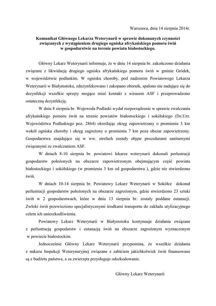 Warszawa, dnia 14 sierpnia 2014r. Komunikat Głównego Lekarza Weterynarii w sprawie dokonanych czynności związanych z wystąpieniem drugiego ogniska afrykańskiego pomoru świń w gospodarstwie na terenie powiatu białostockiego. Główny Lekarz Weterynarii informuje, że w dniu 14 sierpnia br. zakończono działania związane z likwidacją drugiego ogniska afrykańskiego pomoru świń w gminie Gródek, w województwie podlaskim. W ognisku choroby, pod nadzorem Powiatowego Lekarza Weterynarii w Białymstoku, zdezynfekowano i zakopano obornik, spalono nie nadające się do dezynfekcji wszelkie sprzęty mogące mieć kontakt z wirusem ASF i przeprowadzono ostateczną dezynfekcję. W dniu 8 sierpnia br. Wojewoda Podlaski wydał rozporządzenie w sprawie zwalczania afrykańskiego pomoru świń na terenie powiatów białostockiego i sokólskiego (Dz.Urz. Województwa Podlaskiego poz. 2864) określając okręg zapowietrzany o promieniu 3 km wokół ogniska choroby i okręg zagrożony o promieniu 7 km poza obszar zapowietrzony. Gospodarstwa znajdujące się w ww. strefach zostały objęte procedurami sanitarnymi związanymi ze zwalczaniem ASF. W dniach 8-10 sierpnia br. powiatowi lekarze weterynarii dokonali perlustracji gospodarstw położonych na obszarze zapowietrzonym obejmującym część powiatu białostockiego i sokólskiego (w promieniu 3 km od gospodarstwa ), gdzie nie stwierdzono świń. W dniach 10-14 sierpnia br. Powiatowy Lekarz Weterynarii w Sokółce dokonał perlustracji gospodarstw położonych na obszarze zagrożonym, gdzie stwierdzono 23 sztuki świń w 2 gospodarstwach, które w dniu 13 sierpnia br. zostały poddane eutanazji. Zwłoki świń przewieziono specjalistycznymi środkami transportu do zakładu utylizacyjnego celem ich unieszkodliwienia. Powiatowy Lekarz Weterynarii w Białymstoku kontynuuje działania związane z perlustracją gospodarstw i eutanazją świń na obszarze zagrożonym wyznaczonym w powiecie białostockim. Jednocześnie Główny Lekarz Weterynarii przypomina, że wszelkie działania z nakazu Inspekcji Weterynaryjnej związane z zabiciem jakichkolwiek świń finansowane są z budżetu państwa, a za zwierzęta przysługuje odszkodowanie. Główny Lekarz Weterynarii