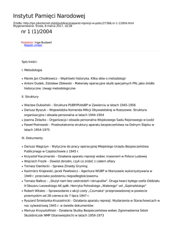 Instytut Pamięci Narodowej Źródło: http://ipn.jskinternet.pl/pl/publikacje/aparat-represji-w-polsc/27366,nr-1-12004.html Wygenerowano: Środa, 8 marca 2017, 16:28 nr 1 (1)/2004 Redaktor: Inga Budweil Rejestr zmian Spis treści: I. Metodologia ● Marek Jan Chodkiewicz – Wędrówki historyka. Kilka słów o metodologii ● Antoni Dudek, Zdzisław Zblewski – Materiały operacyjne służb specjalnych PRL jako źródło historyczne. Uwagi metodologiczne II. Struktury ● Wacław Dubiański – Struktura PUBP/PUdsBP w Zawierciu w latach 1945-1956 ● Dariusz Byszuk – Wojewódzka Komenda Milicji Obywatelskiej w Rzeszowie. Struktura organizacyjna i obsada personalna w latach 1944-1954 ● Joanna Żelazko – Organizacja i obsada personalna Wojskowego Sadu Rejonowego w Łodzi ● Paweł Piotrowski – Przekształcenia struktury aparatu bezpieczeństwa na Dolnym Śląsku w latach 1954-1975 III. Dokumenty ● Dariusz Węgrzyn – Wytyczne do pracy operacyjnej Miejskiego Urzędu Bezpieczeństwa Publicznego w Częstochowie z 1945 r. ● Krzysztof Kaczmarski – Działania aparatu represji wobec masonerii w Polsce Ludowej ● Wojciech Frazik – Dowód zbrodni, czyli co zrobić z ciałem ofiary ● Tomasz Danilecki – Sprawa Zinaidy Gryning ● Kazimierz Krajewski, Jacek Pawłowicz – Agentura WUBP w Warszawie wykorzystywana w 1949 r. przeciwko podziemiu niepodległościowemu ● Tomasz Balbus – „Służył nam bez zastrzeżeń i skrupułów". Druga twarz byłego szefa Oddziału II Obszaru Lwowskiego AK ppłk. Henryka Pohoskiego „Walerego" vel „Szpinalskiego" ● Robert Witalec – Sprawozdanie z akcji czoty „Czumaka" przeprowadzonej w powiecie przemyskim od 28 czerwca do 7 lipca 1947 r. ● Ryszard Śmietanka-Kruszelnicki – Działania aparatu represji. Wydarzenia w Starachowicach w noc sylwestrową 1945 r. w świetle dokumentów ● Mariusz Krzysztofiński – Działania Służby Bezpieczeństwa wobec Zgromadzenia Sióstr Służebniczek NMP (Starowiejskich) w latach 1959-1973 IV. W oczach własnych ● Zbigniew Nawrocki – Wspomnienia Jana Gorlińskiego, pierwszego szefa PUBP w Mielcu (wrzesień 1944 – maj 1945) V. Biogramy ● Filip Musiał – Julian Polan-Haraschin (1912-1984), sędzia WSR w Krakowie ● Tomasz Kurpierz – Marek Szauber (1907–?), prokurator WPR w Katowicach i Lublinie ● Zbigniew K. Wójcik – Jan Zbigniew Lubaczewski (1894-1975), sędzia WSR w Rzeszowie i Olsztynie ● Krzysztof Szwagrzyk – Zygmunt Bukowiński (1921-1983), sędzia WSR we Wrocławiu i Warszawie ● Igor Hałagida – Leon Łapiński 91913-?), agent III Departamentu MBP VI. Recenzje ● Tomasz Bereza – Piotr Kołakowski, „NKWD i GRU na ziemiach polskich 1939-1945", Warszawa 2002 ● Łukasz Kamiński – Ewa Matkowska, „System. Obywatel NRD pod nadzorem tajnych służb", Kraków 2003 ● Maciej Korkuć – Piotr Majer, „Milicja obywatelska w systemie organów PRL (zarys problematyki i źródła)", Toruń 2003 VII. Bibliografia ● Wojciech Frazik, Bogusław Kopka, Grzegorz Majchrzak – Dzieje aparatu represji w Polsce Ludowej (1944-1989). Stan badań ● Dorota Rowicka – Bibliografia zawartości czasopisma „Problemy Teorii i Praktyki Operacyjnej SB" za lata 1975-1987 i „Problemy Ochrony Bezpieczeństwa Państwa" za lata 1988-1989 nr 1 (1)/2004