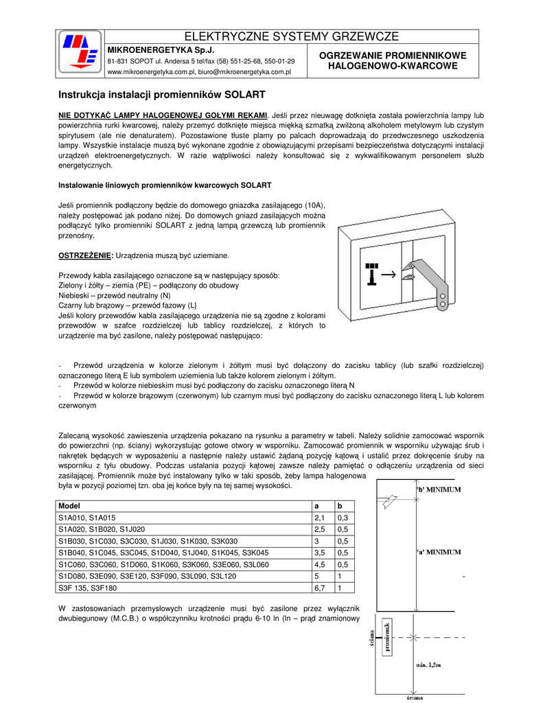 ELEKTRYCZNE SYSTEMY GRZEWCZE MIKROENERGETYKA Sp.J. OGRZEWANIE PROMIENNIKOWE HALOGENOWO-KWARCOWE 81-831 SOPOT ul. Andersa 5 tel/fax (58) 551-25-68, 550-01-29 www.mikroenergetyka.com.pl, [email protected] Instrukcja instalacji promienników SOLART NIE DOTYKA LAMPY HALOGENOWEJ GOŁYMI R KAMI. Je li przez nieuwag dotkni ta została powierzchnia lampy lub powierzchnia rurki kwarcowej, nale y przemy dotkni te miejsca mi kk szmatk zwil on alkoholem metylowym lub czystym spirytusem (ale nie denaturatem). Pozostawione tłuste plamy po palcach doprowadzaj do przedwczesnego uszkodzenia lampy. Wszystkie instalacje musz by wykonane zgodnie z obowi zuj cymi przepisami bezpiecze stwa dotycz cymi instalacji urz dze elektroenergetycznych. W razie w tpliwo ci nale y konsultowa si z wykwalifikowanym personelem słu b energetycznych. Instalowanie liniowych promienników kwarcowych SOLART Je li promiennik podł czony b dzie do domowego gniazdka zasilaj cego (10A), nale y post powa jak podano ni ej. Do domowych gniazd zasilaj cych mo na podł czy tylko promienniki SOLART z jedn lamp grzewcz lub promiennik przeno ny. OSTRZE ENIE: Urz dzenia musz by uziemiane. Przewody kabla zasilaj cego oznaczone s w nast puj cy sposób: Zielony i ółty – ziemia (PE) – podł czony do obudowy Niebieski – przewód neutralny (N) Czarny lub br zowy – przewód fazowy (L} Je li kolory przewodów kabla zasilaj cego urz dzenia nie s zgodne z kolorami przewodów w szafce rozdzielczej lub tablicy rozdzielczej, z których to urz dzenie ma by zasilone, nale y post powa nast puj co: Przewód urz dzenia w kolorze zielonym i ółtym musi by doł czony do zacisku tablicy (lub szafki rozdzielczej) oznaczonego liter E lub symbolem uziemienia lub tak e kolorem zielonym i ółtym. Przewód w kolorze niebieskim musi by podł czony do zacisku oznaczonego liter N Przewód w kolorze br zowym (czerwonym) lub czarnym musi by podł czony do zacisku oznaczonego liter L lub kolorem czerwonym Zalecan wysoko zawieszenia urz dzenia pokazano na rysunku a parametry w tabeli. Nale y solidnie zamocowa wspornik do powierzchni (np. ciany) wykorzystuj c gotowe otwory w wsporniku. Zamocowa promiennik w wsporniku u ywaj c rub i nakr tek b d cych w wyposa eniu a nast pnie nale y ustawi dan pozycj k tow i ustali przez dokr cenie ruby na wsporniku z tyłu obudowy. Podczas ustalania pozycji k towej zawsze nale y pami ta o odł czeniu urz dzenia od sieci zasilaj cej. Promiennik mo e by instalowany tylko w taki sposób, eby lampa halogenowa była w pozycji poziomej tzn. oba jej ko ce były na tej samej wysoko ci. Model a S1A010, S1A015 2,1 b 0,3 S1A020, S1B020, S1J020 2,5 0,5 S1B030, S1C030, S3C030, S1J030, S1K030, S3K030 3 0,5 S1B040, S1C045, S3C045, S1D040, S1J040, S1K045, S3K045 3,5 0,5 S1C060, S3C060, S1D060, S1K060, S3K060, S3E060, S3L060 4,5 0,5 S1D080, S3E090, S3E120, S3F090, S3L090, S3L120 5 1 S3F 135, S3F180 6,7 1 W zastosowaniach przemysłowych urz dzenie musi by zasilone przez wył cznik dwubiegunowy (M.C.B.) o współczynniku krotno ci pr du 6-10 ln (ln – pr d znamionowy ELEKTRYCZNE SYSTEMY GRZEWCZE MIKROENERGETYKA Sp.J. 81-831 SOPOT ul. Andersa 5 tel/fax (58) 551-25-68, 550-01-29 www.mikroenergetyka.com.pl, [email protected] OGRZEWANIE PROMIENNIKOWE HALOGENOWO-KWARCOWE wył cznika). Dobór wył cznika w zale no ci od typu promiennika lub warto ci mocy instalowanej. Podł czenie Odkr ci klapk osłaniaj c wej ciowe zaciski przył czeniowe, poło y kabel zasilaj cy przez wlot przewodowy osłony i podł czy przewody kabla do zacisków przył czeniowych i zacisku uziemienia ochronnego. Nast pnie nale y przykr ci urz dzenie do wspornika, ustawi dany k t i unieruchomi w tej pozycji przez dokr cenie ruby z tyłu obudowy. Zawsze przy regulacji poło enia k towego upewni si , e urz dzenie jest odł czone od sieci zasilaj cej (jest nie zasilone). Urz dzenie musi by usytuowane tak, e zapewni poziome poło enie kwarcowe rurki promiennika. UWAGA: Zabrania si ł czenia zacisku PE z zaciskiem N Nale y stosowa kable o wła ciwym przekroju. Nie nale y bezpo rednio patrze w odbłyski pracuj cego promiennika. Nie nale y stosowa promienników w pomieszczeniach zagro onych wybuchem. Ł czniki zastosowane do odł czania zasilania musz mie odległo mi dzy rozwartymi stykami co najmniej 3mm. o Promienników nie wolno u ywa na budowach, w szklarniach.(nara enie na opryskanie) o Nale y okresowo czy ci gromadz cy si kurz na odbły niku i arniku - przedmucha , przemy mi kk szmatk zwil on alkoholem metylowym lub spirytusem. o o o o