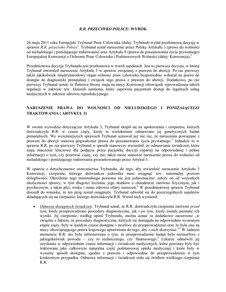 R.R. PRZECIWKO POLSCE: WYROK 26 maja 2011 roku Europejski Trybunał Praw Człowieka (dalej: Trybunał) wydał przełomową decyzję w sprawie R.R. przeciwko Polsce1. Trybunał uznał naruszenie przez Polskę Artykułu 3 (prawa do wolności od nieludzkiego i poniżającego traktowania) oraz Artykułu 8 (prawa do poszanowania życia prywatnego) Europejskiej Konwencji o Ochronie Praw Człowieka i Podstawowych Wolności (dalej: Konwencja).2 Przedmiotowa decyzja Trybunału jest przełomowa w trzech aspektach. Jest to pierwsza decyzja, w której Trybunał stwierdził naruszenie Artykułu 3 w sprawie związanej z prawem do aborcji. Po raz pierwszy także jakikolwiek międzynarodowy organ ochrony praw człowieka bezpośrednio wskazał na prawo do dostępu do diagnostyki prenatalnej i związek tego prawa z prawem do aborcji. Dodatkowo, po raz pierwszy Trybunał uznał, że Państwa-Strony mają na mocy Konwencji obowiązek wprowadzenia takich regulacji w zakresie tzw. klauzuli sumienia, które zapewnią pacjentom dostęp do legalnych usług medycznych w zakresie zdrowia reprodukcyjnego. NARUSZENIE PRAWA DO WOLNOŚCI TRAKTOWANIA ( ARTYKUŁ 3) OD NIELUDZKIEGO I PONIŻAJĄCEGO W swoim wywodzie dotyczącym Artykułu 3, Trybunał skupił się na upokorzeniu i cierpieniu, których doświadczyła R.R. w czasie ciąży, kiedy to wielokrotnie odmawiano jej genetycznych badań prenatalnych. We wcześniejszych sprawach Trybunał uznawał już nie raz, że naruszenia powiązane z prawem do aborcji stanową pogwałcenie prawa do poszanowania życia prywatnego.3 Jednakże to w sprawie R.R. po raz pierwszy Trybunał w sposób stanowczy stwierdził, że odmawianie świadczeń, które mają znaczenie kluczowe dla podjęcia przez pacjentkę decyzji (opartej na odpowiedniej i pełnej informacji) o tym, czy przerwać ciążę, czy nie, także może stanowić naruszenie prawa do wolności od nieludzkiego i poniżającego traktowania gwarantowanego przez Artykuł 3. W oparciu o dotychczasowe orzecznictwo Trybunału, do tego, aby stwierdzić naruszenie Artykułu 3 Konwencji, cierpienie, którego doświadcza jednostka musi osiągnąć tzw. minimalny poziom dolegliwości. Określenie tego minimalnego poziomu nie jest jednoznaczne: zależy on od wszystkich okoliczności sprawy, w tym długości leczenia, jego skutków o charakterze zarówno fizycznym, jak i psychicznym, a także płci, wieku i stanu zdrowia ofiary naruszeń.4 W przedmiotowej sprawie Trybunał doszedł do wniosku, że ten próg został osiągnięty. Trybunał odwołał się do poszczególnych aspektów składających się na cierpienie, którego doświadczyła R.R. Wśród nich wymienił: Odmowę dostępnych świadczeń: Trybunał uznał, że R.R. doświadczyła cierpienia zarówno przed tym, kiedy przeprowadzono procedury diagnostyczne, jak i po tym, kiedy zostały poznane ich wyniki. Jej cierpienie, według opinii Trybunału, można uznać za dodatkowo zaostrzone „w związku z faktem, że procedury diagnostyczne, których się domagała na odpowiednio wczesnym etapie ciąży, były w każdym czasie dostępne i możliwe do przeprowadzenia oraz że była ona na mocy obowiązującego prawa krajowego uprawniona do tego, aby z nich skorzystać.”5 W żadnym momencie R.R. nie była informowana o tym, że przeprowadzenie badań było niemożliwe z jakiegokolwiek powodu – czy to technicznego, czy finansowego.6 Lekarze odmówili jej uzyskania w odpowiednim czasie informacji i świadczeń medycznych, które powinny były być traktowane jako całkowicie naturalna część podstawowej opieki medycznej i które były w wyraźny sposób dostępne, zgodne z prawem i odpowiednie do przeprowadzenia w tym konkretnym przypadku. Odmowa informacji i świadczeń stała się źródłem wielkiego cierpienia R.R. Bezbronność: Trybunał wziął pod uwagę bezbronną pozycję R.R. oraz każdej kobiety ciężarnej, zaznaczając, że „[p]odobnie, jak każda inna kobieta ciężarna w jej sytuacji, była ona głęboko zmartwiona po uzyskaniu informacji, że płód mógł być dotknięty pewnym uszkodzeniem.”7 R.R. była przez tygodnie zmuszana do trwania w bolesnej niepewności dotyczącej zdrowia noszonego przez nią płodu, własnego zdrowia oraz przyszłości swojej rodziny, ponieważ lekarze nie byli w stanie w sposób właściwy rozpoznać i zareagować na jej obawy. Lekarze wielokrotnie odmawiali R.R. informacji i badań diagnostycznych do czasu, kiedy legalna aborcja nie była już możliwa, co sprawiło, że znalazła się w sytuacji ogromnej bezbronności.8 Upokorzenie: Trybunał w sposób wyraźny stwierdził, że podziela pogląd wyrażony przez polski Sąd Najwyższy mówiący o tym, że „skarżąca została upokorzona.”9 Trybunał poszedł jednak o krok dalej i potępił zachowanie lekarzy, zaznaczając, że R.R “była przez lekarzy traktowana w sposób niecny.”10 Trybunał w szczególności uznał, że jej prawo do dostępu do badań genetycznych „zostało zniweczone poprzez zwlekanie, niepewność i brak odpowiedniego doradztwa i informacji” oraz że w ostateczności kobieta otrzymała świadczenie w efekcie „użycia podstępu”.11 NARUSZENIE PRAWA DO POSZANOWANIA ŻYCIA PRYWATNEGO (ARTYKUŁ 8) Trybunał uznał także, że Państwo nie spełniło swojego pozytywnego obowiązku wynikającego z Artykułu 8 i nie zagwarantowało R.R. w sposób skuteczny poszanowania dla jej życia prywatnego.12 Trybunał powtórzył po raz kolejny to, co znalazło się już w wyroku Tysiąc przeciwko Polsce13 i podkreślił, że Państwo ma pozytywny obowiązek ustanowić jasne prawne i proceduralne zasady, w ramach których w sposób efektywny zapewniany będzie dostęp do legalnej aborcji po to, aby prawo do aborcji miało charakter realny i faktycznie działający.14 Trybunał powtórzył także, że w sytuacji, gdy Państwo decyduje się na umożliwienie przeprowadzenia aborcji, „nie wolno mu konstruować porządku prawnego w taki sposób, że ogranicza on 