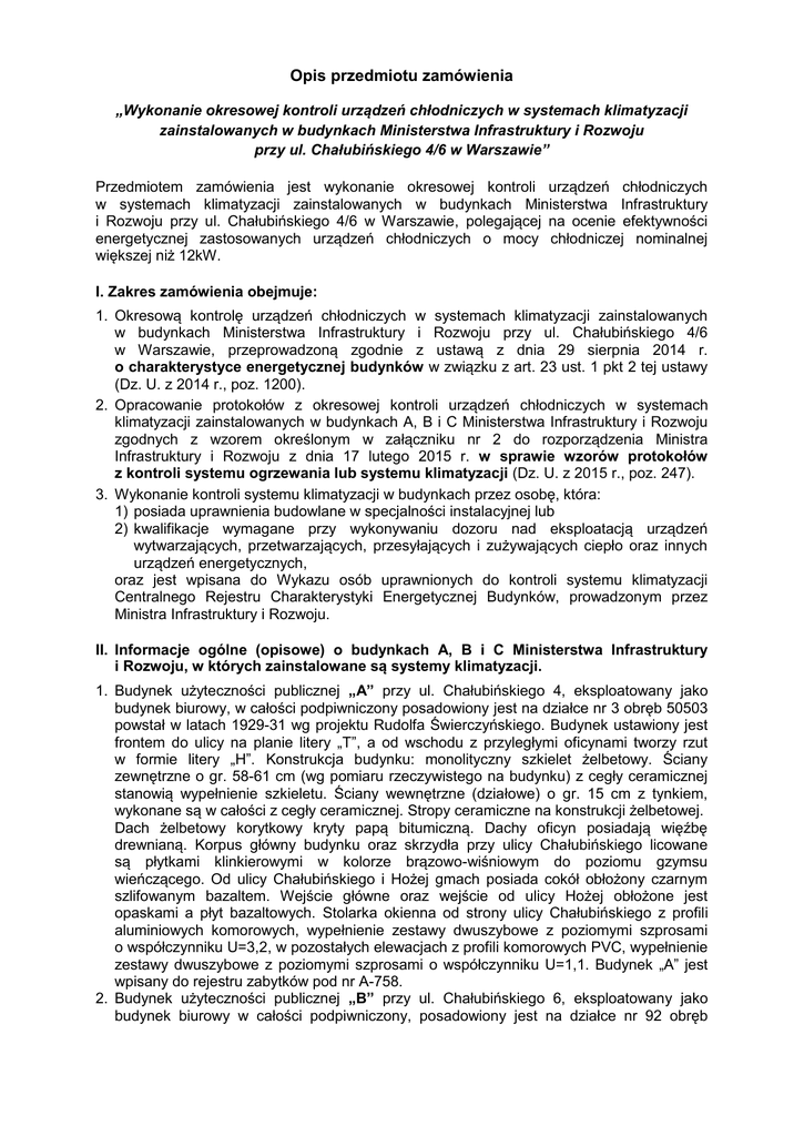 Opis przedmiotu zamówienia „Wykonanie okresowej kontroli urządzeń chłodniczych w systemach klimatyzacji zainstalowanych w budynkach Ministerstwa Infrastruktury i Rozwoju przy ul. Chałubińskiego 4/6 w Warszawie” Przedmiotem zamówienia jest wykonanie okresowej kontroli urządzeń chłodniczych w systemach klimatyzacji zainstalowanych w budynkach Ministerstwa Infrastruktury i Rozwoju przy ul. Chałubińskiego 4/6 w Warszawie, polegającej na ocenie efektywności energetycznej zastosowanych urządzeń chłodniczych o mocy chłodniczej nominalnej większej niż 12kW. I. Zakres zamówienia obejmuje: 1. Okresową kontrolę urządzeń chłodniczych w systemach klimatyzacji zainstalowanych w budynkach Ministerstwa Infrastruktury i Rozwoju przy ul. Chałubińskiego 4/6 w Warszawie, przeprowadzoną zgodnie z ustawą z dnia 29 sierpnia 2014 r. o charakterystyce energetycznej budynków w związku z art. 23 ust. 1 pkt 2 tej ustawy (Dz. U. z 2014 r., poz. 1200). 2. Opracowanie protokołów z okresowej kontroli urządzeń chłodniczych w systemach klimatyzacji zainstalowanych w budynkach A, B i C Ministerstwa Infrastruktury i Rozwoju zgodnych z wzorem określonym w załączniku nr 2 do rozporządzenia Ministra Infrastruktury i Rozwoju z dnia 17 lutego 2015 r. w sprawie wzorów protokołów z kontroli systemu ogrzewania lub systemu klimatyzacji (Dz. U. z 2015 r., poz. 247). 3. Wykonanie kontroli systemu klimatyzacji w budynkach przez osobę, która: 1) posiada uprawnienia budowlane w specjalności instalacyjnej lub 2) kwalifikacje wymagane przy wykonywaniu dozoru nad eksploatacją urządzeń wytwarzających, przetwarzających, przesyłających i zużywających ciepło oraz innych urządzeń energetycznych, oraz jest wpisana do Wykazu osób uprawnionych do kontroli systemu klimatyzacji Centralnego Rejestru Charakterystyki Energetycznej Budynków, prowadzonym przez Ministra Infrastruktury i Rozwoju. II. Informacje ogólne (opisowe) o budynkach A, B i C Ministerstwa Infrastruktury i Rozwoju, w których zainstalowane są systemy klimatyzacji. 1. Budynek użyteczności publicznej „A” przy ul. Chałubińskiego 4, eksploatowany jako budynek biurowy, w całości podpiwniczony posadowiony jest na działce nr 3 obręb 50503 powstał w latach 1929-31 wg projektu Rudolfa Świerczyńskiego. Budynek ustawiony jest frontem do ulicy na planie litery „T”, a od wschodu z przyległymi oficynami tworzy rzut w formie litery „H”. Konstrukcja budynku: monolityczny szkielet żelbetowy. Ściany zewnętrzne o gr. 58-61 cm (wg pomiaru rzeczywistego na budynku) z cegły ceramicznej stanowią wypełnienie szkieletu. Ściany wewnętrzne (działowe) o gr. 15 cm z tynkiem, wykonane są w całości z cegły ceramicznej. Stropy ceramiczne na konstrukcji żelbetowej. Dach żelbetowy korytkowy kryty papą bitumiczną. Dachy oficyn posiadają więźbę drewnianą. Korpus główny budynku oraz skrzydła przy ulicy Chałubińskiego licowane są płytkami klinkierowymi w kolorze brązowo-wiśniowym do poziomu gzymsu wieńczącego. Od ulicy Chałubińskiego i Hożej gmach posiada cokół obłożony czarnym szlifowanym bazaltem. Wejście główne oraz wejście od ulicy Hożej obłożone jest opaskami a płyt bazaltowych. Stolarka okienna od strony ulicy Chałubińskiego z profili aluminiowych komorowych, wypełnienie zestawy dwuszybowe z poziomymi szprosami o współczynniku U=3,2, w pozostałych elewacjach z profili komorowych PVC, wypełnienie zestawy dwuszybowe z poziomymi szprosami o współczynniku U=1,1. Budynek „A” jest wpisany do rejestru zabytków pod nr A-758. 2. Budynek użyteczności publicznej „B” przy ul. Chałubińskiego 6, eksploatowany jako budynek biurowy w całości podpiwniczony, posadowiony jest na działce nr 92 obręb 50501, zbudowany został w latach 1947-51 jako zespół gmachów ówczesnego Ministerstwa Komunikacji i Dyrekcji Kolei, wg projektu Bohdana Pniewskiego. Budynek „B” ustawiony frontem do ulicy Chałubińskiego, połączony jest Rotundą z budynkiem ”C”. Budynek w konstrukcji stalowego szkieletu, zwężającego się z odsadzkami pomiędzy piętrami: II/III; IV/V; VII/VIII; VIII/IX; XII/XIII. Ściany zewnętrzne z elementów prefabrykowanych: od parteru do XIII p. o gr. 56 cm; na poddaszu - 36 cm; piwnice - 64 cm. Ściany wewnętrzne (działowe) o gr. 15 cm z tynkiem. Elewacja obłożona płytami kamiennymi z piaskowca. Stropy żelbetowe: pomiędzy II i III piętrem o gr. – 58 cm; VIII a IX p – 52 cm; na pozostałych piętrach 36-40 cm. Stropodach żelbetowy o gr. 68 cm pokryty papą bitumiczną. Stolarka okienna w budynku z profili PVC komorowych, wypełnienie zestawy dwuszybowe o współczynniku U=1,1. Budynek „B’ ujęty jest w gminnej ewidencji zabytków Miasta Stołecznego Warszawy. 3. Budynek użyteczności publicznej „C” przy ul. Chałubińskiego 4, eksploatowany jako budynek biurowy, w całości podpiwniczony, posadowiony jest na działce nr 92 obręb 50501, zbudowany został w latach 1947-51 jako zespół gmachów ówczesnego Ministerstwa Komunikacji i Dyrekcji Kolei, wg projektu Bohdana Pniewskiego. Budynek ustawiony frontem do ulicy Chałubińskiego połączony jest łącznikiem nad ulicą Hożą z budynkiem „A”. Konstrukcja budynku: ściany zewnętrzne o gr. 56 cm; ściany piwnic o gr. 64 cm. Ściany wewnętrzne (działowe) o gr. 15 cm z tynkiem. Elewacja obłożona płytami kamiennymi z piaskowca. Stropy żelbetowe: gr. 36-39 cm; nad IV p.- 27 cm. Pomiędzy stropem IV piętra a dachem, przestrzeń o wysokości 70 cm, wypełniona granulatem styropianu o gr. 20 cm. Dach budynku „C” żelbetowy korytkowy pokryty papą bitumiczną. Stolarka okienna w budynku z profili PVC komorowych, wypełnienie zestawy dwuszybowe o współczynniku U=1,1. Budynek „C” ujęty jest w gminnej ewidencji zabytków Miasta Stołecznego Warszawy. TABELA - Parametry powierzchniowe budynków, w których zainstalowane są systemy klimatyzacji Wysokość /m/ Powierzchnia 