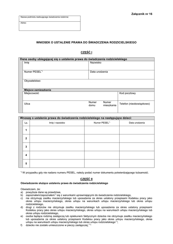 Załącznik nr 16 Nazwa podmiotu realizującego świadczenia rodzinne: Adres: WNIOSEK O USTALENIE PRAWA DO ŚWIADCZENIA RODZICIELSKIEGO CZĘŚĆ I Dane osoby ubiegającej się o ustalenie prawa do świadczenia rodzicielskiego Imię Nazwisko Numer PESEL*) Data urodzenia Obywatelstwo Miejsce zamieszkania Miejscowość Kod pocztowy Numer domu Ulica Numer mieszkania Telefon (nieobowiązkowo) Wnoszę o ustalenie prawa do świadczenia rodzicielskiego na następujące dzieci: Lp, Imię i nazwisko Numer PESEL*) Data urodzenia 1 2 3 4 5 *) W przypadku gdy nie nadano numeru PESEL, należy podać numer dokumentu potwierdzającego tożsamość. CZĘŚĆ II Oświadczenie służące ustaleniu prawa do świadczenia rodzicielskiego Oświadczam, że: a) powyższe dane są prawdziwe, b) zapoznałam/zapoznałem*) się z warunkami uprawniającymi do świadczenia rodzicielskiego, c) nie otrzymuję zasiłku macierzyńskiego lub uposażenia za okres ustalony przepisami Kodeksu pracy jako okres urlopu macierzyńskiego, okres urlopu na warunkach urlopu macierzyńskiego lub okres urlopu rodzicielskiego, d) drugi z rodziców nie otrzymuje zasiłku macierzyńskiego lub uposażenia za okres ustalony przepisami Kodeksu pracy jako okres urlopu macierzyńskiego, okres urlopu na warunkach urlopu macierzyńskiego lub okres urlopu rodzicielskiego, e) osoba będąca rodziną zastępczą lub opiekunem faktycznym dziecka nie otrzymuje zasiłku macierzyńskiego lub uposażenia za okres ustalony przepisami Kodeksu pracy jako okres urlopu macierzyńskiego, okres urlopu na warunkach urlopu macierzyńskiego lub okres urlopu rodzicielskiego**); f) dziecko nie zostało umieszczone w pieczy zastępczej,***) w związku z wychowywaniem tego samego dziecka lub w związku z opieką nad tym samym dzieckiem nie ma ustalonego prawa do świadczenia rodzicielskiego, dodatku do zasiłku rodzinnego z tytułu opieki nad dzieckiem w okresie korzystania z urlopu wychowawczego, świadczenia pielęgnacyjnego, specjalnego zasiłku opiekuńczego lub zasiłku dla opiekuna, o którym mowa w ustawie z dnia 4 kwietnia 2014 r. o ustaleniu i wypłacie zasiłków dla opiekunów (Dz. U. poz. 567, z późn. zm.), h) nie przysługuje mi za granicą świadczenie o podobnym charakterze do świadczenia rodzicielskiego chyba, że przepisy o koordynacji systemów zabezpieczenia społecznego lub dwustronne umowy o zabezpieczeniu społecznym stanowią, że przysługujące za granicą świadczenie o podobnym charakterze do świadczenia rodzicielskiego nie wyłącza prawa do takiego świadczenia na podstawie ustawy, i) nie podjęłam/nie podjąłem*) ani nie kontynuuję zatrudnienia lub innej pracy zarobkowej, która uniemożliwia mi sprawowanie osobistej opieki nad dzieckiem, j) nie mam ustalonego prawa do świadczenia pielęgnacyjnego, specjalnego zasiłku opiekuńczego, dodatku do zasiłku rodzinnego z tytułu opieki nad dzieckiem w okresie korzystania z urlopu wychowawczego lub zasiłku dla opiekuna, o którym mowa w ustawie z dnia 4 kwietnia 2014 r. o ustaleniu i wypłacie zasiłków dla opiekunów, k) matka dziecka urodziła dziecko/nie urodziła dziecka*), którego dotyczy wniosek w okresie pobierania zasiłku dla bezrobotnych lub w ciągu miesiąca po jego zakończeniu, lub w okresie przedłużenia pobierania zasiłku dla bezrobotnych na podstawie art. 73 ust. 3 ustawy z dnia 20 kwietnia 2004 r. o promocji zatrudnienia i instytucjach rynku pracy (Dz. U. z 2015 r. poz. 149, z późn. zm.)****), l) przebywam/nie przebywam*) poza granicami Rzeczypospolitej Polskiej*****) w państwie, w którym mają zastosowanie przepisy o koordynacji systemów zabezpieczenia społecznego*****), m) członek mojej rodziny, w rozumieniu art. 3 pkt 16 ustawy z dnia 28 listopada 2003 r. o świadczeniach rodzinnych, przebywa/nie przebywa*) poza granicami Rzeczypospolitej Polskiej*****) w państwie, w którym mają zastosowanie przepisy o koordynacji systemów zabezpieczenia społecznego******). g) *) Niepotrzebne skreślić. **) Dotyczy osób, o których mowa w art. 17c ust. 1 pkt 2 i 3 ustawy (opiekuna faktycznego dziecka i rodziny zastępczej). ***) Nie dotyczy osób, o których mowa w art. 17c ust. 1 pkt 2 i 3 ustawy (opiekuna faktycznego dziecka i rodziny zastępczej). Nie dotyczy osób, o których mowa w art. 17c ust. 1 pkt 2- 4 ustawy (opiekuna faktycznego dziecka, rodziny zastępczej, osoby, która przysposobiła dziecko). ****) Nie dotyczy wyjazdu lub pobytu turystycznego, leczniczego lub związanego z podjęciem przez dziecko kształcenia poza granicami Rzeczypospolitej Polskiej. *****) Przepisy o koordynacji systemów zabezpieczenia społecznego mają zastosowanie na terenie: Austrii, Belgii, Danii, Finlandii, Francji, Grecji, Hiszpanii, Holandii, Irlandii, Luksemburga, Niemiec, Portugalii, Szwecji, Włoch, Wielkiej Brytanii, Cypru, Czech, Estonii, Litwy, Łotwy, Malty, Polski, Słowacji, Słowenii, Węgier, Bułgarii, Rumunii. Norwegii, Islandii, Liechtensteinu, Szwajcarii oraz od 1 lipca 2013 r. Chorwacji. ******) (data, podpis osoby ubiegającej się) W przypadku zmian mających wpływ na prawo do świadczenia rodzicielskiego, w szczególności zaistnienia okoliczności wymienionych powyżej, w tym również w przypadku wyjazdu osoby uprawnionej lub członka rodziny tej osoby poza granicę Rzeczypospolitej Polskiej, osoba ubiegająca się jest obowiązana niezwłocznie powiadomić o tych zmianach podmiot realizujący świadczenia rodzinne. Niepoinformowanie organu właściwego prowadzącego postępowanie w sprawie świadczeń rodzinnych o zmianach, o których mowa powyżej, może skutkować powstaniem nienależnie pobranych świadczeń rodzinnych, a w konsekwencji - koniecznością ich zwrotu wraz z odsetkami ustawowymi za opóźnienie. (data, podpis osoby ubiegającej się) Do wniosku dołączam następujące dokumenty: 1) …………………………………………………. 2) …………………………………………………. 3) ………………………