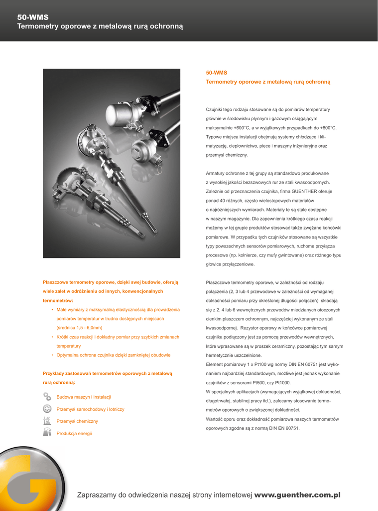 50-WMS Termometry oporowe z metalową rurą ochronną 50-WMS Termometry oporowe z metalową rurą ochronną Czujniki tego rodzaju stosowane są do pomiarów temperatury głównie w środowisku płynnym i gazowym osiągającym maksymalnie +600°C, a w wyjątkowych przypadkach do +800°C. Typowe miejsca instalacji obejmują systemy chłodzące i klimatyzację, ciepłownictwo, piece i maszyny inżynieryjne oraz przemysł chemiczny. Armatury ochronne z tej grupy są standardowo produkowane z wysokiej jakości bezszwowych rur ze stali kwasoodpornych. Zależnie od przeznaczenia czujnika, firma GUENTHER oferuje ponad 40 różnych, często wielostopowych materiałów o najróżniejszych wymiarach. Materiały te są stale dostępne w naszym magazynie. Dla zapewnienia krótkiego czasu reakcji możemy w tej grupie produktów stosować także zwężane końcówki pomiarowe. W przypadku tych czujników stosowane są wszystkie typy powszechnych sensorów pomiarowych, ruchome przyłącza procesowe (np. kołnierze, czy mufy gwintowane) oraz różnego typu głowice przyłączeniowe. Płaszczowe termometry oporowe, dzięki swej budowie, oferują Płaszczowe termometry oporowe, w zależności od rodzaju wiele zalet w odróżnieniu od innych, konwencjonalnych połączenia (2, 3 lub 4 przewodowe w zależności od wymaganej termometrów: dokładności pomiaru przy określonej długości połączeń) składają się z 2, 4 lub 6 wewnętrznych przewodów miedzianych otoczonych • Małe wymiary z maksymalną elastycznością dla prowadzenia pomiarów temperatur w trudno dostępnych miejscach cienkim płaszczem ochronnym, najczęściej wykonanym ze stali (średnica 1,5 - 6,0mm) kwasoodpornej. Rezystor oporowy w końcówce pomiarowej • Krótki czas reakcji i dokładny pomiar przy szybkich zmianach temperatury • Optymalna ochrona czujnika dzięki zamkniętej obudowie czujnika podłączony jest za pomocą przewodów wewnętrznych, które wprasowane są w proszek ceramiczny, pozostając tym samym hermetycznie uszczelnione. Element pomiarowy 1 x Pt100 wg normy DIN EN 60751 jest wyko- Przykłady zastosowań termometrów oporowych z metalową naniem najbardziej standardowym, możliwe jest jednak wykonanie rurą ochronną: czujników z sensorami Pt500, czy Pt1000. Budowa maszyn i instalacji W specjalnych aplikacjach (wymagających wyjątkowej dokładności, długotrwałej, stabilnej pracy itd.), zalecamy stosowanie termo- Przemysł samochodowy i lotniczy metrów oporowych o zwiększonej dokładności. Przemysł chemiczny Wartość oporu oraz dokładność pomiarowa naszych termometrów Produkcja energii oporowych zgodne są z normą DIN EN 60751. Zapraszamy do odwiedzenia naszej strony internetowej www.guenther.com.pl GUENTHER Polska Sp. z o.o. Technologie pomiaru temperatury Głowica przyłączeniowa (zob. strona 55) A B AUS BUS AUZ BUZ AUZH BUZH AUSH BBK 2 1 Przyłącze procesowe (odłączane) Kołnierz Mufa gwintowana Uchwyt zaciskowy 3 Zewnętrzna rura osłonowa Materiał: St. 35.8 WNr. 1.0305 Stal nierdzewna WNr. 1.4571 X10Cr Al 24 WNr. 1.4762 X15CrNi Si 25 20 WNr. 1.4841 Stal żaroodporna WNr. 1.4893 4 Przykłady powszechnych wykonań tej grupy produktów Termometry Oporowe 1 2 3 Końcówka czujnika Nie zwężana lub zwężana do średnicy 6- 15 mm Długość nominalna 5 Płaszczowe wkłady pomiarowe Średnica płaszcza: 1,5 - 8,0 mm Średnica końcówki pomiarowej: 2,0 - 10,0 mm Sensor oporowy: 1 x Pt100 do 3 x Pt100 2-, 3- lub 4-przew. 4 Nasze termometry oporowe dostępne są także 5 w wersjach przeznaczonych do stosowania w warunkach iskrobezpiecznych (ATEX) – zob. strona 50. Dalsze informacje techniczne na temat tej grupy produktów przedstawiliśmy na naszej stronie internetowej (możliwość pobrania dokumentów): www.guenther.com.pl Rozwiązania specjalne wykonane np. z materiałów niewymienionych w niniejszym katalogu, ze specjalnymi przyłączami, wyposażeniem itd. zazwyczaj możliwe są do wykonania na zamówienie. Prosimy o kontakt! 50-WMS Termometry oporowe z metalową rurą ochronną