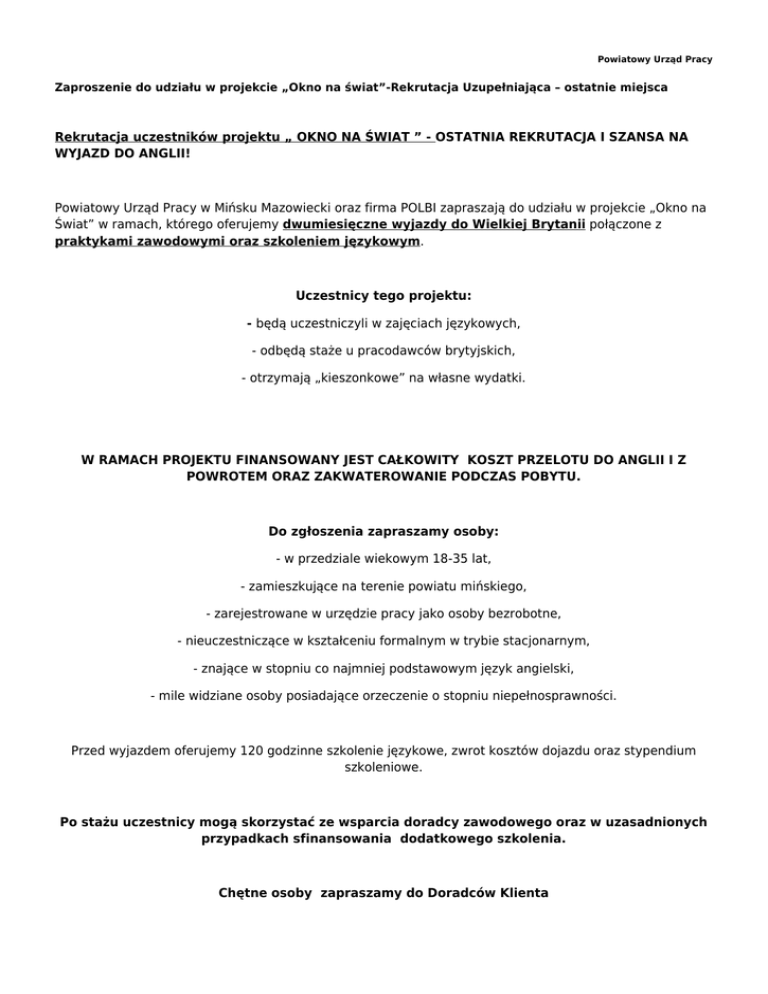 Powiatowy Urząd Pracy Zaproszenie do udziału w projekcie „Okno na świat”-Rekrutacja Uzupełniająca – ostatnie miejsca Rekrutacja uczestników projektu „ OKNO NA ŚWIAT ” - OSTATNIA REKRUTACJA I SZANSA NA WYJAZD DO ANGLII! Powiatowy Urząd Pracy w Mińsku Mazowiecki oraz firma POLBI zapraszają do udziału w projekcie „Okno na Świat” w ramach, którego oferujemy dwumiesięczne wyjazdy do Wielkiej Brytanii połączone z praktykami zawodowymi oraz szkoleniem językowym. Uczestnicy tego projektu: - będą uczestniczyli w zajęciach językowych, - odbędą staże u pracodawców brytyjskich, - otrzymają „kieszonkowe” na własne wydatki. W RAMACH PROJEKTU FINANSOWANY JEST CAŁKOWITY KOSZT PRZELOTU DO ANGLII I Z POWROTEM ORAZ ZAKWATEROWANIE PODCZAS POBYTU. Do zgłoszenia zapraszamy osoby: - w przedziale wiekowym 18-35 lat, - zamieszkujące na terenie powiatu mińskiego, - zarejestrowane w urzędzie pracy jako osoby bezrobotne, - nieuczestniczące w kształceniu formalnym w trybie stacjonarnym, - znające w stopniu co najmniej podstawowym język angielski, - mile widziane osoby posiadające orzeczenie o stopniu niepełnosprawności. Przed wyjazdem oferujemy 120 godzinne szkolenie językowe, zwrot kosztów dojazdu oraz stypendium szkoleniowe. Po stażu uczestnicy mogą skorzystać ze wsparcia doradcy zawodowego oraz w uzasadnionych przypadkach sfinansowania dodatkowego szkolenia. Chętne osoby zapraszamy do Doradców Klienta Powiatowy Urząd Pracy w Mińsku Mazowieckim ul. Przemysłowa 4 sala 105 lub 108. UWAGA! LICZBA MIEJSC OGRANICZONA. Informacje o artykule Autor: Zredagował(a): Ewa Cinkowska Piotr Karolak Data powstania: 20.12.2016 13:17 Data ostatniej modyfikacji: 19.12.2016 13:10 Liczba wyświetleń: Wydrukowano z serwisu: Wydrukowano dnia: 729 www.praca.powiatminski.pl 2017-03-08 16:31:06