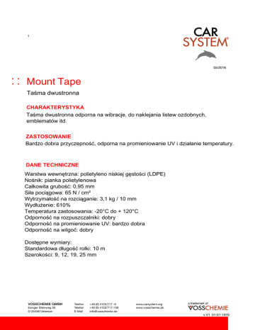 1 05/2016 Mount Tape double-sided adhesive tape Taśma dwustronna CHARACTERISTICS CHARAKTERYSTYKA MOUNTdwustronna TAPE is a double-sided adhesivedo tape for vibration-resistant bonding, Taśma odporna na wibracje, naklejania listew ozdobnych, where high shear emblematów itd. and substantial loads may be encountered, even when subjected to UV light, plasticisers and a wide temperature range. ZASTOSOWANIE Bardzo dobra przyczepność, odporna na promieniowanie UV i działanie temperatury. APPLICATION High quality masking tape for trim- and edge-lining strips, emblems, etc. by car. DANE TECHNICZNE PRODUCT DATA Warstwa wewnętrzna: polietyleno niskiej gęstości (LDPE) MATERIAL DATA Nośnik: pianka polietylenowa Adhesive: Całkowita grubość: 0,95 mm Permanent crossed linked acrylic adhesive Siła pociągowa: 65 N / cm² Liner: Low density Polyethlene (LDPE) Wytrzymałość na rozciąganie: 3,1 kg / 10 mm Carrier: Polyethylene foam Wydłużenie: 610% Total thickness: 0,95 mm Temperatura zastosowania: -20°C do + 120°C 180°C peel adhesion on stainless steel: 1200 GF/cm Odporność na rozpuszczalniki: dobry Tractive force: 65 N/cm² Odporność na promieniowanie UV: bardzo dobra Tensile Strength: 3,1 kg/10 Odporność na wilgoć: dobry mm Elongation: 610% Application area: -20°C → +120°C Dostępne wymiary: Solvent resistance: Good Standardowa długość rolki: 10 m UV-resistance: Very good Szerokości: 9, 12, 19, 25 mm Moisture resistance: Good DIMENSIONS Standard roll length: 10 m Widths: 9, 12, 19, 25 mm VOSSCHEMIE GMBH Esinger Steinweg 50 D-25436 Uetersen Telefon Telefax E-Mail +49 (0) 4122/717 -0 +49 (0) 4122/717-158 [email protected] www.carsystem.org www.vosschemie.de a trademark of v.V1 01-01-1970 2 05/2016 Other: 50 mm x 5 m SPOSÓB UŻYCIA Temperatura pracy powinna wynosić od + 15°C do + 30°C. Podłoże musi być czyste i wolne od kurzu i tłuszczu. Wskazany poziom wydajności zostanie osiągnięty po okresie wiązania: 24 godzin w temperaturze 23°C. HANDLING The working temperature should be between +15°C and +30°C. Surface must be clean and free from dust and grease. Pressure sensitive adhesive must PRZECHOWYWANIE be applied with a maximum of pressure in order to achieve maximum pressure level. The Taśmę należy czystym i suchym, dobrze wentylowanym indicated level przechowywać of performancewwill be reached after w a bonding period of 24 HRS at 23°C. pomieszczeniu, najlepiej w temperaturze od + 10°C do + 30°C. Przechowywana w tych warunkach taśma zachowa pełne właściwości przez minimum miesięcy. PRECAUTIONS INFORMACJE Clean and dry UZUPEŁNIAJACE in a well ventilated area, preferably at a temperature between +10°C and +30°C. Stored under these conditions shelf life will be a minimum of onedotyczące year. Wyżej wymienione dane techniczne i informacje, szczególnie zalecenia zastosowania i aplikacji naszych produktów oparte są na naszej aktualnej wiedzy przy zastosowaniu produktu w warunkach normalnych. W praktyce, materiały, SAFETY ISSUES podłoże i warunki zewnętrzne są tak różne, dlatego nie ma gwarancji odnośnie The before mentioned data and information, especially the recommendations osiągniętych rezultatówtechnical pracy. Użytkownik jest zobowiązany sprawdzić for applying androzwiązań using our products, are based on our current knowledge and dopuszczalność w określonych warunkach. Powyższe informacje nie mogą podstawy do roszczeń.the Producent experience when applied understanowić normal conditions. In practice, materials,ponosi surfaces or odpowiedzialność tytułu niepełnych też niewłaściwych danych przedstawionych site conditions arezso different that nolub warranty regarding the working results or liability, warising swoichout materiałach informacyjnych w przypadku rażącego zawinienia of any relationship, can bewyłącznie inferred neither from this information nor from a (działania umyślnegoexcept lub rażącego W tymorprzypadku, Użytkownik verbal consultation, we are niedbalstwa). charged with intent gross negligence. In this case zobowiązany jest udokumentować, nas pisemnie wszystkich the user is obliged to prove that he że haspoinformował informed us about all pointsorequired for a proper nieprawidłowościach. Prawo osóband trzecich, warunki sprzedaży i dostawy and promising judgement in patentowe writing, in time completely. Patent rights of any third oraz zalecenia zawarte w kacie technicznej muszą być przestrzegane. party are to be observed. Furthermore, our general sales and delivery Terms and Conditions and the latest Technical Data Sheet, which should be demanded, apply. Directions for handling and waste disposal are in our Material Safety Data Sheet and the specifications of the Employers Liability Insurance Association for the chemical industry. Copyright VOSSCHEMIE VOSSCHEMIE GMBH Esinger Steinweg 50 D-25436 Uetersen Telefon Telefax E-Mail +49 (0) 4122/717 -0 +49 (0) 4122/717-158 [email protected] www.carsystem.org www.vosschemie.de a trademark of v.V1 01-01-1970