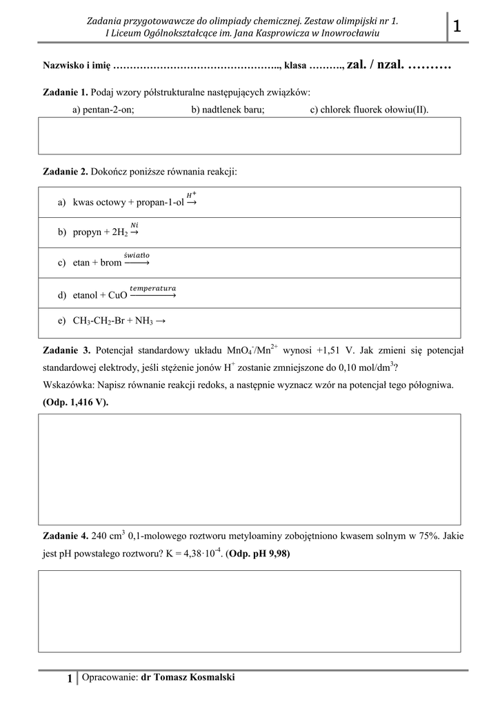 Zadania przygotowawcze do olimpiady chemicznej. Zestaw olimpijski nr 1. I Liceum Ogólnokształcące im. Jana Kasprowicza w Inowrocławiu Nazwisko i imię ………………………………………….., klasa ………., zal. 1 / nzal. ………. Zadanie 1. Podaj wzory półstrukturalne następujących związków: a) pentan-2-on; b) nadtlenek baru; c) chlorek fluorek ołowiu(II). Zadanie 2. Dokończ poniższe równania reakcji: a) kwas octowy + propan-1-ol b) propyn + 2H2 c) etan + brom d) etanol + CuO e) CH3-CH2-Br + NH3 → Zadanie 3. Potencjał standardowy układu MnO4-/Mn2+ wynosi +1,51 V. Jak zmieni się potencjał standardowej elektrody, jeśli stężenie jonów H+ zostanie zmniejszone do 0,10 mol/dm3? Wskazówka: Napisz równanie reakcji redoks, a następnie wyznacz wzór na potencjał tego półogniwa. (Odp. 1,416 V). Zadanie 4. 240 cm3 0,1-molowego roztworu metyloaminy zobojętniono kwasem solnym w 75%. Jakie jest pH powstałego roztworu? K = 4,38·10-4. (Odp. pH 9,98) 1 Opracowanie: dr Tomasz Kosmalski Zadania przygotowawcze do olimpiady chemicznej. Zestaw olimpijski nr 1. I Liceum Ogólnokształcące im. Jana Kasprowicza w Inowrocławiu 1 Zadanie 5. Reakcja między wodorem i jodem w fazie gazowej przebiega według równania: H2(g) + I2(g) → 2HI(g). Stężenie początkowe wodoru wynosiło 1,5 mol/dm3, a jodu 1,0 mol/dm3. Ile razy zmniejszy się szybkość tej reakcji po przereagowaniu połowy zawartości jodu w stosunku do szybkości początkowej? (Odp. 8 razy zmaleje) Zadanie 6. Próbkę roztworu H2O2 o masie 1,8000 g umieszczono w kolbie stożkowej i po zakwaszeniu miareczkowano roztworem KMnO4 o stężeniu 0,0200 mol/dm3 zużywając 31,5 cm3 tego roztworu. Oblicz stężenie procentowe H2O2 w próbce tego roztworu. Wskazówka: Napisz równanie reakcji redoks. (Odp. 2,98%) Zadanie 7. Zbilansuj poniższe równanie reakcji redoks: a) Cr2O72- + H2O2 + H+ → Cr3+ + H2O + O2 b) Hg + HNO3 → Hg(NO3)2 + NO + H2O Zadanie 8. Napisz równania reakcji zaznaczone w poniższym schemacie przemian: benzen → metylobenzen → kwas benzoesowy → benzoesan etylu → benzoesan sodu 2 Opracowanie: dr Tomasz Kosmalski