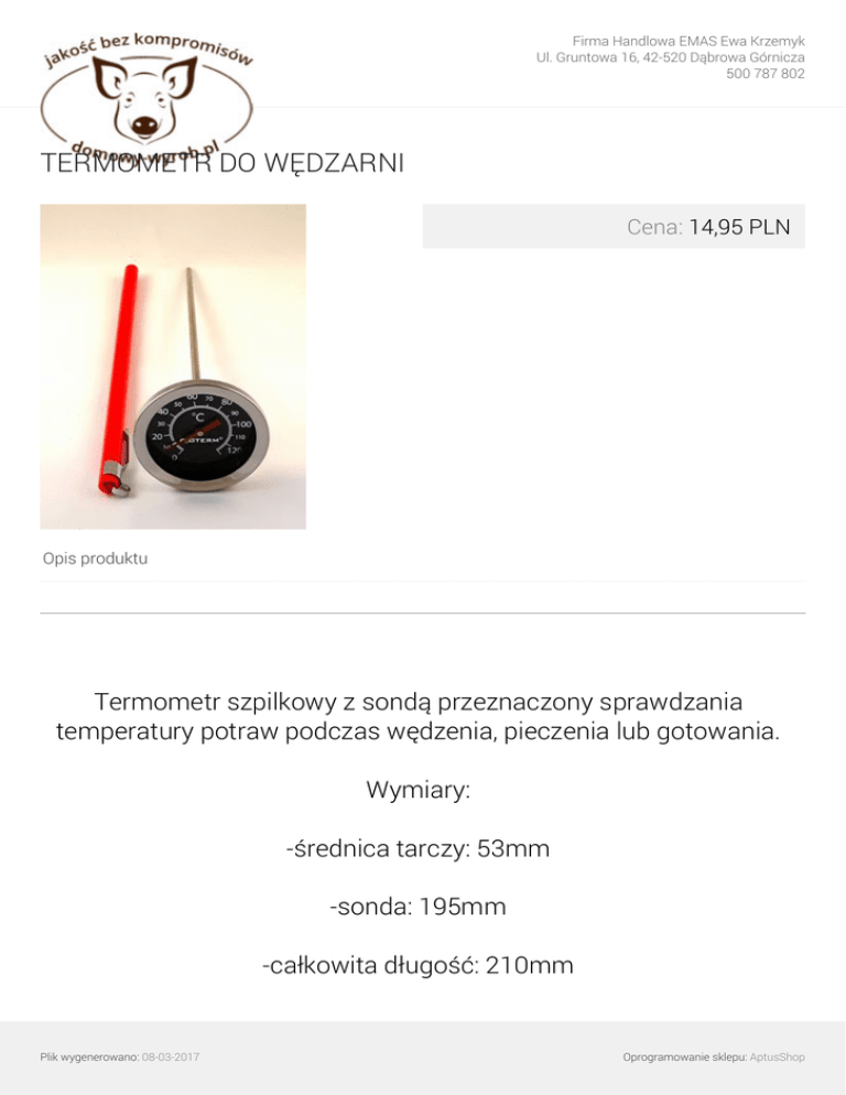 Firma Handlowa EMAS Ewa Krzemyk Ul. Gruntowa 16, 42-520 Dąbrowa Górnicza 500 787 802 TERMOMETR DO WĘDZARNI Cena: 14,95 PLN Opis produktu Termometr szpilkowy z sondą przeznaczony sprawdzania temperatury potraw podczas wędzenia, pieczenia lub gotowania. Wymiary: -średnica tarczy: 53mm -sonda: 195mm -całkowita długość: 210mm Plik wygenerowano: 08-03-2017 Oprogramowanie sklepu: AptusShop Firma Handlowa EMAS Ewa Krzemyk Ul. Gruntowa 16, 42-520 Dąbrowa Górnicza 500 787 802 Obudowa wykonana ze stali nierdzewnej. Zakres pomiaru temperatury od 0°C do 120°C +/- 2°C Plik wygenerowano: 08-03-2017 Powered by TCPDF (www.tcpdf.org) Oprogramowanie sklepu: AptusShop