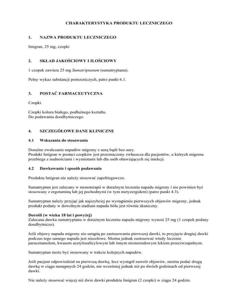 CHARAKTERYSTYKA PRODUKTU LECZNICZEGO 1. NAZWA PRODUKTU LECZNICZEGO Imigran, 25 mg, czopki 2. SKŁAD JAKOŚCIOWY I ILOŚCIOWY 1 czopek zawiera 25 mg Sumatriptanum (sumatryptanu). Pełny wykaz substancji pomocniczych, patrz punkt 6.1. 3. POSTAĆ FARMACEUTYCZNA Czopki. Czopki koloru białego, podłużnego kształtu. Do podawania doodbytniczego. 4. SZCZEGÓŁOWE DANE KLINICZNE 4.1 Wskazania do stosowania Doraźne zwalczanie napadów migreny z aurą bądź bez aury. Produkt Imigran w postaci czopków jest przeznaczony zwłaszcza dla pacjentów, u których migrena przebiega z nudnościami i wymiotami lub dla osób obawiających się iniekcji. 4.2 Dawkowanie i sposób podawania Produktu Imigran nie należy stosować zapobiegawczo. Sumatryptan jest zalecany w monoterapii w doraźnym leczeniu napadu migreny i nie powinien być stosowany z ergotaminą lub jej pochodnymi (w tym metyzergidem) (patrz punkt 4.3). Sumatryptan należy przyjąć jak najszybciej po wystąpieniu pierwszych objawów migreny, jednak produkt podany w dowolnym stadium napadu bólu jest równie skuteczny. Dorośli (w wieku 18 lat i powyżej) Zalecana dawka sumatryptanu w doraźnym leczeniu napadu migreny wynosi 25 mg (1 czopek podany doodbytniczo). Jeśli objawy napadu migreny nie ustąpią po zastosowaniu pierwszej dawki, to przyjęcie drugiej dawki podczas tego samego napadu jest niecelowe. Można jednak zastosować wtedy leczenie paracetamolem, kwasem acetylosalicylowym lub innym niesteroidowym lekiem przeciwzapalnym. Sumatryptan może być stosowany w trakcie kolejnych napadów. Jeśli pacjent odpowiedział na pierwszą dawkę, lecz wystąpił nawrót objawów, można podać drugą dawkę w ciągu następnych 24 godzin, nie wcześniej jednak niż po dwóch godzinach od pierwszej dawki. Nie należy stosować więcej niż dwie dawki produktu Imigran (2 czopki) w ciągu 24 godzin. -2- Dzieci i młodzież (poniżej 18 lat) Sumatryptan w postaci czopków nie jest zalecany do stosowania u dzieci i młodzieży, ponieważ nie był badany w tej grypie wiekowej. Osoby w podeszłym wieku (powyżej 65 lat) Bezpieczeństwo i skuteczność stosowania sumatryptanu w postaci czopków u pacjentów w podeszłym wieku nie zostały określone. 4.3 Przeciwwskazania Nadwrażliwość na sumatryptan lub którąkolwiek substancję pomocniczą. Sumatryptanu nie należy stosować u pacjentów po przebytym zawale mięśnia sercowego lub z chorobą niedokrwienną serca, dławicą Prinzmetala, chorobą naczyń obwodowych lub objawami przedmiotowymi i podmiotowymi wskazującymi na chorobę niedokrwienną serca. Sumatryptanu nie należy stosować u pacjentów z udarem mózgu lub przemijającym mózgowym napadem niedokrwiennym w wywiadzie. Nie stosować u pacjentów z ciężkimi zaburzeniami czynności wątroby. Stosowanie sumatryptanu u pacjentów z umiarkowanym i ciężkim nadciśnieniem tętniczym oraz z łagodnym niekontrolowanym nadciśnieniem tętniczym jest przeciwwskazane. Jednoczesne stosowanie sumatryptanu i ergotaminy lub jej pochodnych (w tym metyzergidu) lub jakiegokolwiek leku z grupy tryptanów lub innych agonistów receptora 5-HT1 jest przeciwwskazane (patrz punkt 4.5). Stosowanie sumatryptanu jednocześnie z inhibitorami monoaminooksydazy (MAO) jest przeciwwskazane. Sumatryptanu nie wolno stosować przez dwa tygodnie od zaprzestania stosowania inhibitorów monoaminooksydazy. 4.4 Specjalne ostrzeżenia i środki ostrożności dotyczące stosowania Imigran może być stosowany wyłącznie u pacjentów z prawidłowo rozpoznaną migreną. Imigran nie jest wskazany do stosowania u pacjentów z migreną hemiplegiczną, podstawną lub okoporaźną. U pacjentów z bólem głowy typu migrenowego, u których wcześniej nie rozpoznawano migreny należy brać pod uwagę inną przyczynę dolegliwości. Podobna uwaga dotyczy pacjentów z uprzednio rozpoznaną migreną, ale z nietypowym obrazem danego napadu bólu głowy. Należy pamiętać, że pacjenci, u których występuje migrena mogą należeć do osób z grupy ryzyka wystąpienia naczyniopochodnego uszkodzenia mózgu, jak np. przemijający mózgowy napad niedokrwienny czy udar mózgu. Po podaniu sumatryptanu może występować przemijający ból oraz uczucie ucisku w klatce piersiowej i gardle, czasami o znacznym nasileniu (patrz punkt 4.8). Jeżeli objawy te mogą sugerować chorobę niedokrwienną serca, zaleca się zaprzestanie podawania sumatryptanu i wykonanie odpowiednich badań. Podczas jednoczesnego stosowania sumatryptanu i selektywnych inhibitorów wychwytu zwrotnego serotoniny (SSRI) rzadko zgłaszano wystąpienie zespołu serotoninowego (obejmującego zmiany stanu psychicznego, zaburzenia wegetatywne i zaburzenia nerwowo-mięśniowe). Wystąpienie zespołu -3- serotoninowego zgłaszano również podczas jednoczesnego stosowania leków z grupy tryptanów oraz inhibitorów wychwytu zwrotnego serotoniny i noradrenaliny (SNRI). Jeżeli równoczesne leczenie sumatryptanem i lekiem z grupy SSRI lub SNRI jest klinicznie uzasadnione, zaleca się odpowiednią obserwację pacjenta (patrz punkt 4.5). Sumatryptan należy stosować z ostrożnością u pacjentów ze schorzeniami mogącymi w istotny sposób oddziaływać na wchłanianie, metabolizm lub wydalanie leku, np. z zaburzeniami czynności wątroby lub nerek. Sumatryptan należy stosować z ostrożnością u pacjentów z napadami drgawek w wywiadzie lub z innymi czynnikami ryzyka obniżającymi próg drgawkowy, ponieważ zgłaszano występowanie drgawek związane z podaniem sumatryptanu (patrz punkt 4.8). U pacjentów ze stwierdzoną nadwrażliwością na sulfonamidy po podaniu sumatryptanu mogą wystąpić reakcje alergiczne o różnym nasileniu, od zmian skórnych do wstrząsu anafilaktycznego. Dane dotyczące występowania nadwrażliwości krzyżowej są ograniczone, jednak sumatryptanu należy stosować z ostrożnością w tej grupie pacjentów. Podczas jednoczesnego stosowania sumatryptanu i produktów zawierających ziele dziurawca (Hyp