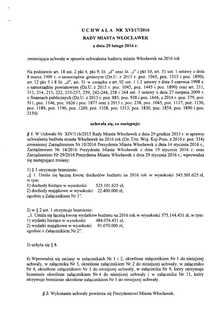 uchwalenia budZetu miasta Wloclawek na 2016 rok (Dz. Urz. Woj. Kuj-Pom. 22016 r. poz.334)