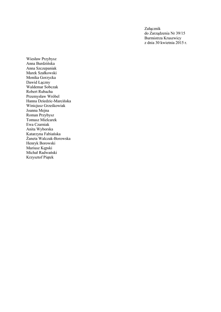 Załącznik do Zarządzenia Nr 39/15 Burmistrza Kruszwicy z dnia 30 kwietnia 2015 r. Wiesław Przybysz Anna Burdzińska Anna Szczepaniak Marek Szałkowski Monika Gorzycka Dawid Łączny Waldemar Sobczak Robert Rubacha Przemysław Wróbel Hanna Dziedzic-Marcińska Winicjusz Grześkowiak Joanna Mejna Roman Przybysz Tomasz Mielcarek Ewa Czarniak Anita Wyborska Katarzyna Fabiańska Żaneta Walczak-Borowska Henryk Borowski Mariusz Kępski Michał Radwański Krzysztof Piątek
